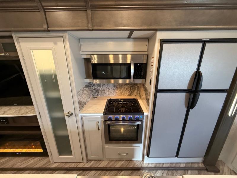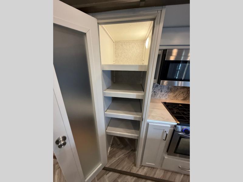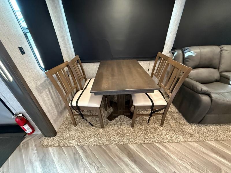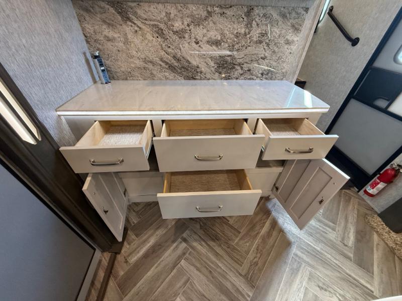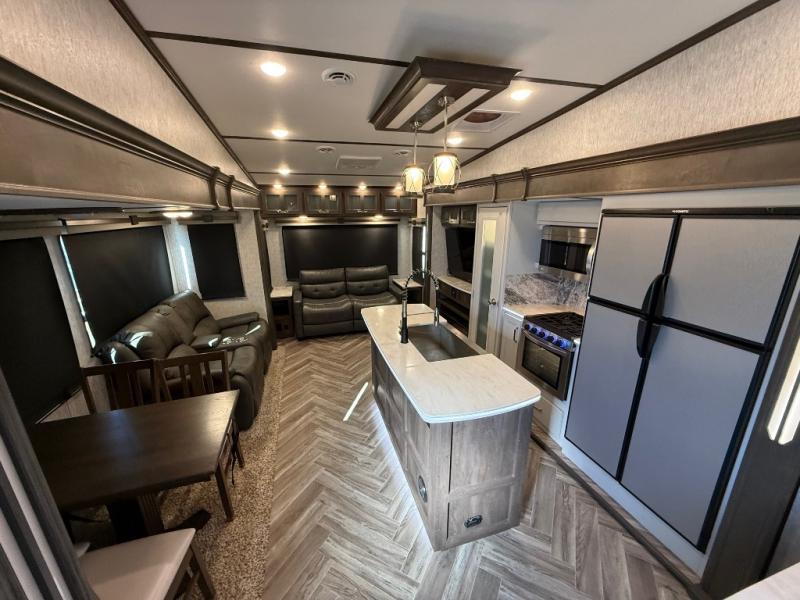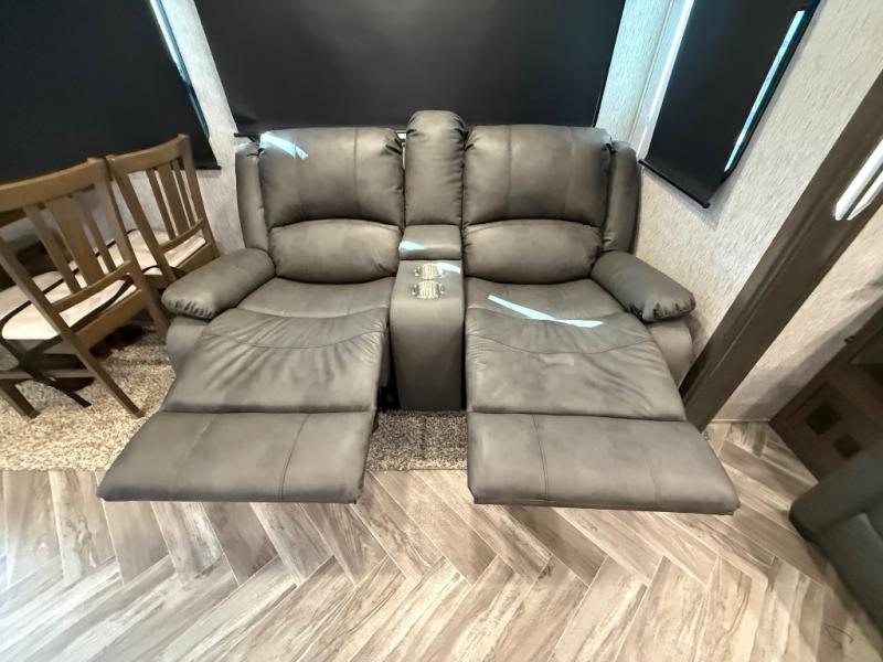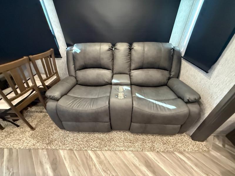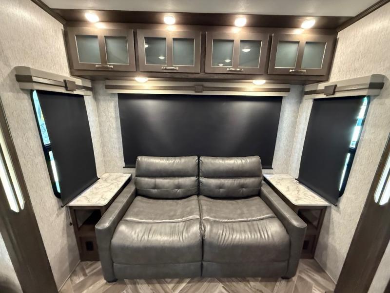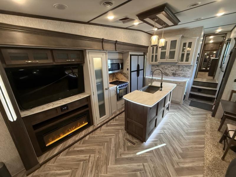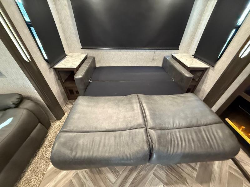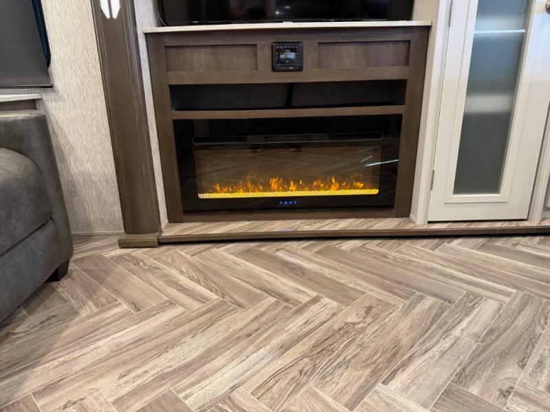 Whether you travel with your spouse or your family to state parks or RV resorts, this fifth wheel offers enough space and comfort! Enjoy the cozy 40" glass fireplace during chilly months, and the 50" LED TV on rainy days. The dual opposing slides in the rear living/kitchen area open up the whole space, and the kitchen island with solid surface countertop makes it feel more like home. You'll appreciate all the storage space you have, including a pantry and a 12 cu. ft. refrigerator for all your food for the week. This unit features a front private bedroom with a king-size bed slide and a large front wardrobe.