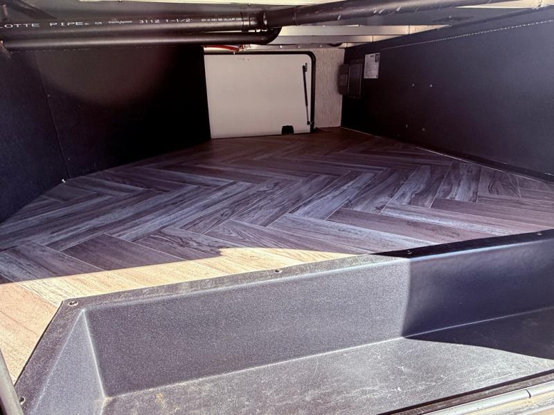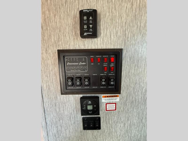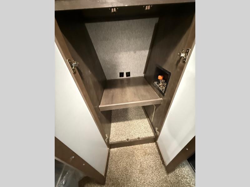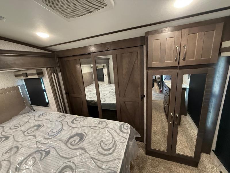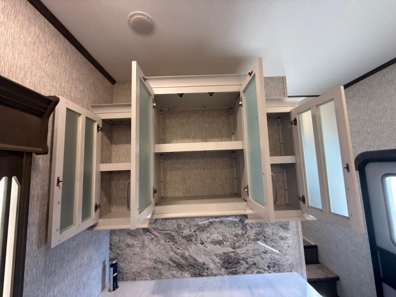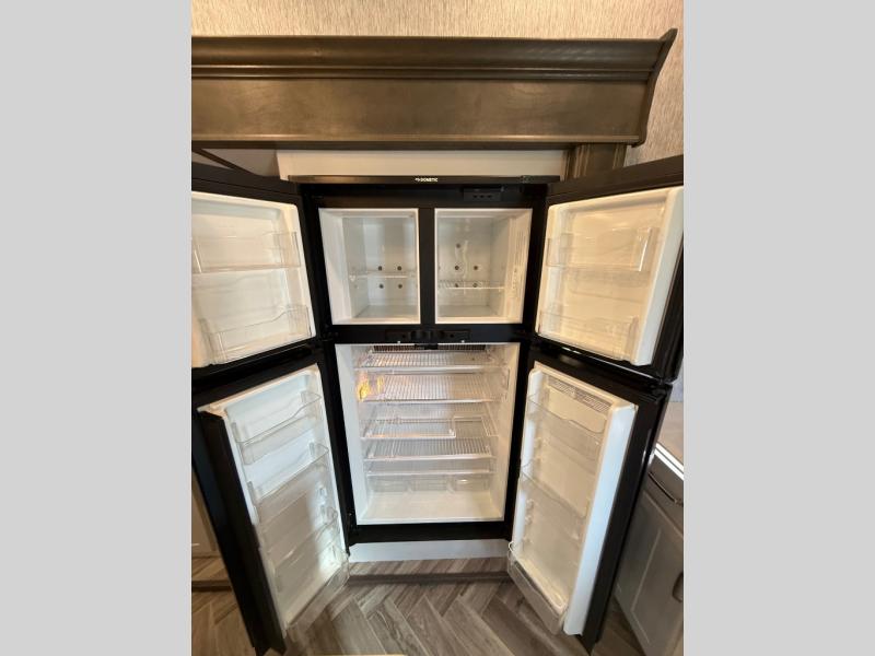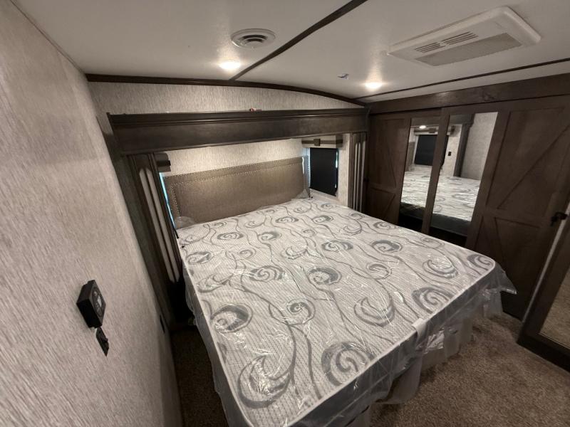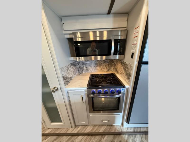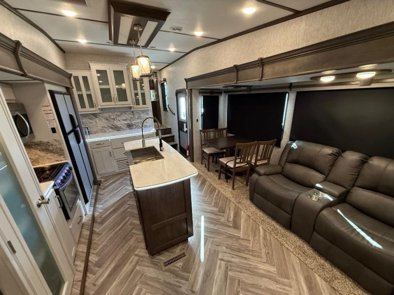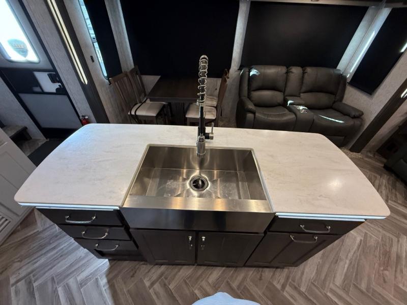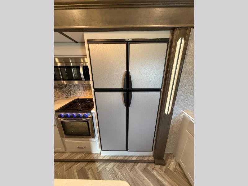 Whether you travel with your spouse or your family to state parks or RV resorts, this fifth wheel offers enough space and comfort! Enjoy the cozy 40" glass fireplace during chilly months, and the 50" LED TV on rainy days. The dual opposing slides in the rear living/kitchen area open up the whole space, and the kitchen island with solid surface countertop makes it feel more like home. You'll appreciate all the storage space you have, including a pantry and a 12 cu. ft. refrigerator for all your food for the week. This unit features a front private bedroom with a king-size bed slide and a large front wardrobe.