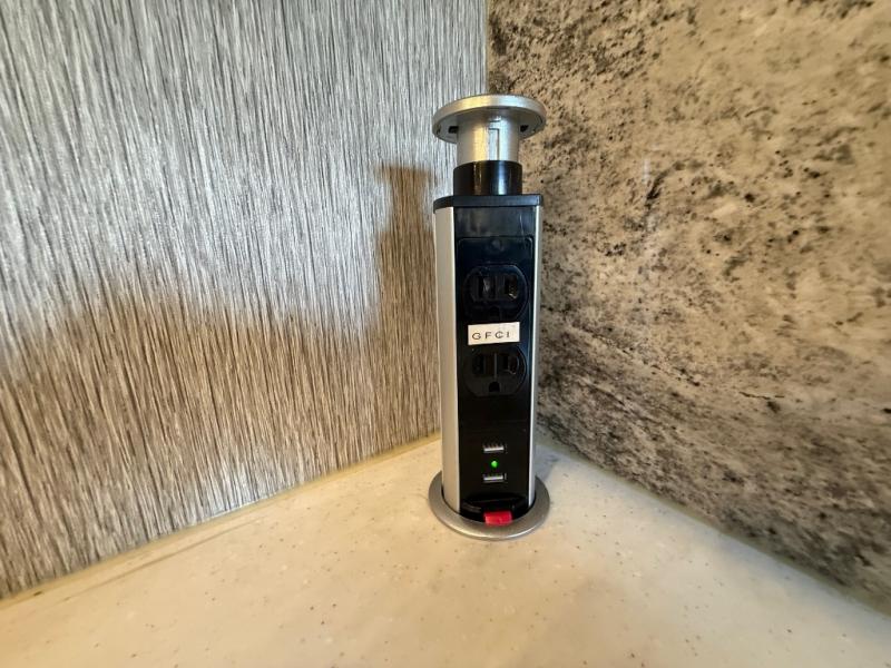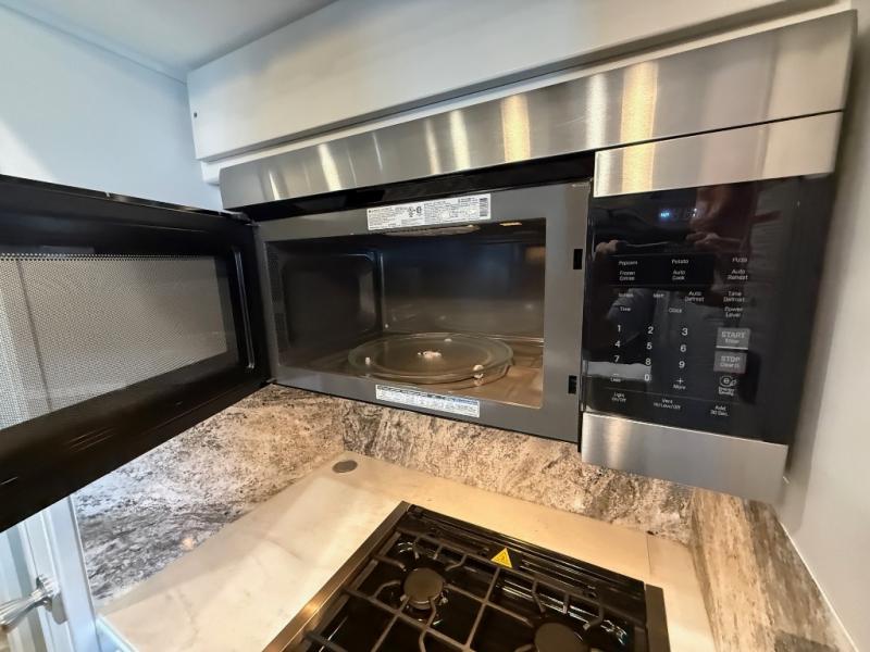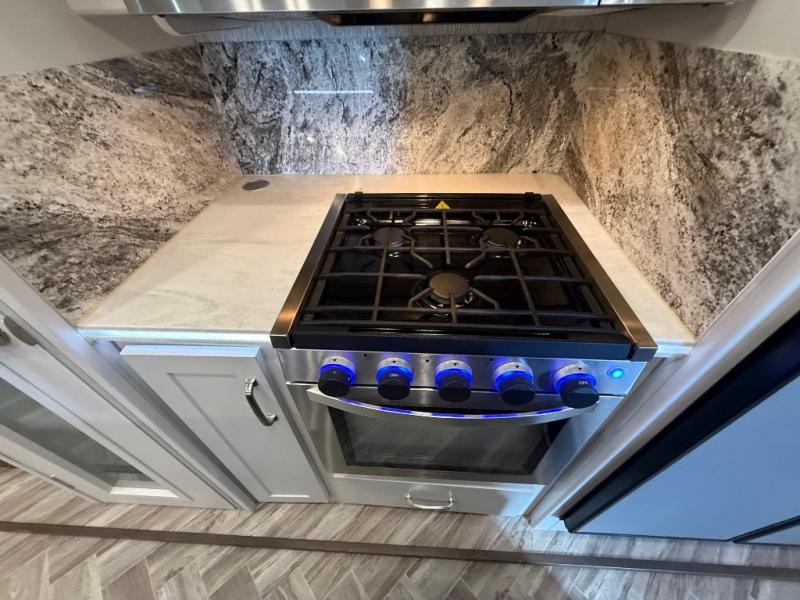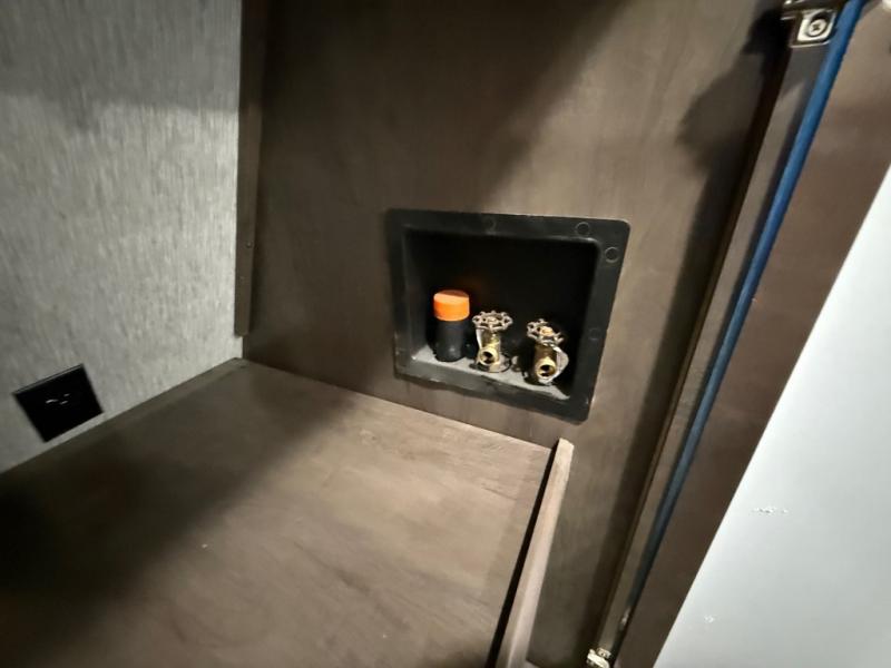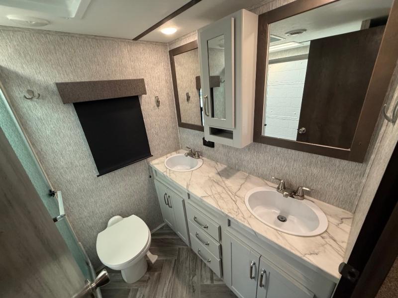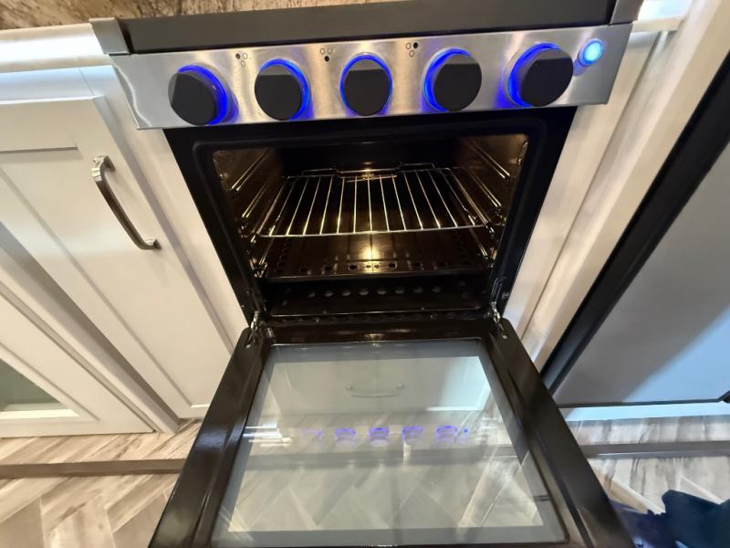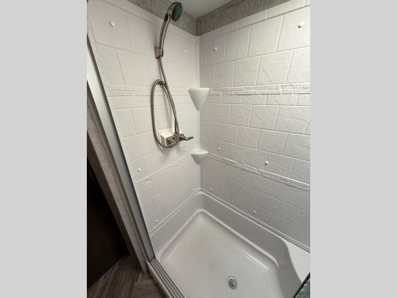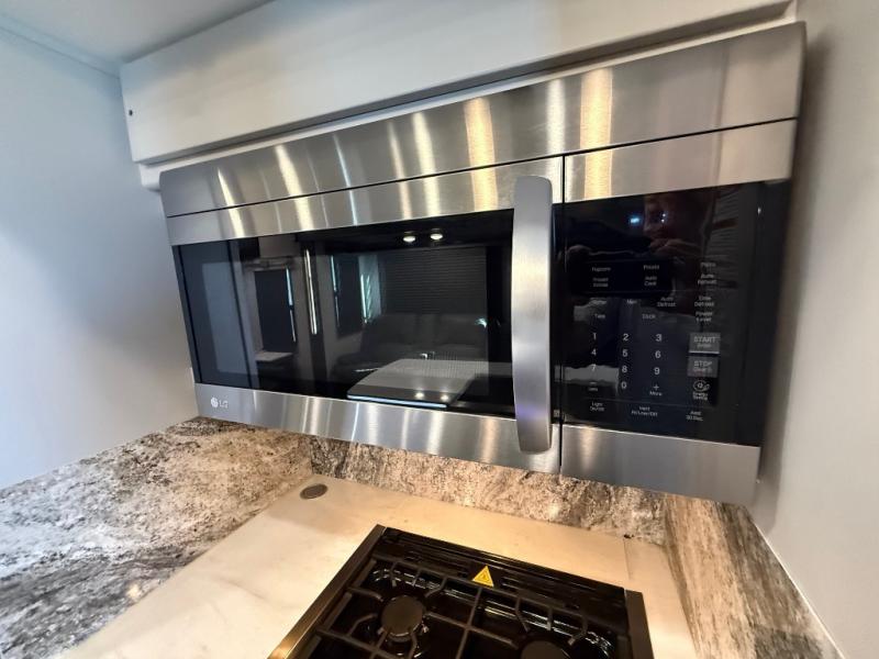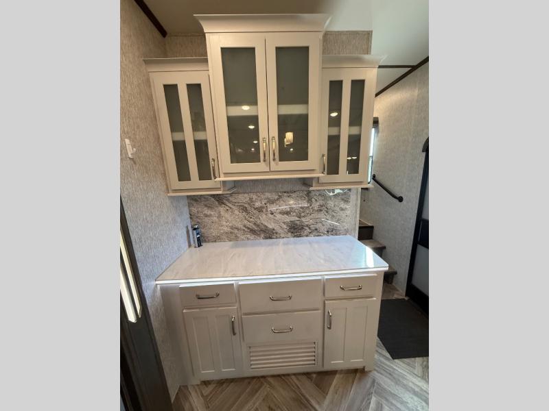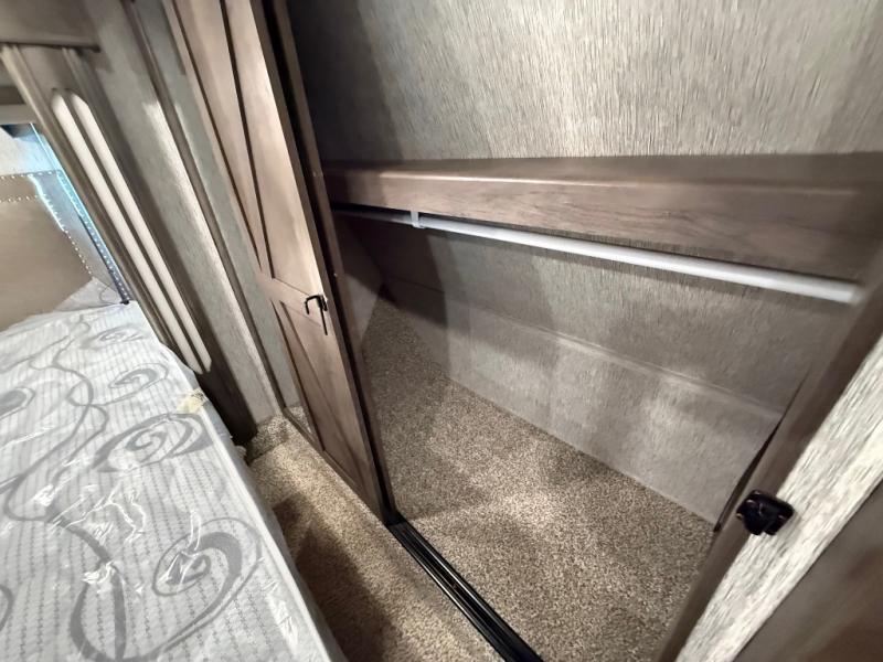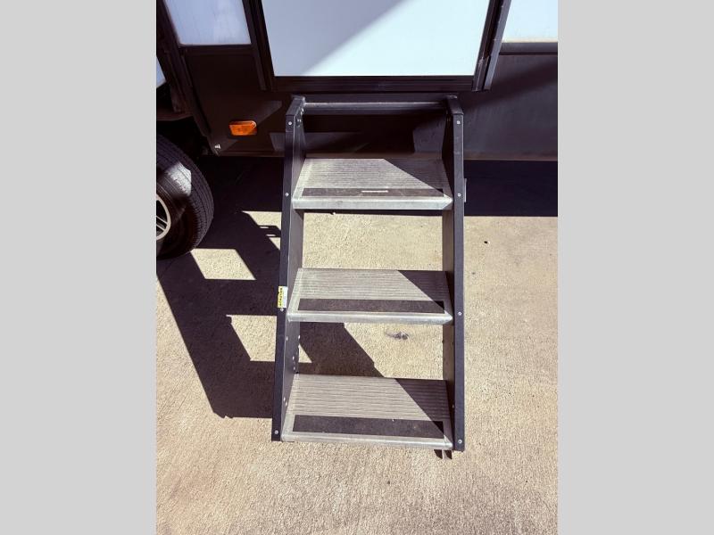 Whether you travel with your spouse or your family to state parks or RV resorts, this fifth wheel offers enough space and comfort! Enjoy the cozy 40" glass fireplace during chilly months, and the 50" LED TV on rainy days. The dual opposing slides in the rear living/kitchen area open up the whole space, and the kitchen island with solid surface countertop makes it feel more like home. You'll appreciate all the storage space you have, including a pantry and a 12 cu. ft. refrigerator for all your food for the week. This unit features a front private bedroom with a king-size bed slide and a large front wardrobe.