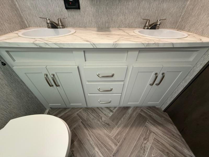 With any Astoria fifth wheel, you'll get the Dutchmen construction advantage with features such as HyperDeck floor construction which includes linoleum flooring, a steel powder coated main frame, and a fully enclosed underbelly, plus a painted fiberglass cap with LED lights. Some standard features that will impress you include the patio and hitch lights, USB ports to keep all the electronics charged, dual 30 lb. propane tanks, automatic leveling system, dark-tinted safety glass windows, and stainless steel appliances so you can keep your bellies full with home cooked meals. Choose your favorite today!