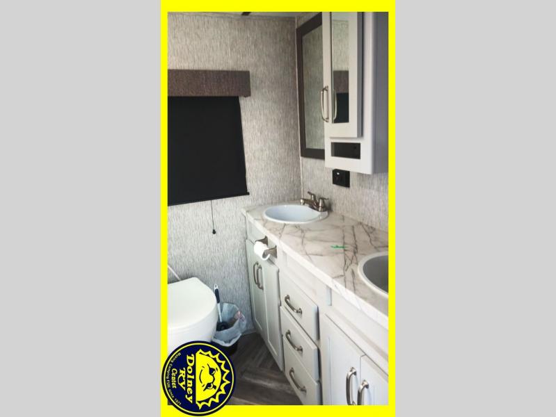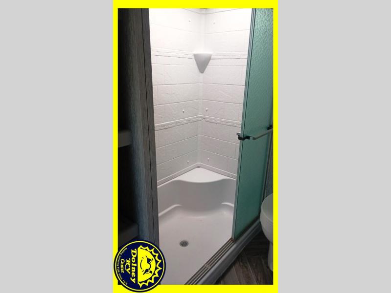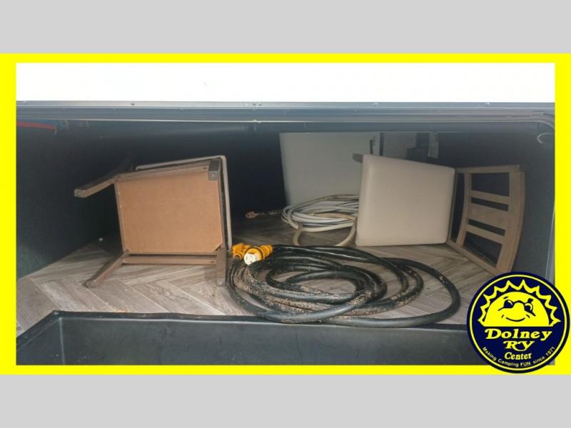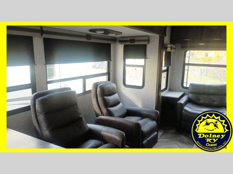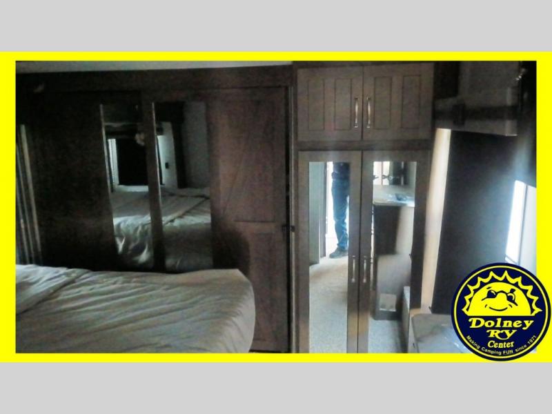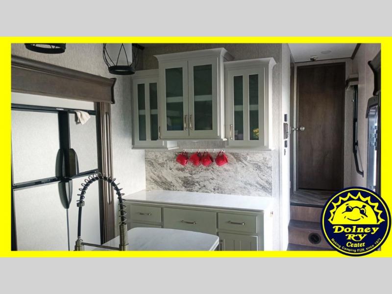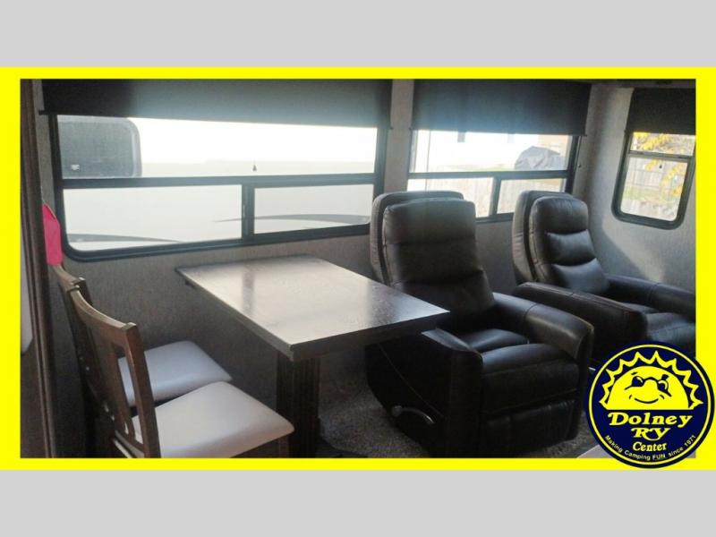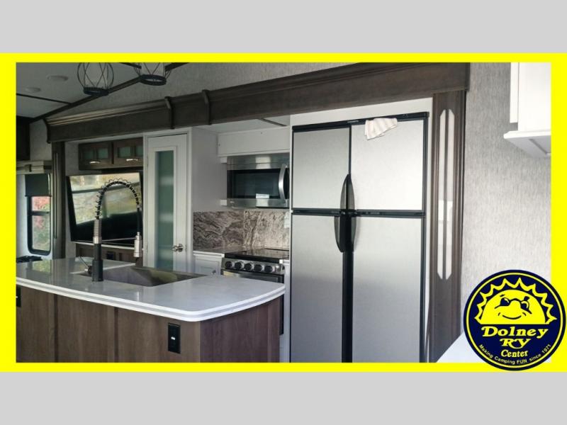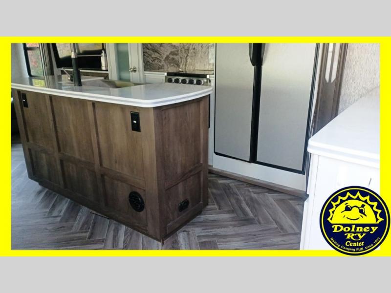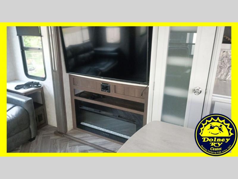 Whether you travel with your spouse or your family to state parks or RV resorts, this fifth wheel offers enough space and comfort! Enjoy the cozy 40" glass fireplace during chilly months, and the 50" LED TV on rainy days. The dual opposing slides in the rear living/kitchen area open up the whole space, and the kitchen island with solid surface countertop makes it feel more like home. You'll appreciate all the storage space you have, including a pantry and a 12 cu. ft. refrigerator for all your food for the week. This unit features a front private bedroom with a king-size bed slide and a large front wardrobe.