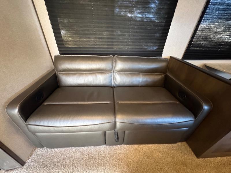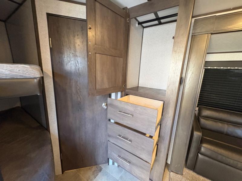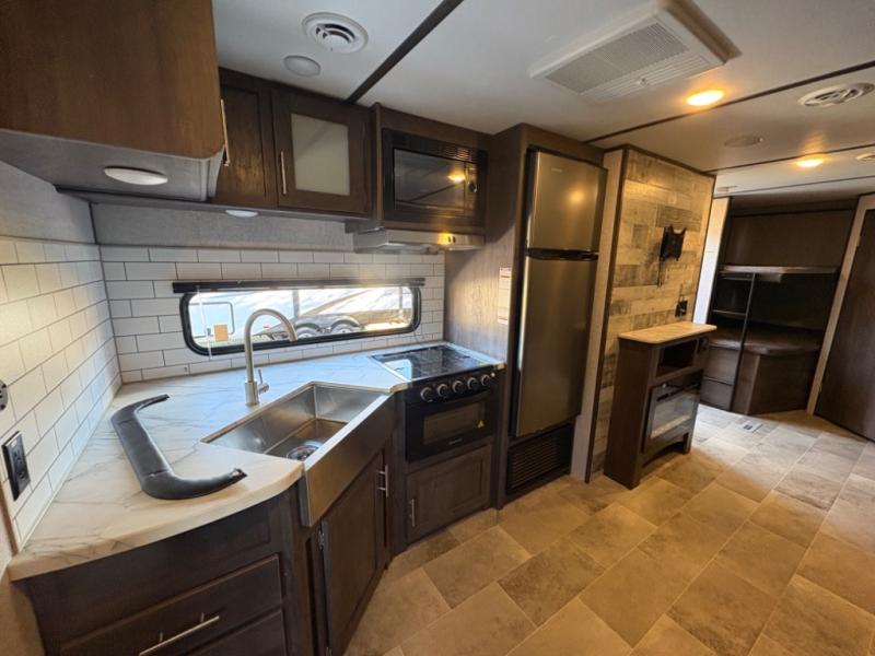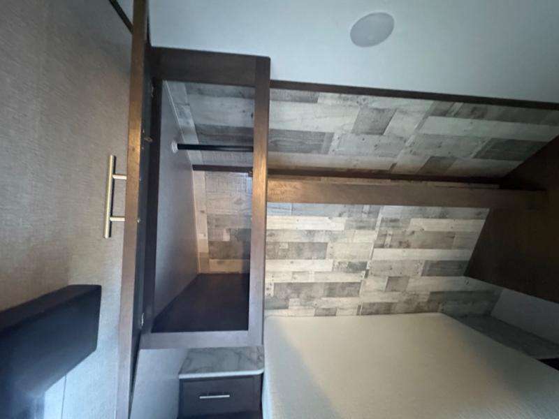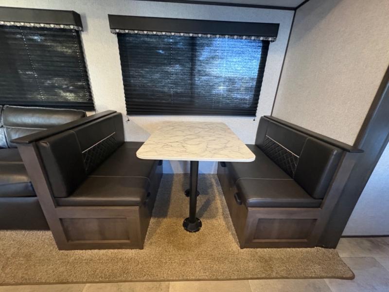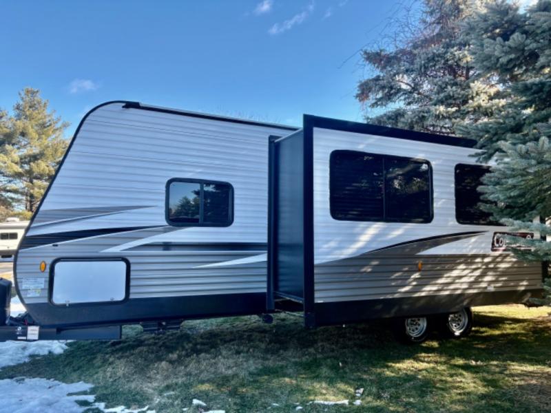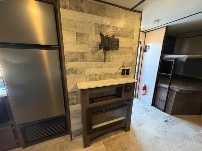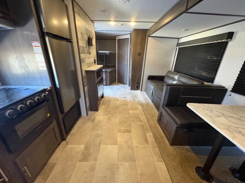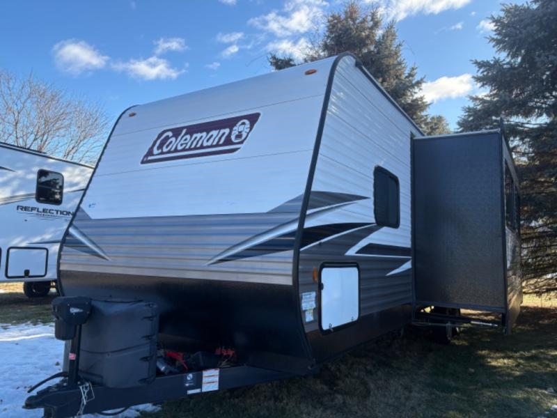 Looking to upgrade the tent to a travel trailer with sleeping space for eight or maybe nine? This Coleman Lantern Series travel trailer will complete your checklist! From having your own private bedroom with the second exterior entry door and USB outlet to the kids having double-size bunk beds and their own USB outlet, this model just makes sense. If you let the kids invite friends, they can sleep on the sofa and booth dinette within the single slide in the living room and store their stuff in the entry closet. The chef can even choose to make meals inside with full amenities, or outside at the outdoor kitchen.