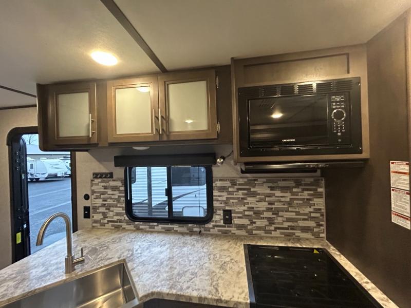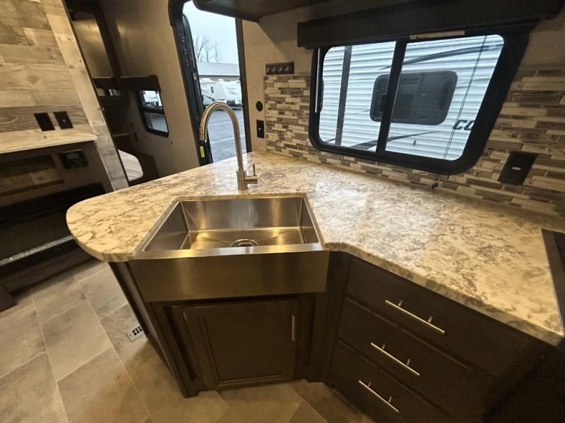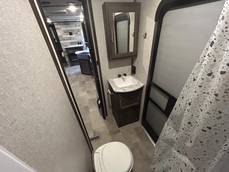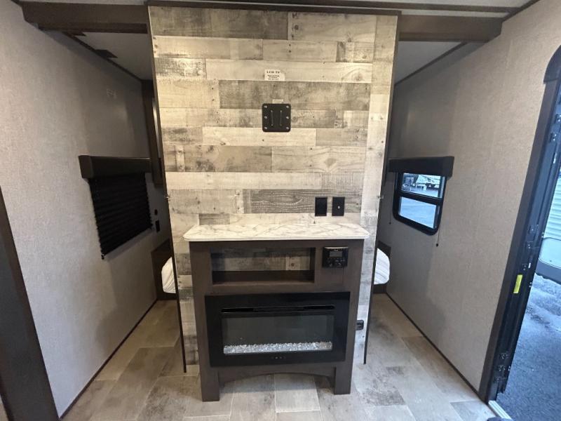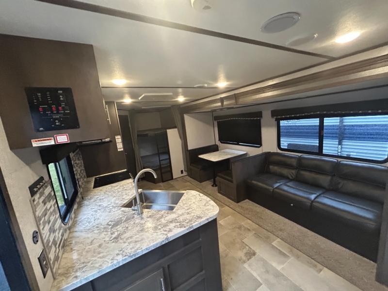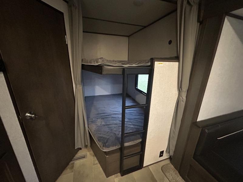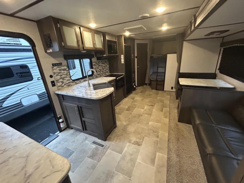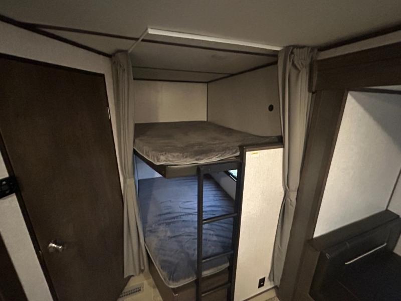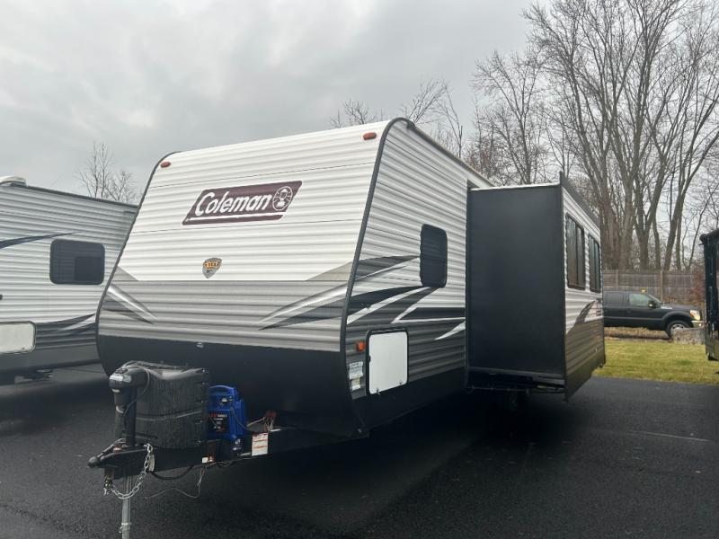 This Coleman Lantern Series travel trailer will provide you and your family with comfort and convenience while you enjoy the great outdoors. You might even meet other RV owners to camp with as well. From having your own private bedroom with wardrobe space and USB power outlet to your kids having double-size bunks, you will not be missing home at all. The cook can make meals while the others take turns getting ready in the full bathroom, and the second exterior entry door into the bathroom is a huge convenience for many reasons. Make this model yours today!