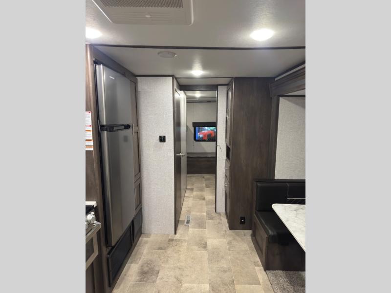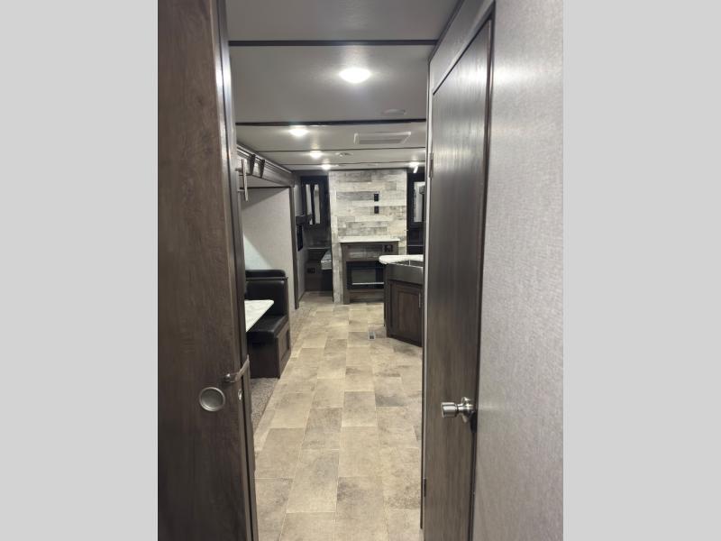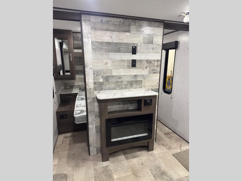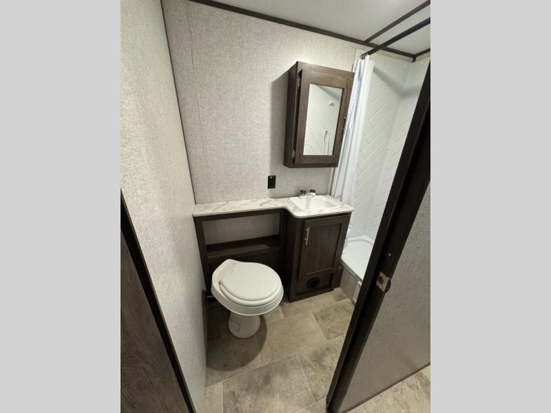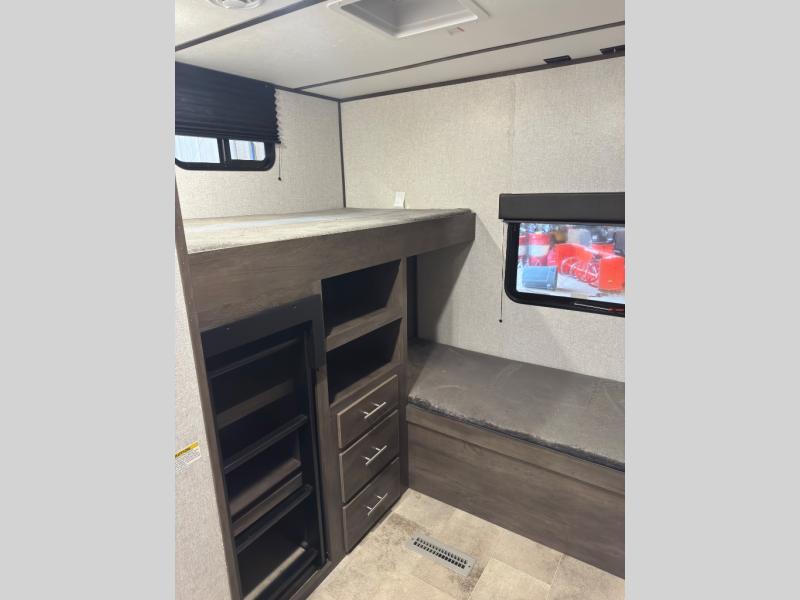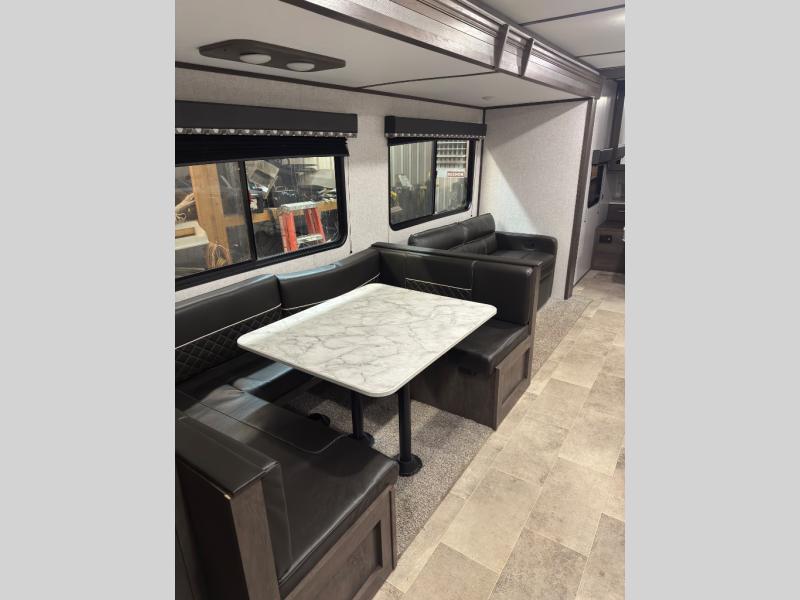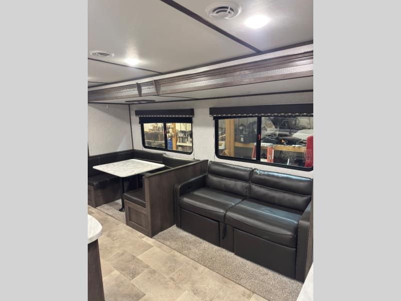 This Coleman Lantern Series travel trailer has plenty of available sleeping spaces all throughout so that you can sleep ten to eleven people during any adventure! The rear private bunkhouse is hugely accommodating with its four bunk beds, wardrobe/entertainment center, trundle bed, and single slide. Plus, it is directly connected to the full bathroom so that your kids can quickly and easily go in the middle of the night. Since the bathroom has a second exterior entry/exit door you will be able to also quickly get to the bathroom while you are cooking at the outdoor kitchen or playing games at your campsite. There is also a large slide that contains a sofa and U-shaped dinette in the main living area so that you can relax freely at night.