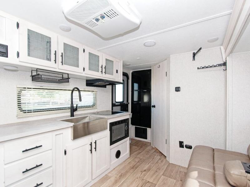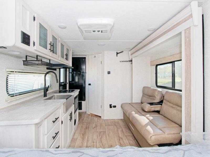 The kitchen is fully equipped with a 2-burner cooktop, microwave, and a 10 cu. ft. refrigerator, making it easy to prepare meals on the go. Ample interior storage and pass-through exterior compartments ensure you have room for all your gear.
