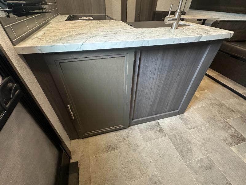 Outdoor living features like the kitchen and awning enhance camping experience.