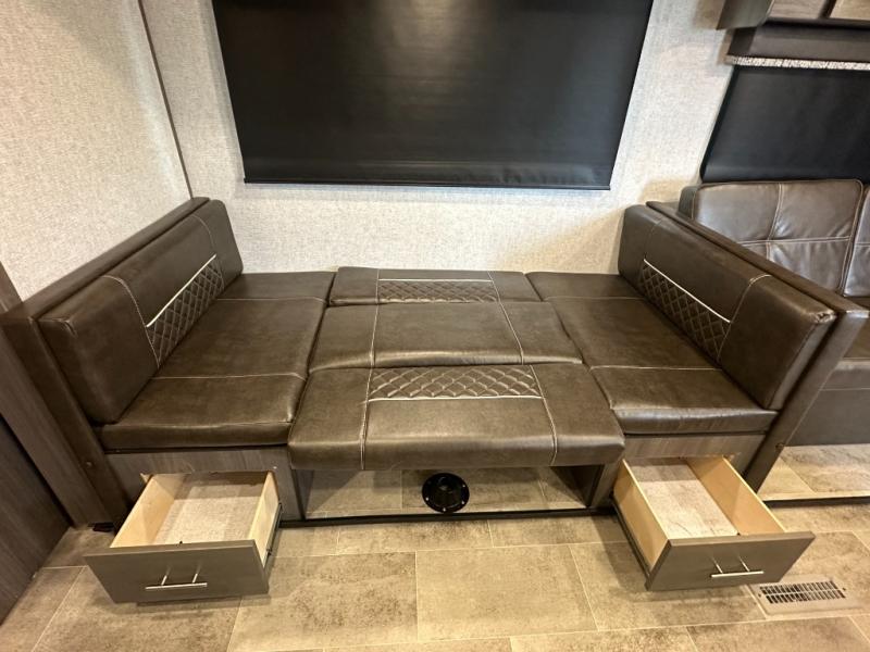 U-shaped dinette and jackknife sofa inside the slide-out for lounging and meals.
