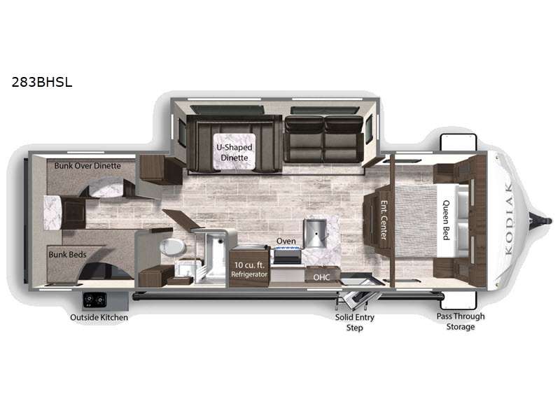 - The 283BHSL is a family-friendly, lightweight travel trailer featuring a single slide-out with bunkhouse, a front private bedroom, and a central living/dining area. It comfortably sleeps up to 9–11 people, depending on configuration—ideal for families or large groups