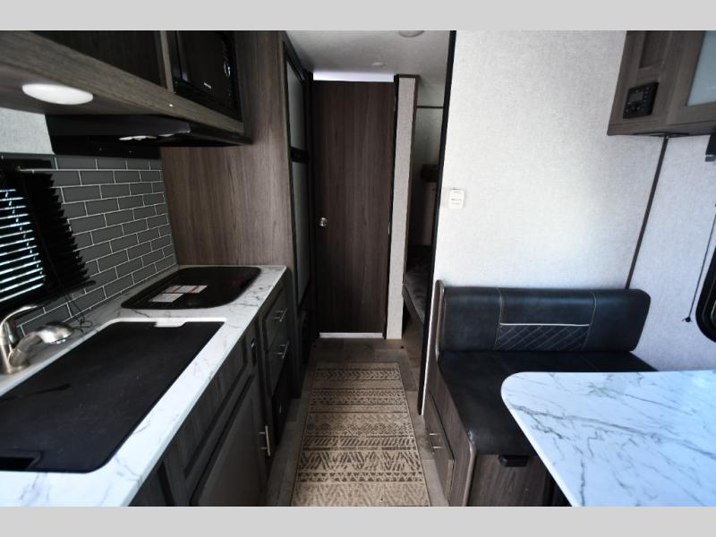 There is sure to be a Dutchmen Kodiak Cub travel trailer that will suit your needs! These trailers are light enough to be towed by most SUVs and minivans, and they come with premium features like hybrid aluminum steps, a 13,500 BTU air conditioner, a fully enclosed and heated underbelly, and preparations for solar panels. The exterior has a front diamond plate protection for extra sturdiness, and the power awning with LED lights can be used whenever you need some extra protection from the sun or rain. There are stainless steel appliances on the interior for a modern look, and the walnut cabinet doors and subway tile backsplash accent the one-piece seamless countertops very nicely.