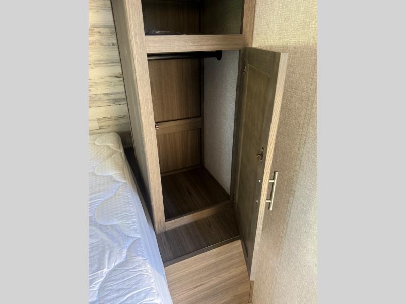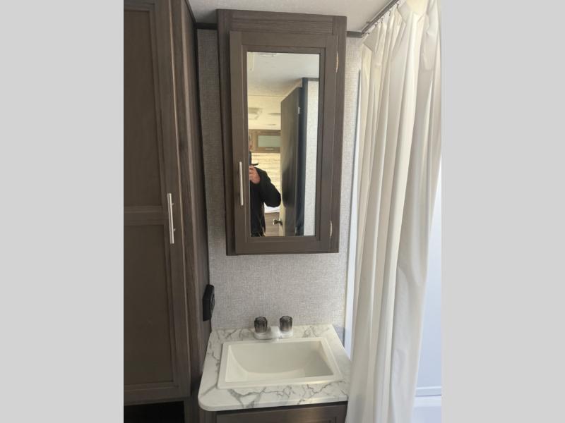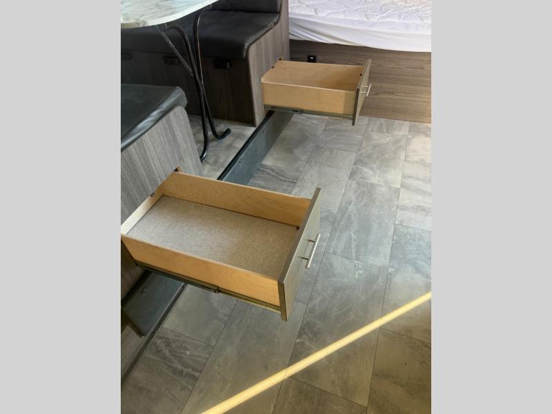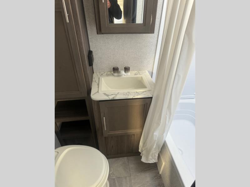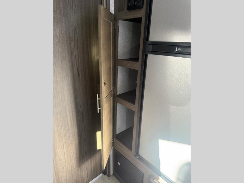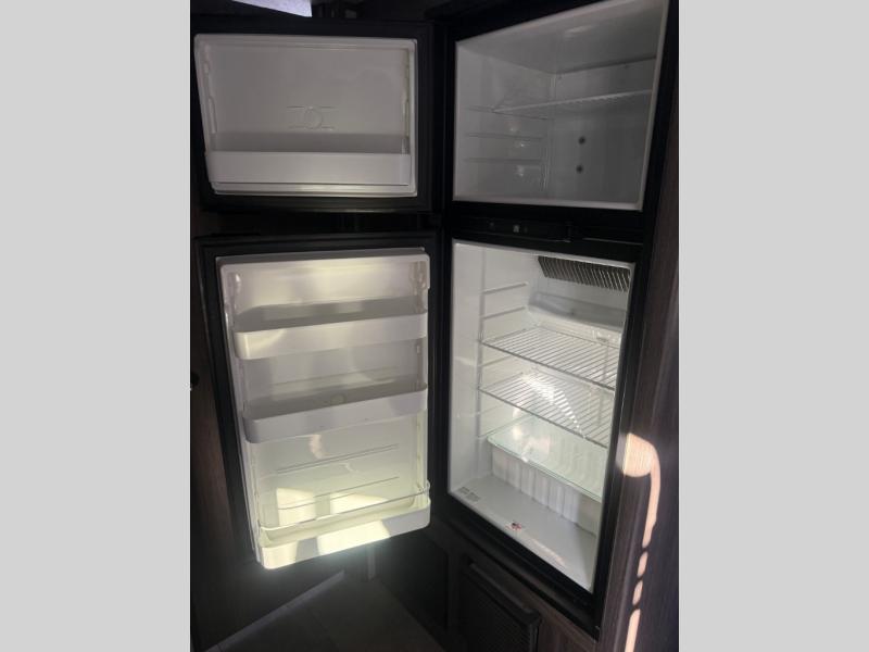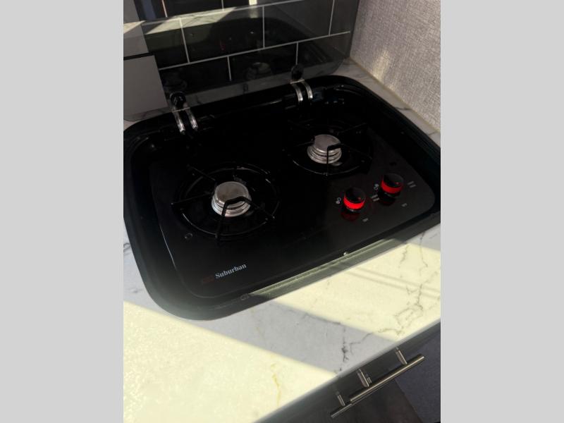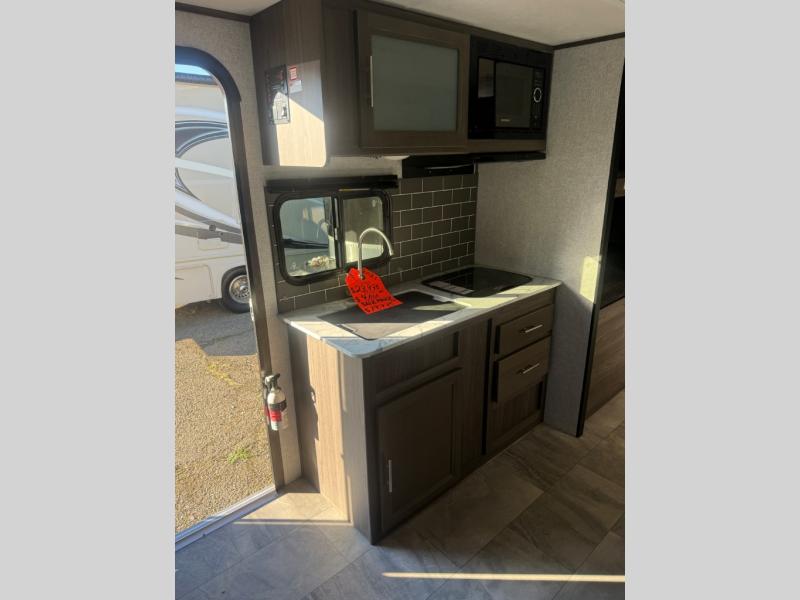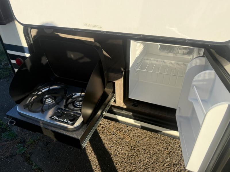 There is sure to be a Dutchmen Kodiak Cub travel trailer that will suit your needs! These trailers are light enough to be towed by most SUVs and minivans, and they come with premium features like hybrid aluminum steps, a 13,500 BTU air conditioner, a fully enclosed and heated underbelly, and preparations for solar panels. The exterior has a front diamond plate protection for extra sturdiness, and the power awning with LED lights can be used whenever you need some extra protection from the sun or rain. There are stainless steel appliances on the interior for a modern look, and the walnut cabinet doors and subway tile backsplash accent the one-piece seamless countertops very nicely.