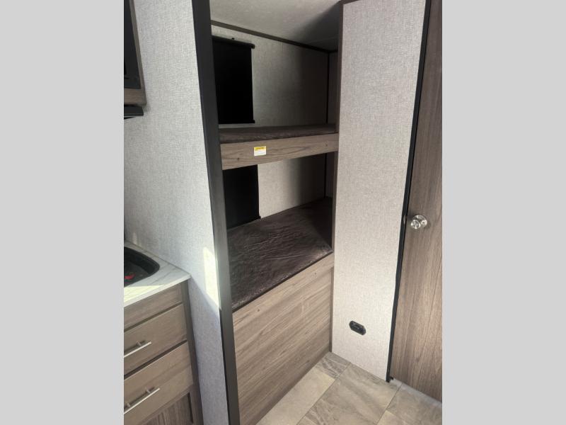 When the lake is calling your name, you need this Kodiak Cub travel trailer in tow! The front bed will be perfect for you and your spouse, and the kids will love climbing into the bunk beds at night. There is also a booth dinette within the slide out for an additional guest or two small children to sleep on. Prepare all your meals indoors on the two-burner range or use the outdoor kitchen if you're wanting some fresh air. The rear corner bath is tucked away for extra privacy, and you'll find plenty of storage inside as well as outside in the pass-through compartment!