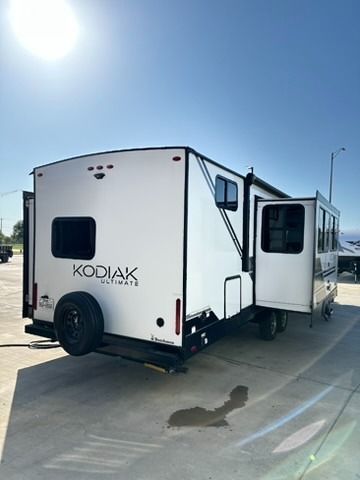 Each Kodiak Ultimate travel trailer by Dutchmen is constructed with a laminated crowned roof, a gel coat high gloss fiberglass exterior, and diamond plate front rock guard to protect your RV from rock and debris on the way to the campground. The hybrid aluminum entry steps are not only dependably, but they collapse and expand quickly so you can get on the road in no-time! These models feature HyperDeck flooring that includes fiberglass reinforced polypropolene and a fully enclosed underbelly, and the Bear Cave storage allows you to bring along all of your hiking and fishing gear. Some of the other interior features you are sure to love are the kitchen and bath skylights, the oversized dinette windows, night shades throughout, and more. Your next adventure starts with a Kodiak Ultimate travel trailer!