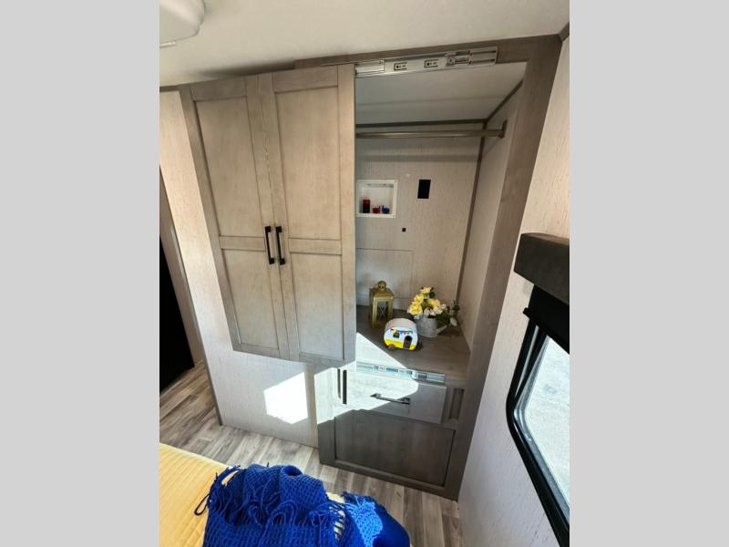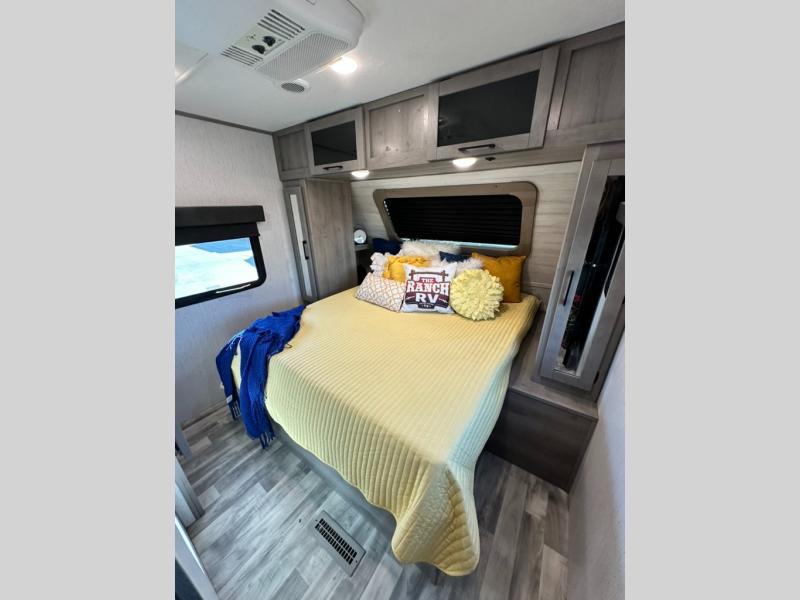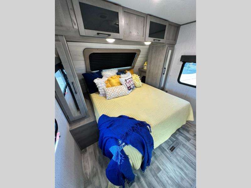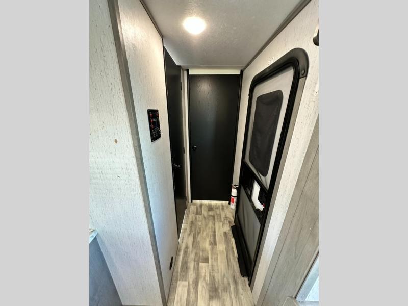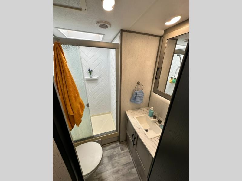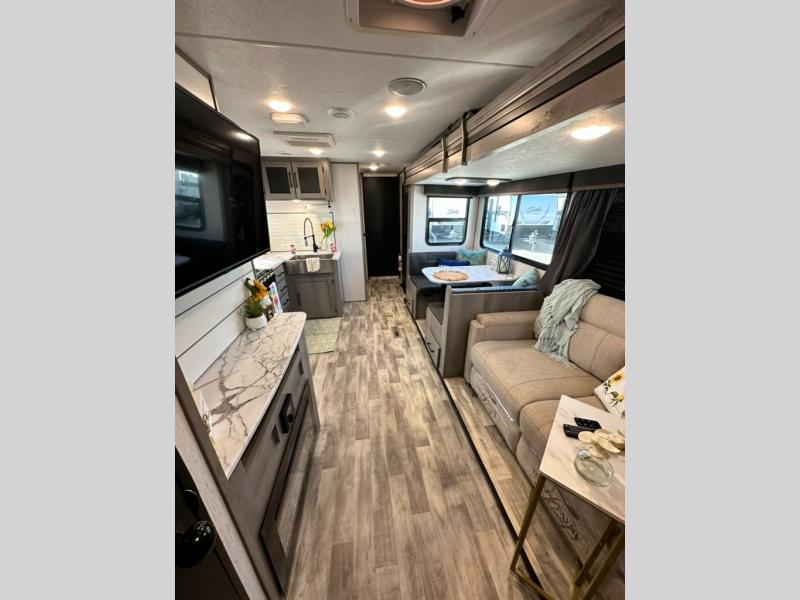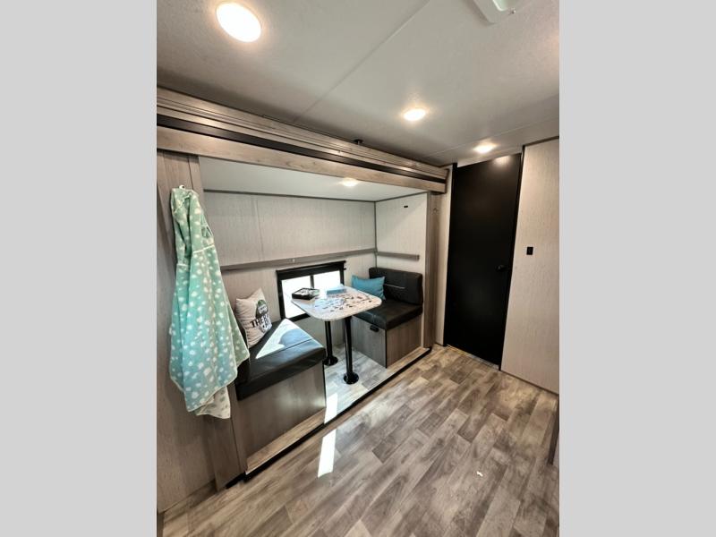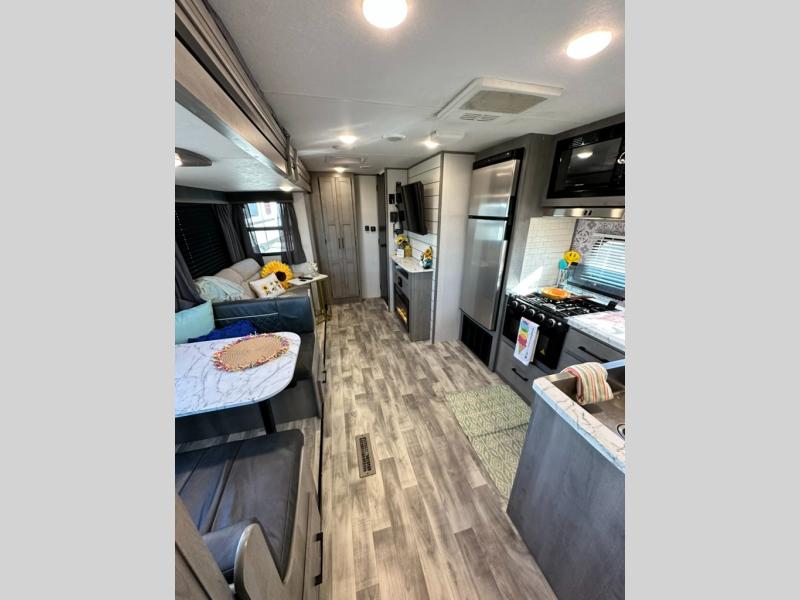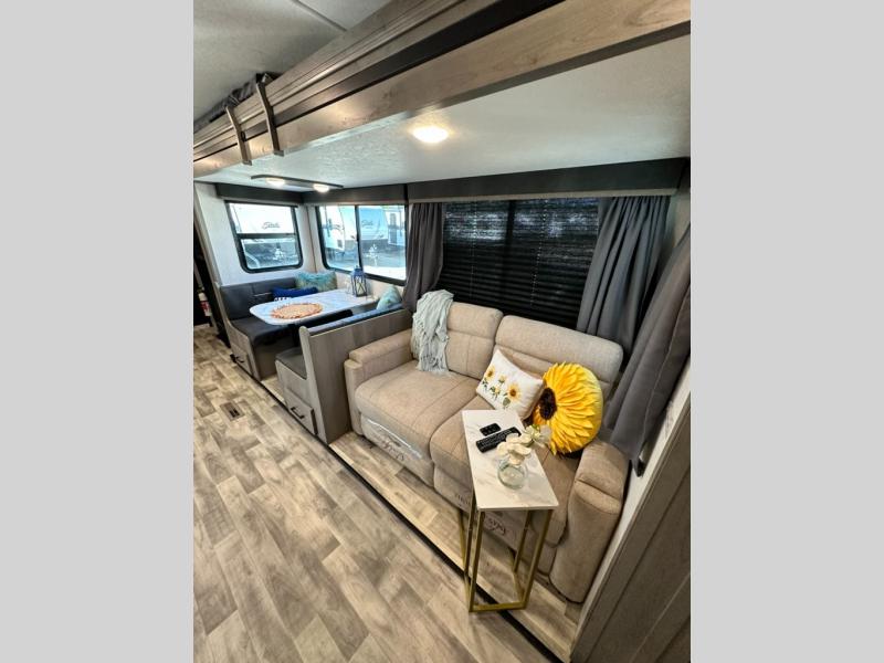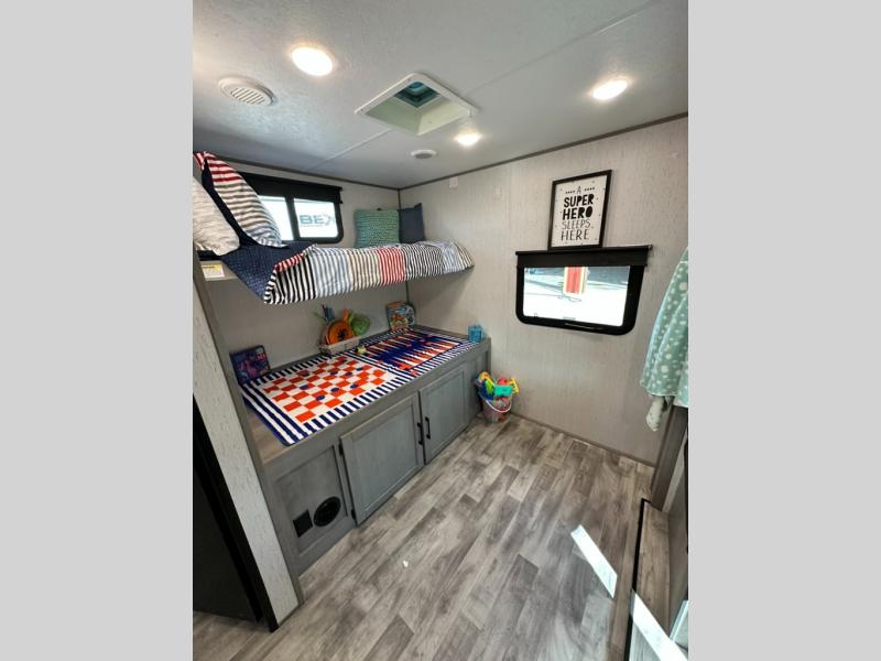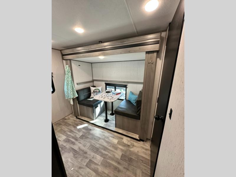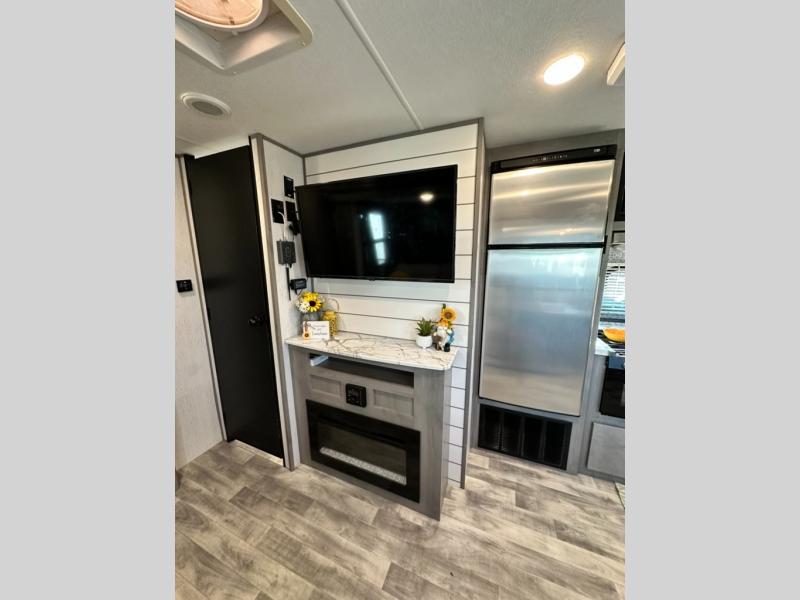 This travel trailer can comfortably sleep seven people each night, so invite your grandkids or neighbor friends along! There is a full bath close to the front bedroom, plus a half bath in the private bunkhouse for convenience, and the outdoor kitchen will be a hit with everyone! If a rainy day is ruining your plans, you can relax on the sofa across from the fireplace, or play board games at the booth dinette. And don't forget to check out the front private bedroom with a king bed!