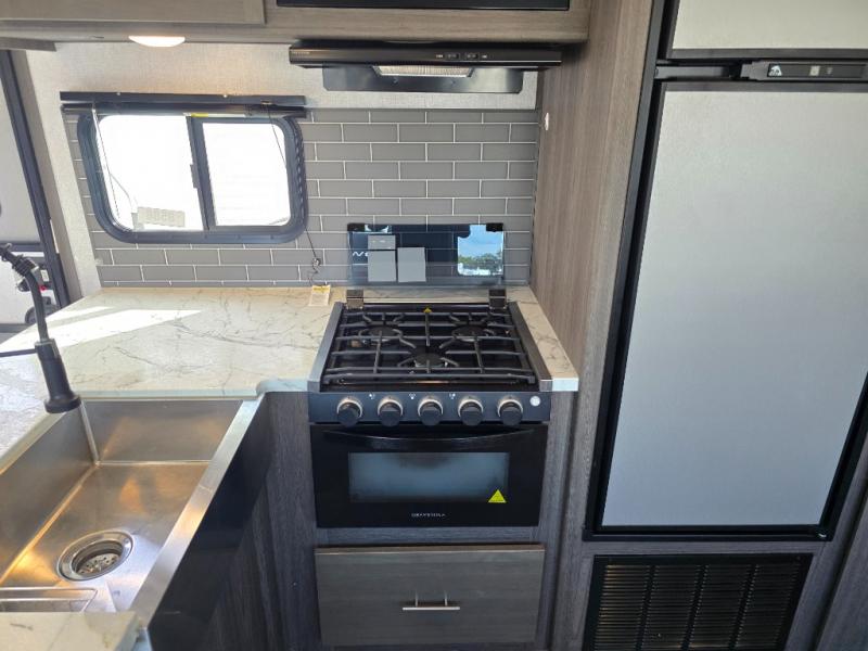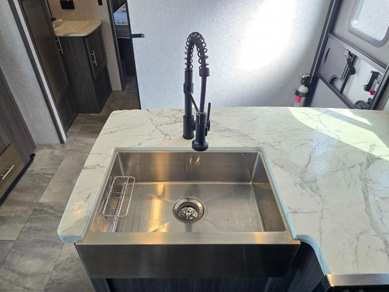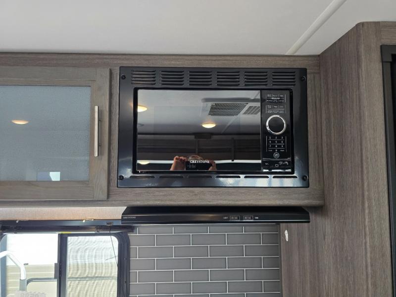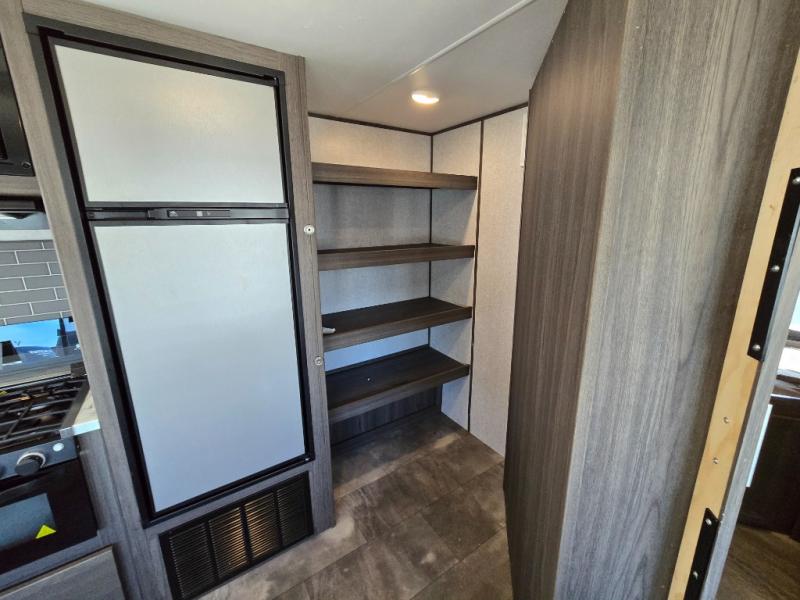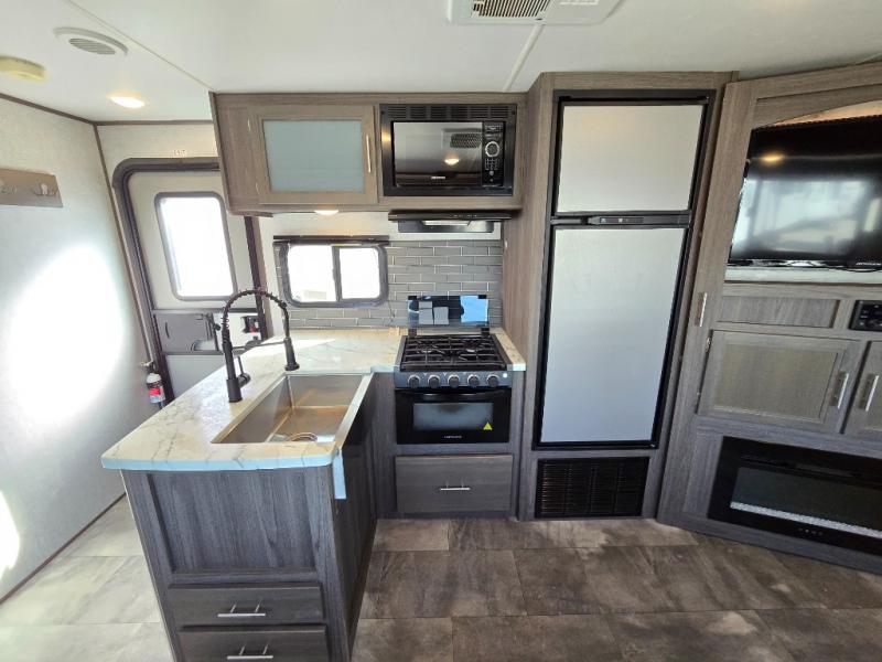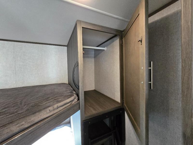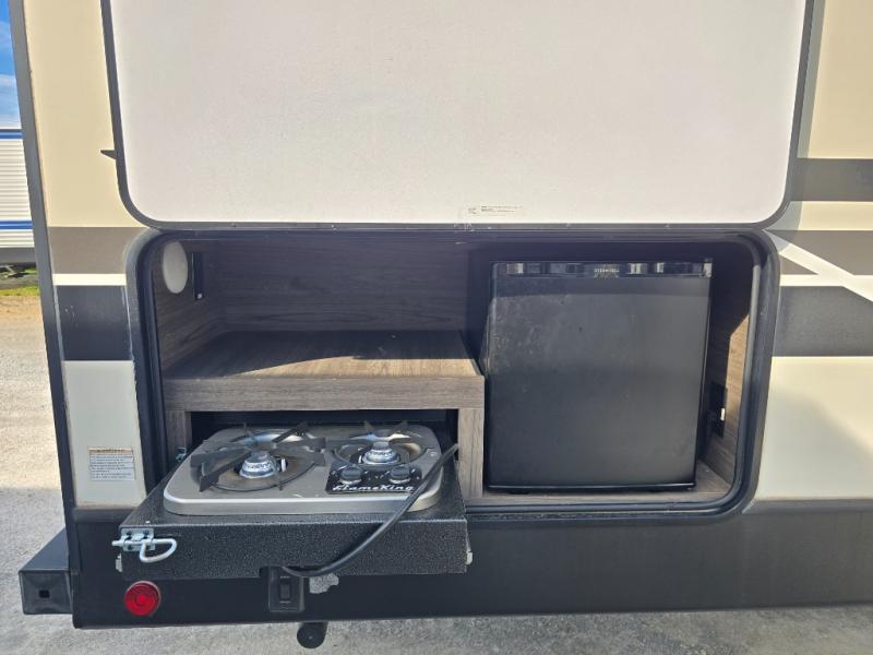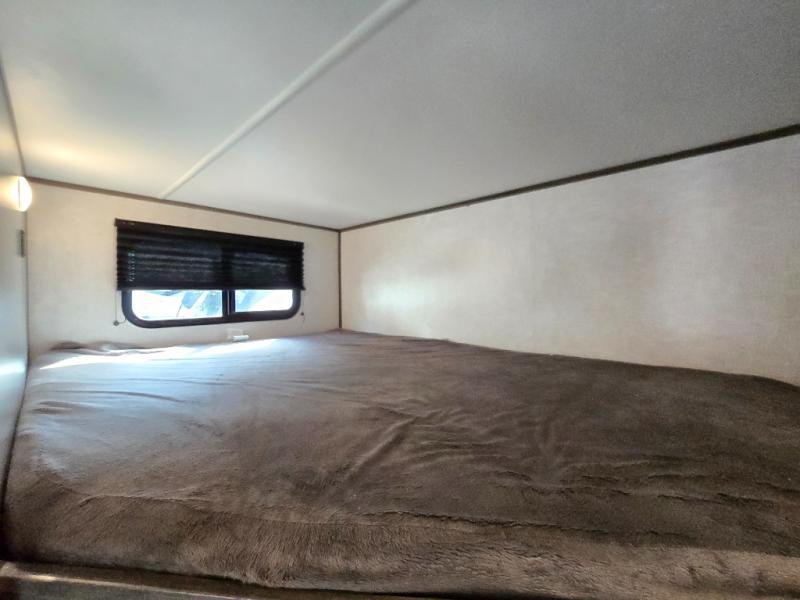 You can camp whenever you want with your spouse or your whole family with sleeping space for nine or ten happy campers in this Kodiak Ultra-Lite travel trailer. Four campers can sleep in the private bunkhouse while others use the living room furniture once it's set up for bedtime. No worries about falling asleep quickly since you have your own private bedroom up front with a residential queen bed. In the morning, everyone can gather under the awning while someone cooks on the outside kitchen, or you can choose to stay indoors while relaxing and watching the hinged entertainment center at whichever angle you choose while the cook makes breakfast with full amenities.