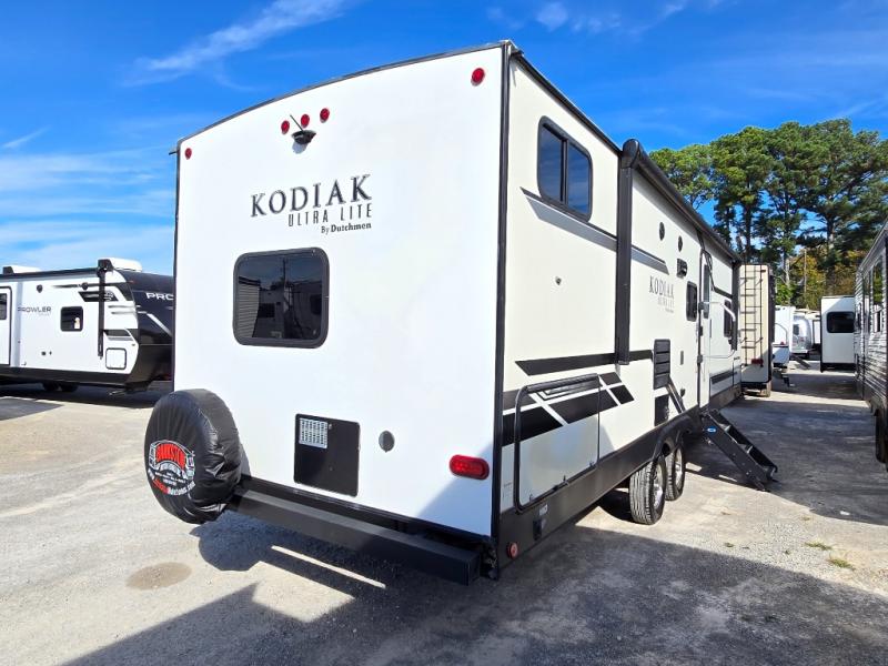 Let your next set of travel plans include the Dutchmen Kodiak Ultra-Lite travel trailer! You'll be glad you did when you find out that these trailers have an aluminum super-structure design making them perfect to tow behind most vehicles. You can use the central control station to operate your trailer's electrical functions, and you'll appreciate having a spare tire and carrier in the event of a mishap on the road. Sit outside underneath the power awning with LED lights each night to enjoy time spent together in the fresh air, and use the AM/FM/CD/DVD stereo and exterior speakers to provide some extra entertainment while you're outside.