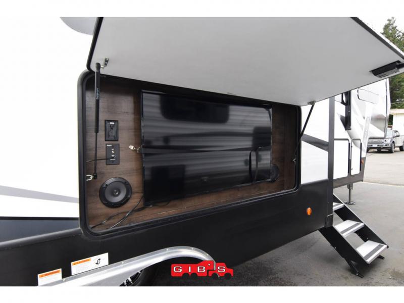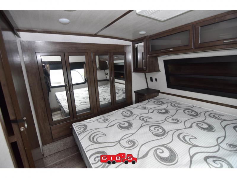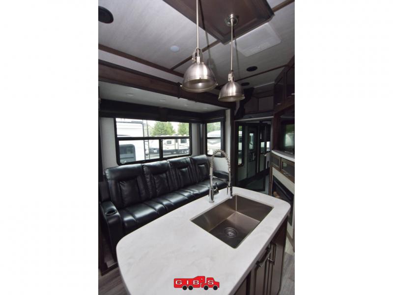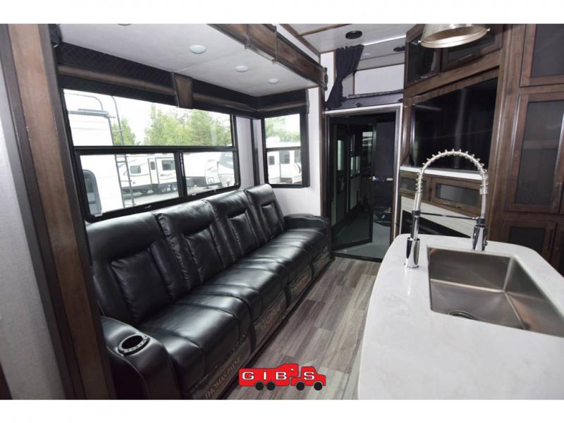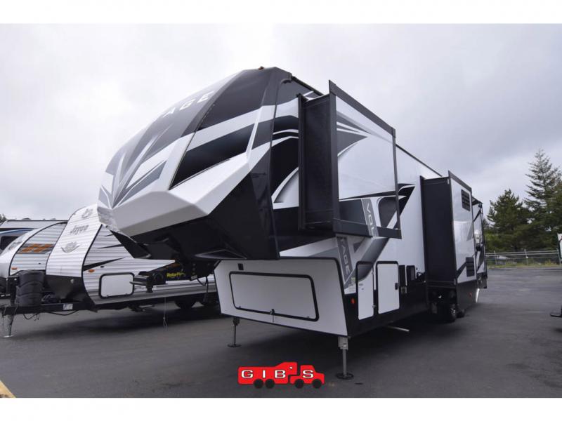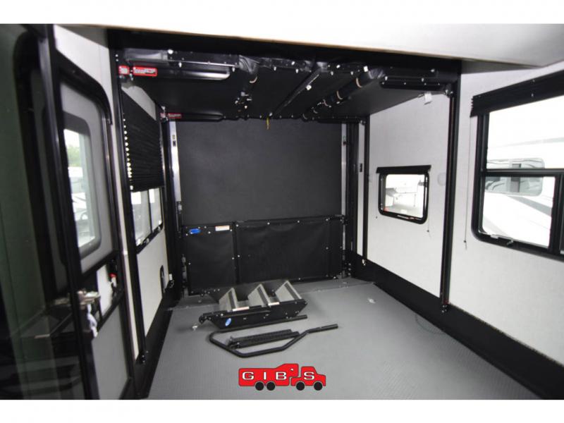 You will be extremely impressed by the amount of luxury found on the Dutchmen Voltage fifth wheel toy hauler! Some of the premium features that you will find on the Voltage are the Zero-Gravity ramp door that lets you access your toys with very little effort and the king-size bed which offers you extra space for sleeping comfortably. The Voltage also has industry-leading 7'-tall slides so that you can feel free to stretch your legs while inside. The ramp door patio system is certainly going to be an appealing factor because it provides you with an extra party space, and the dedicated heat ducts for the underbelly and the All-Weather Package with additional insulation will ensure that your Voltage is protected and prepared for all sorts of weather.