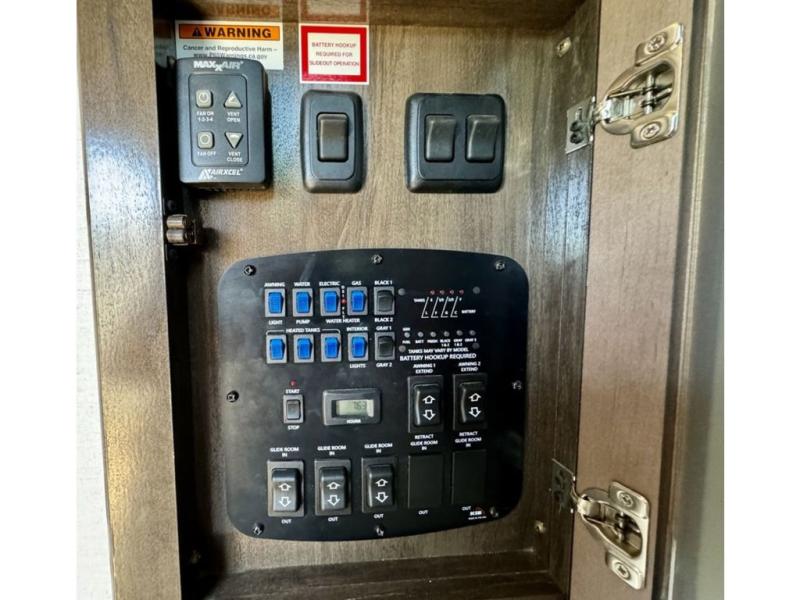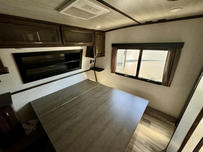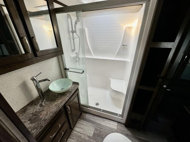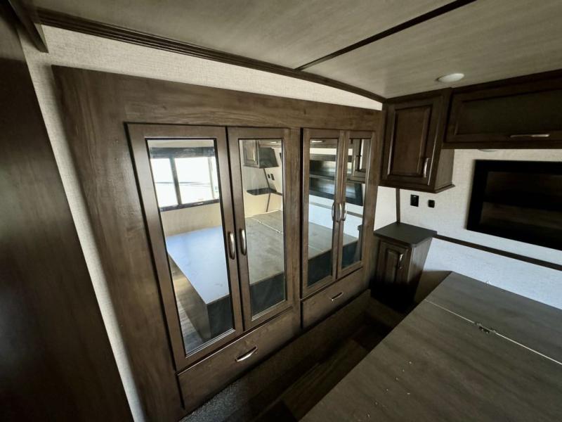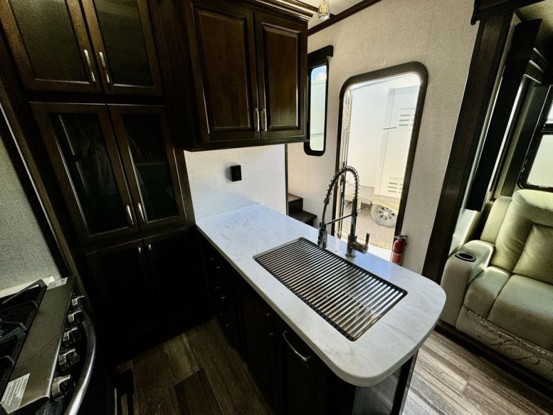 You will be extremely impressed by the amount of luxury found on the Dutchmen Voltage fifth wheel toy hauler! Some of the premium features that you will find on the Voltage are the Zero-Gravity ramp door that lets you access your toys with very little effort and the king-size bed which offers you extra space for sleeping comfortably. The Voltage also has industry-leading 7'-tall slides so that you can feel free to stretch your legs while inside. The ramp door patio system is certainly going to be an appealing factor because it provides you with an extra party space, and the dedicated heat ducts for the underbelly and the All-Weather Package with additional insulation will ensure that your Voltage is protected and prepared for all sorts of weather.