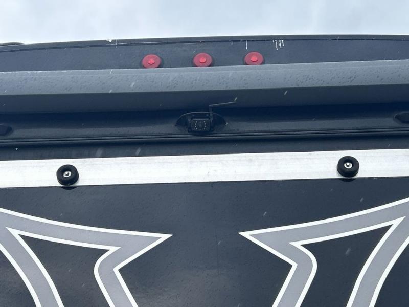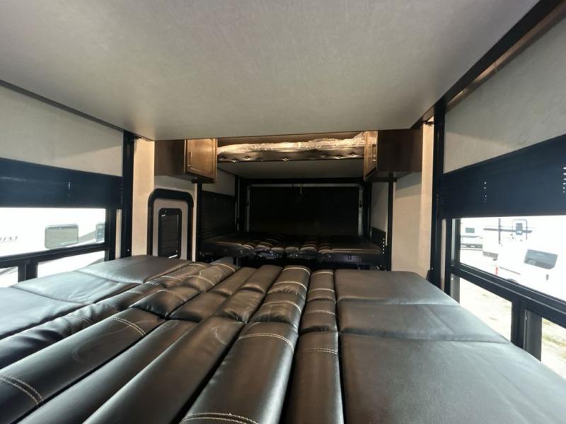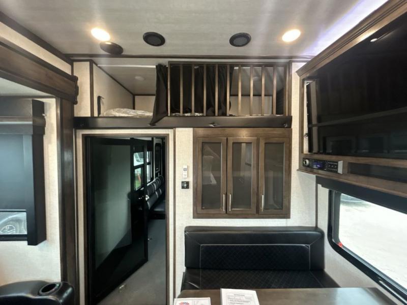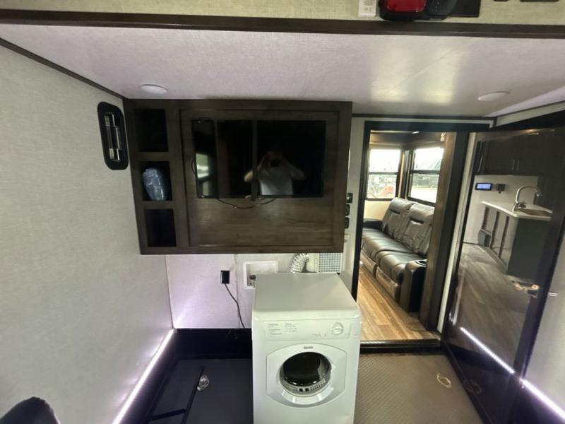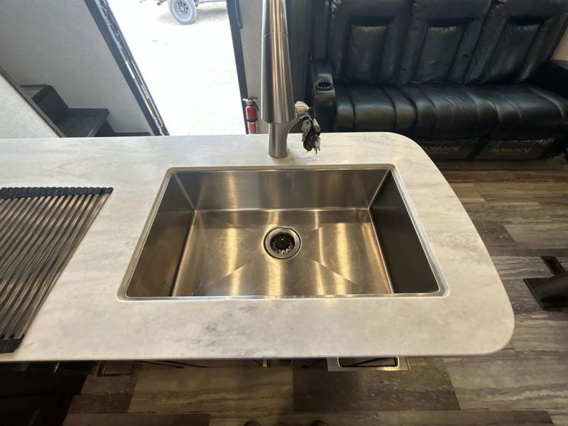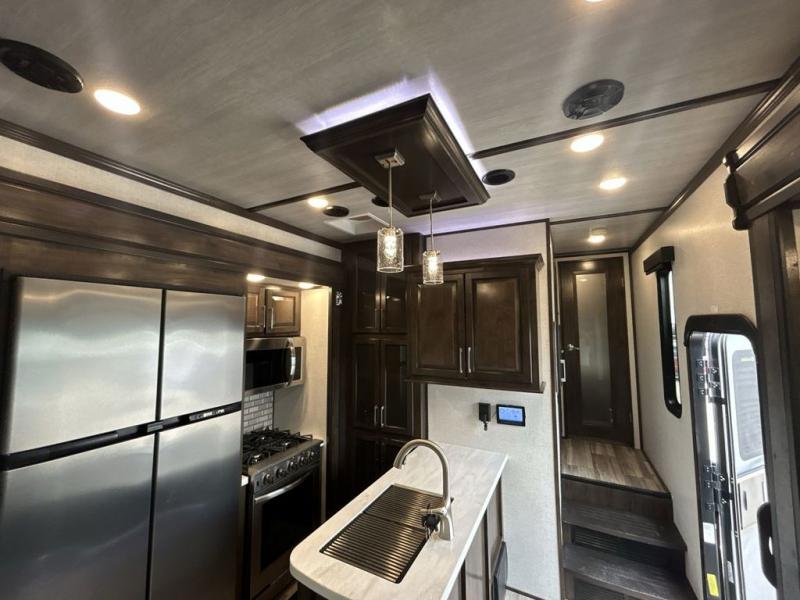 This Voltage toy hauler has the largest garage of the Voltage line-up! The 18' separate garage has an impressive amount of storage space for your toys, but it also has quite a bit of sleeping space as well with the two sets of opposing sofas with tables, the two Happi-Jack power bunks, and the twin-size loft. Whoever stays in the garage can have easy and discreet access since there are two entry doors on this unit. The kitchen has an abundance of amenities, like an oversized convection microwave, a roll-up strainer over the sink, an 18-cubic foot refrigerator, a stainless steel farmer's sink, and a Furrion three-burner range with 21" oven. At the front of this unit is a master suite that has a king-size bed, a wardrobe slide, USB chargers by the nightstands, and a private entrance into the dual-entry bathroom.