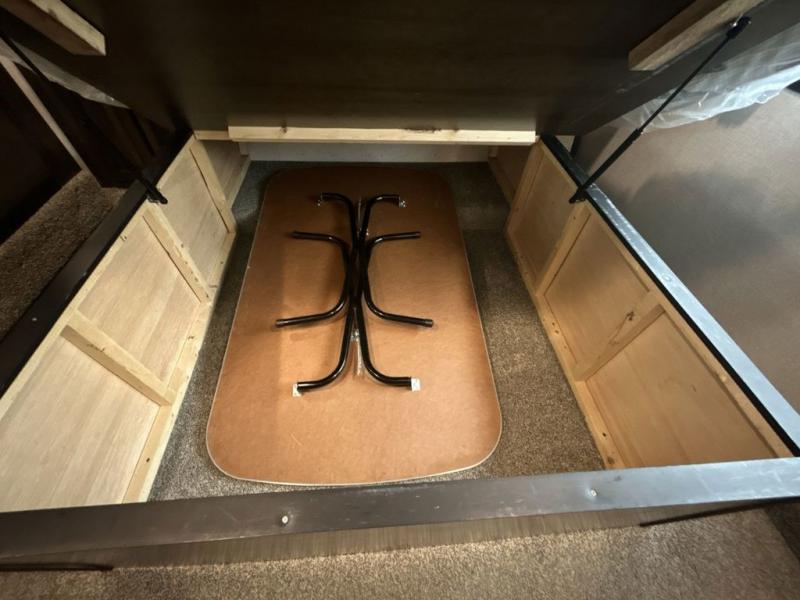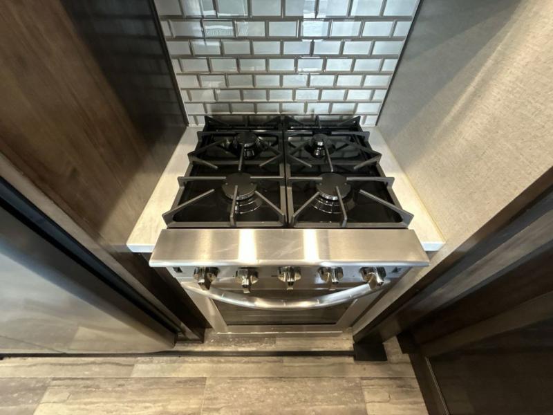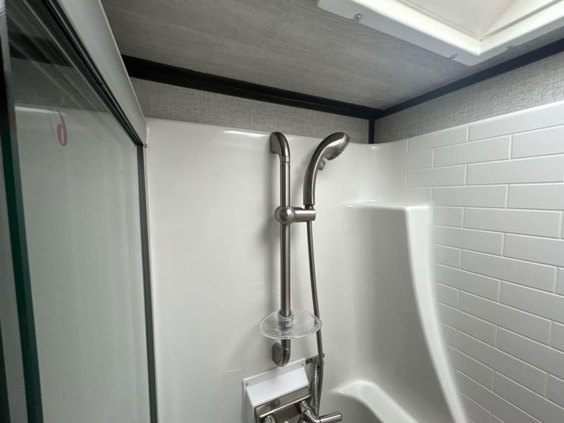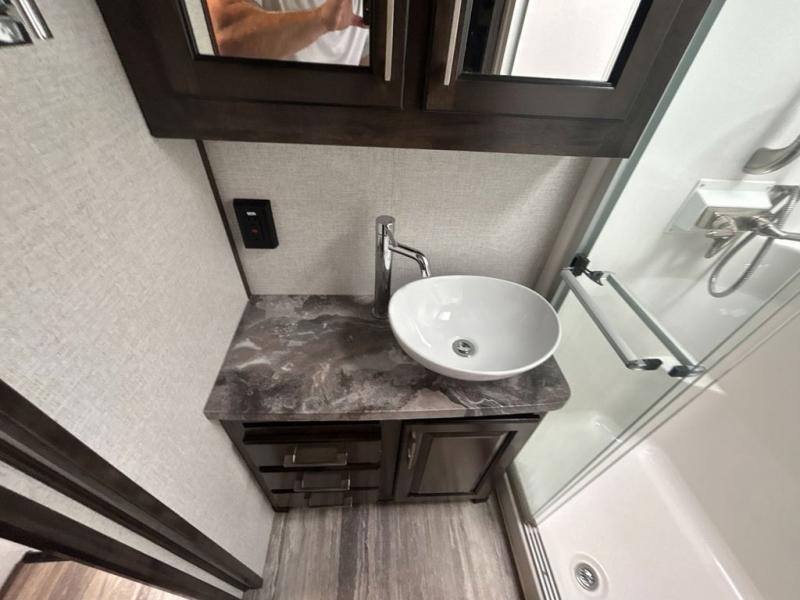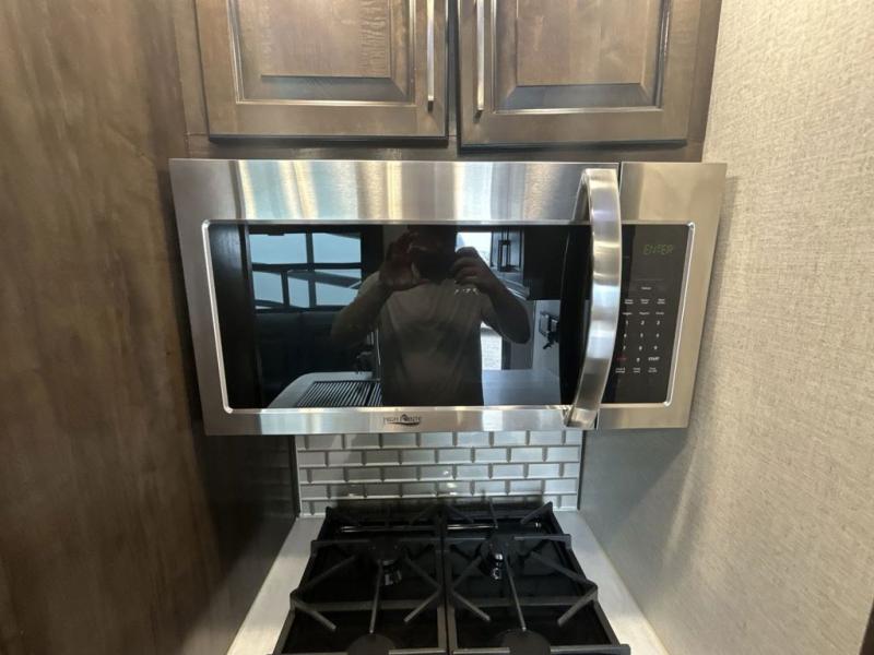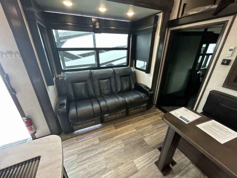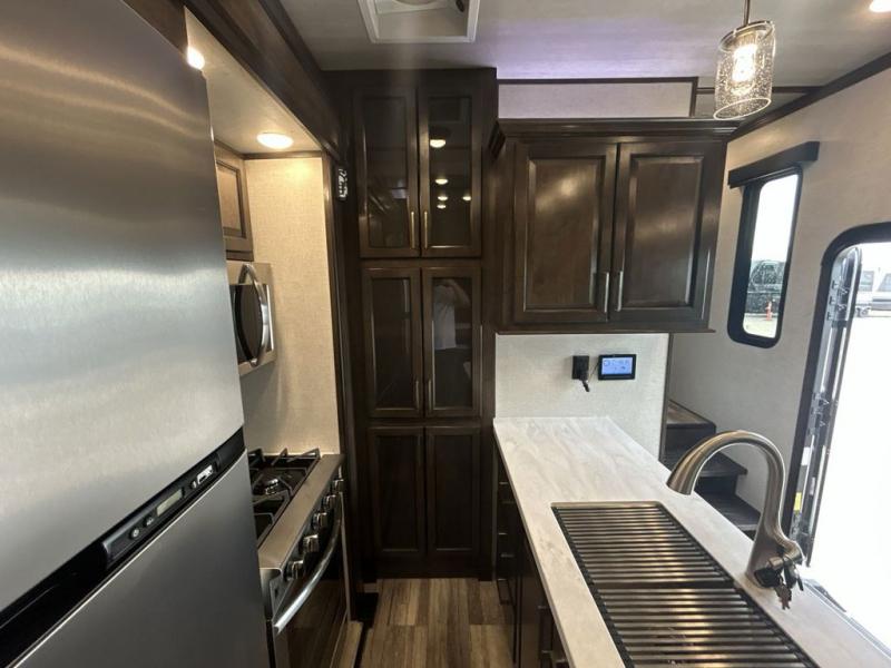 This Voltage toy hauler has the largest garage of the Voltage line-up! The 18' separate garage has an impressive amount of storage space for your toys, but it also has quite a bit of sleeping space as well with the two sets of opposing sofas with tables, the two Happi-Jack power bunks, and the twin-size loft. Whoever stays in the garage can have easy and discreet access since there are two entry doors on this unit. The kitchen has an abundance of amenities, like an oversized convection microwave, a roll-up strainer over the sink, an 18-cubic foot refrigerator, a stainless steel farmer's sink, and a Furrion three-burner range with 21" oven. At the front of this unit is a master suite that has a king-size bed, a wardrobe slide, USB chargers by the nightstands, and a private entrance into the dual-entry bathroom.
