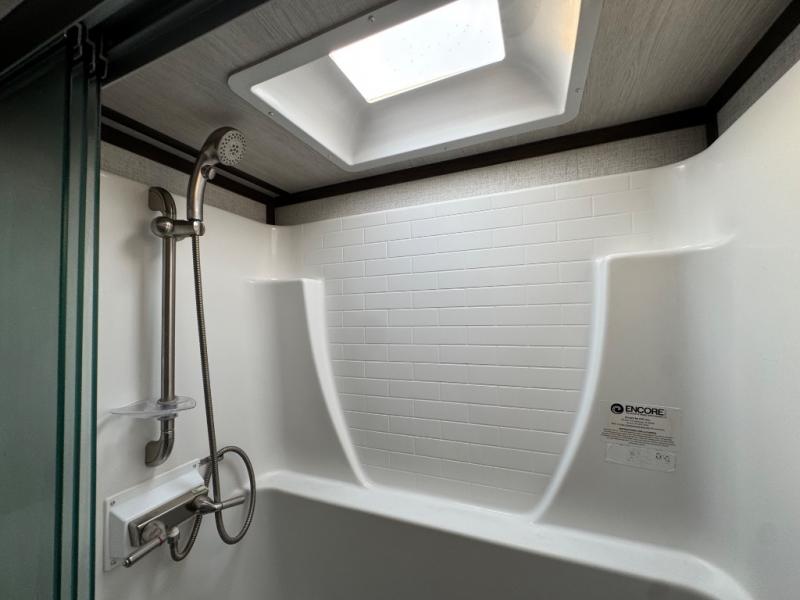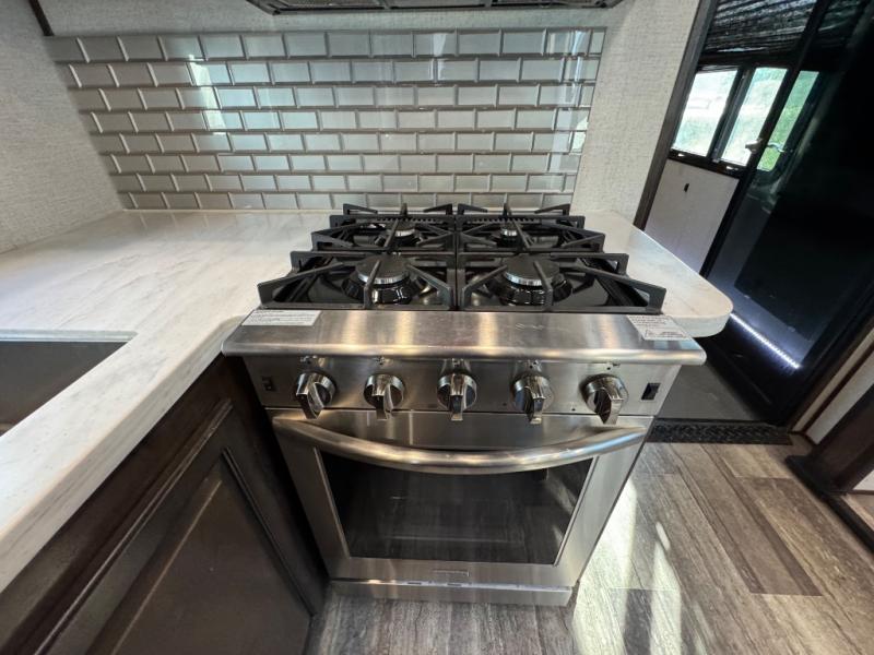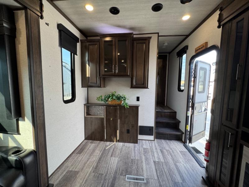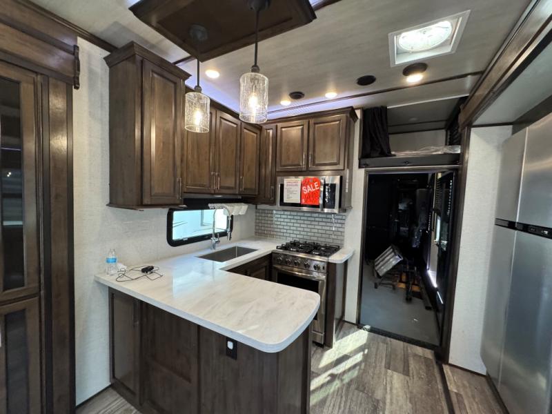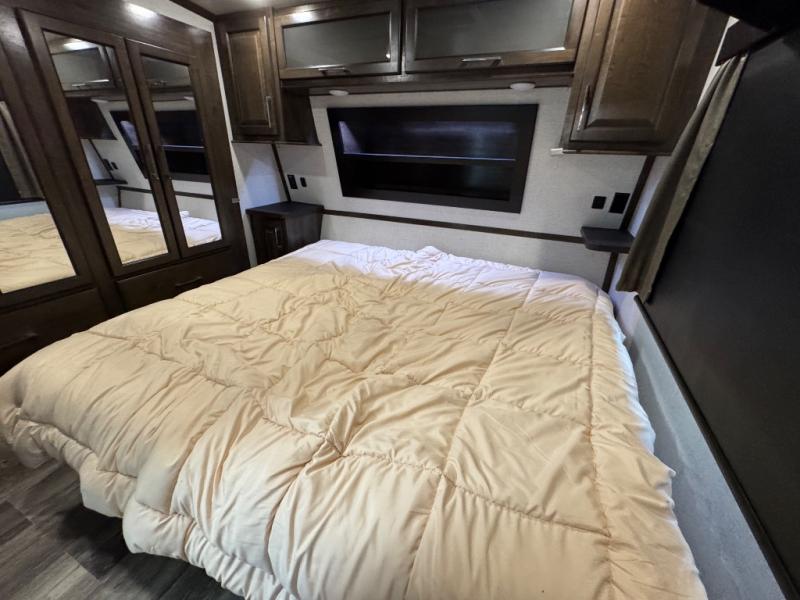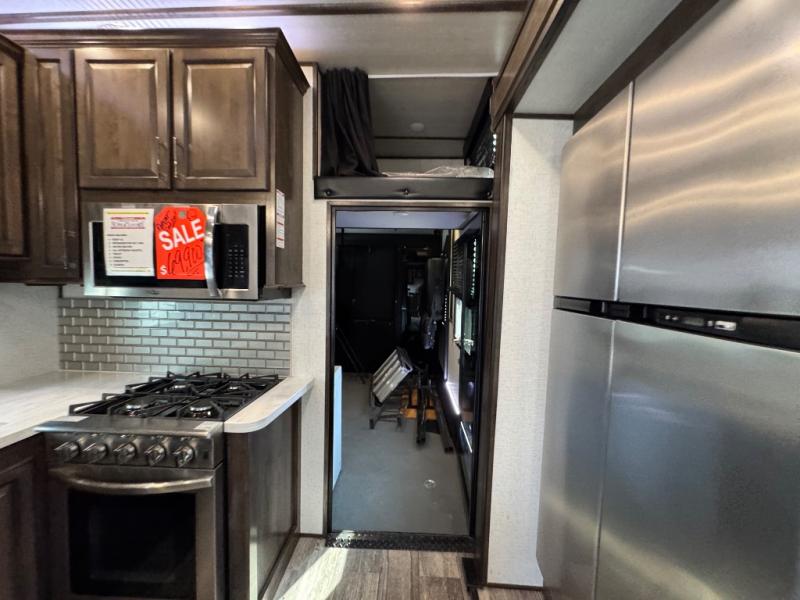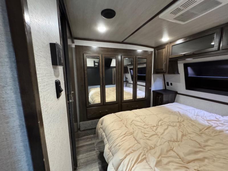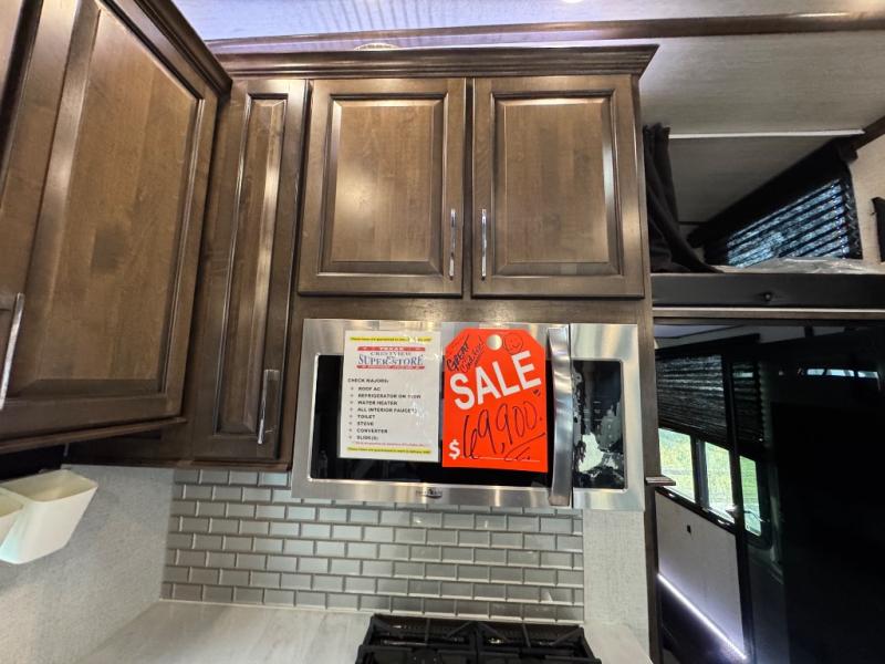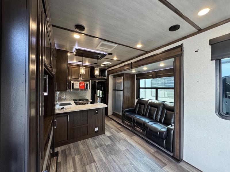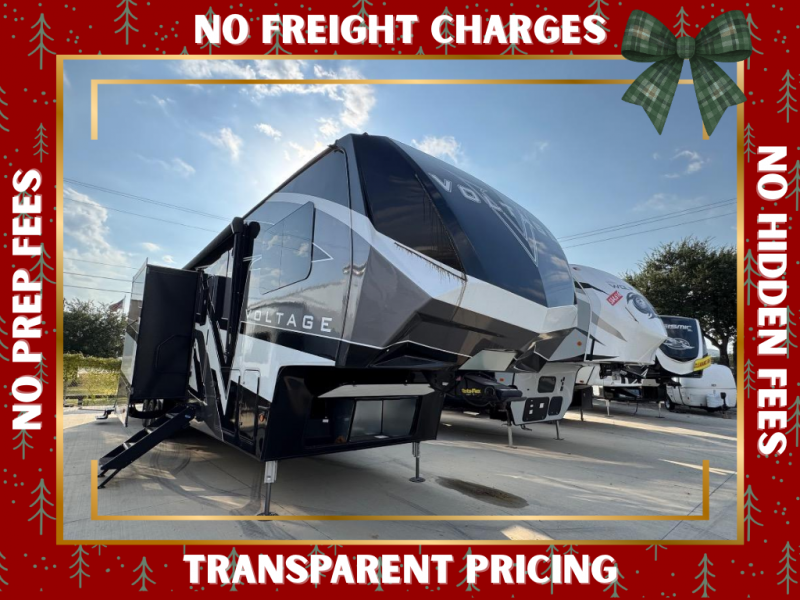 You will be extremely impressed by the amount of luxury found on the Dutchmen Voltage fifth wheel toy hauler! Some of the premium features that you will find on the Voltage are the Zero-Gravity ramp door that lets you access your toys with very little effort and the king-size bed which offers you extra space for sleeping comfortably. The Voltage also has industry-leading 7'-tall slides so that you can feel free to stretch your legs while inside. The ramp door patio system is certainly going to be an appealing factor because it provides you with an extra party space, and the dedicated heat ducts for the underbelly and the All-Weather Package with additional insulation will ensure that your Voltage is protected and prepared for all sorts of weather.