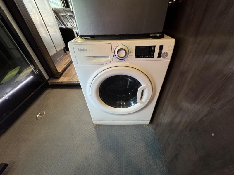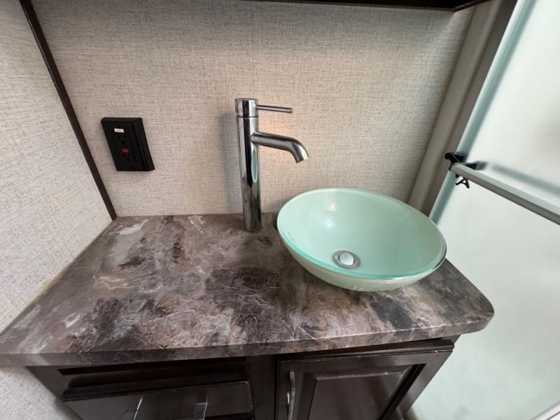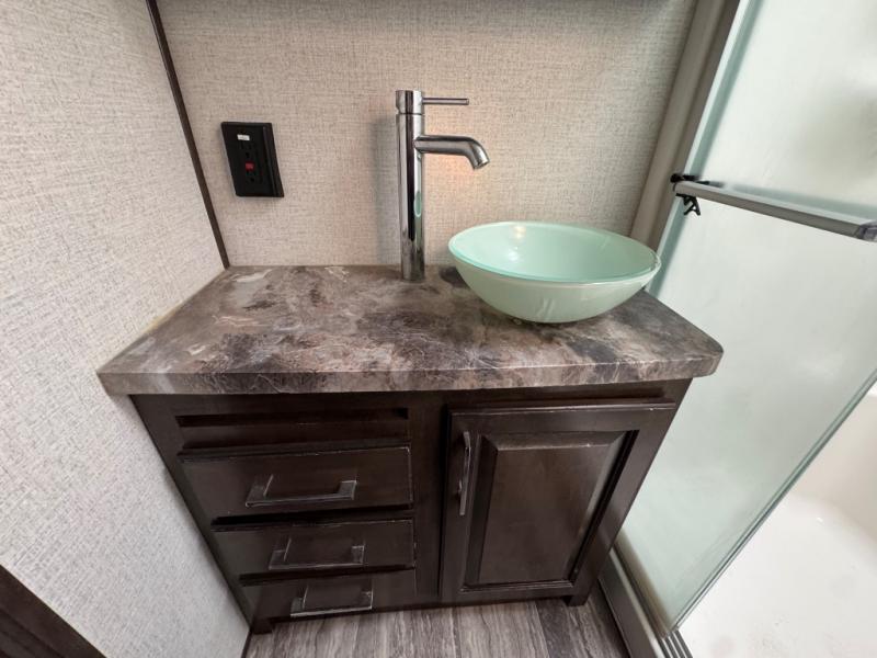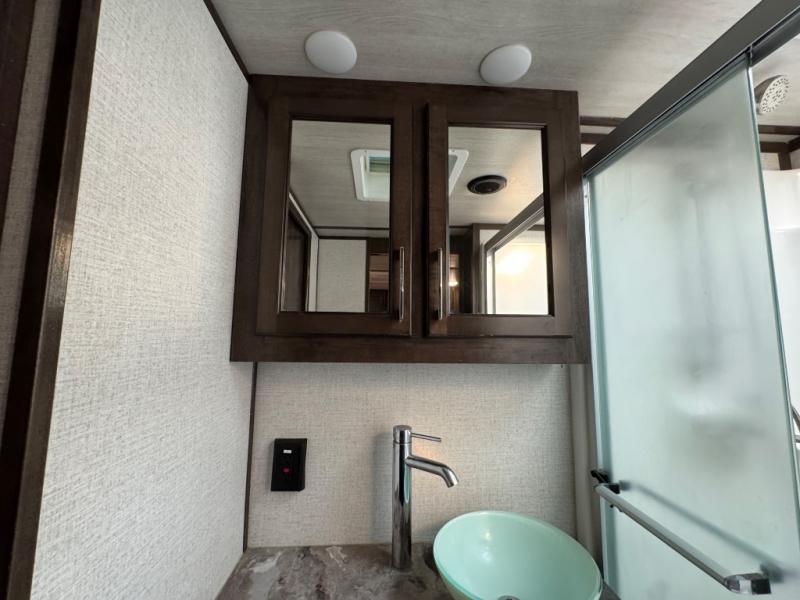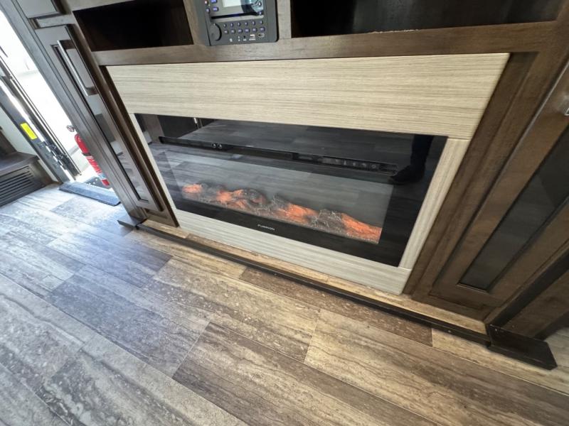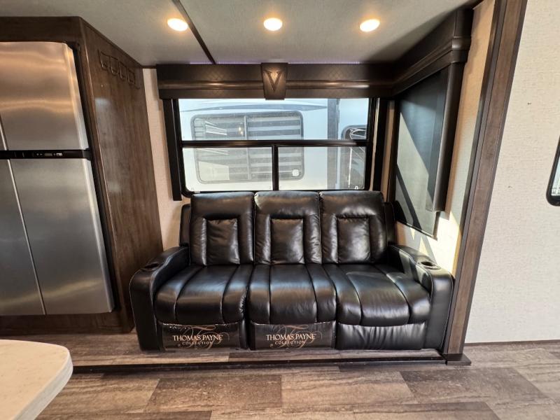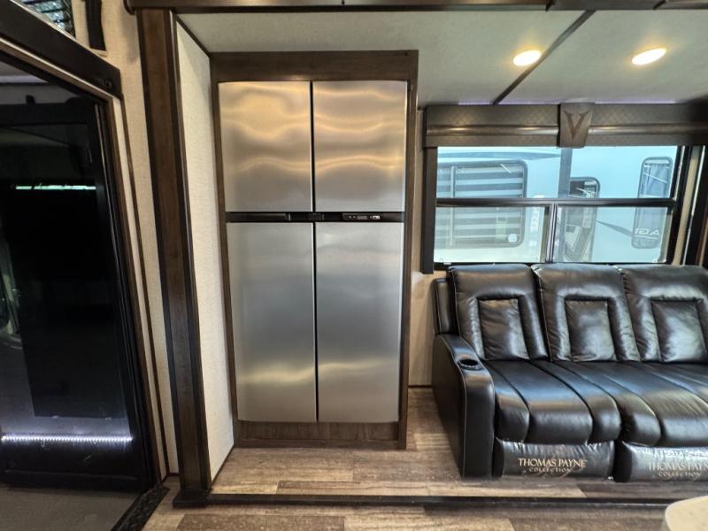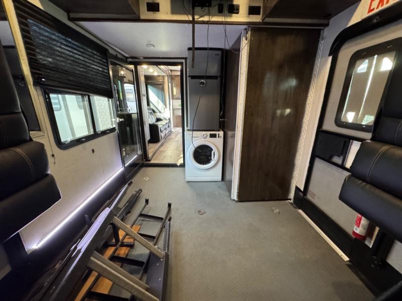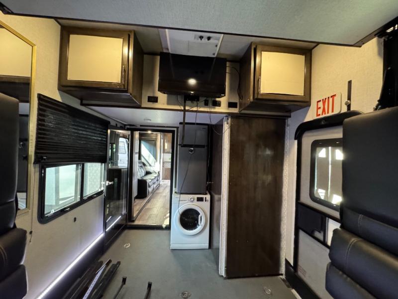 This Voltage toy hauler has so much to offer! From the king-size bed, Happi-Jack power bunk, and twin-size loft to the fireplace, residential sofa with heat and massage, and two entry doors, you will find convenience and comfort all throughout. The kitchen is decked out with helpful amenities, like an oversized convection microwave, a stainless steel farmer's sink, a Furrion three-burner range with 21" oven, and a peninsula countertop. One other feature that is going to make this unit extremely desirable is the full and half bathroom. The full dual-entry bathroom resides up at the front connected to the bedroom, and the half bathroom is located back within the garage so that you can offer this space as a guest suite to your friends. Plus, on top of all of that, there is also an outdoor kitchen and entertainment center so that you can increase the party atmosphere.