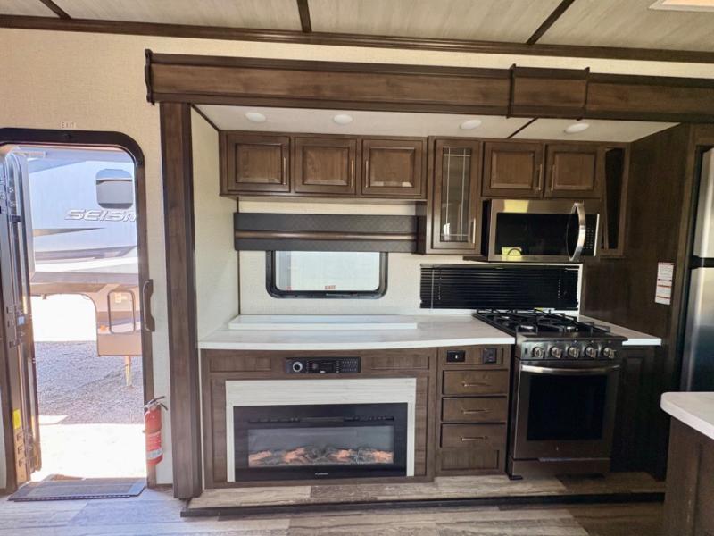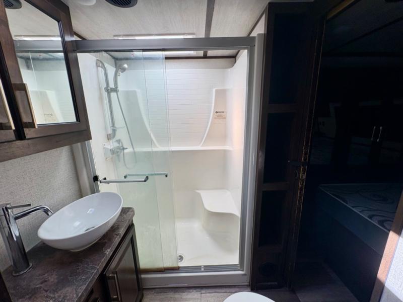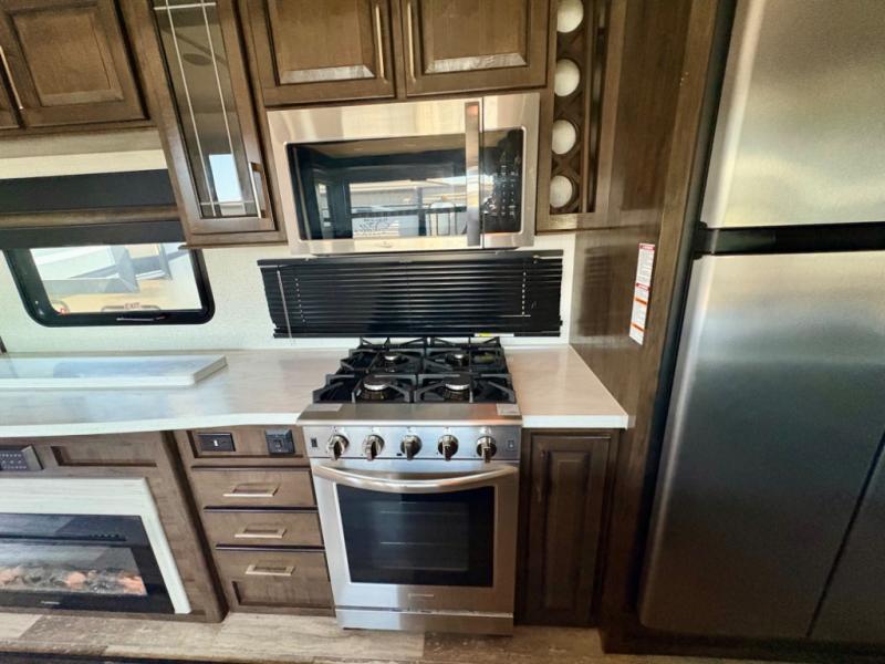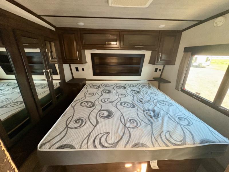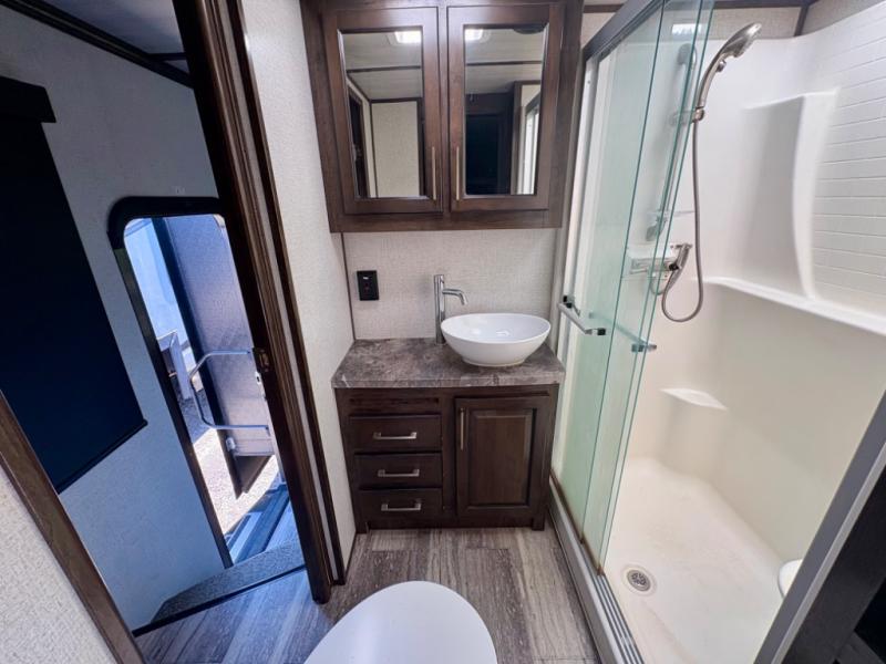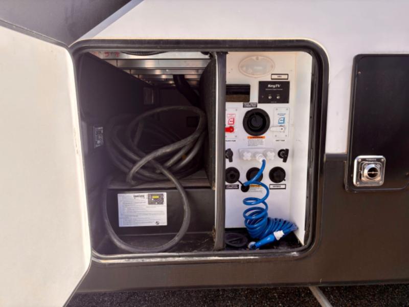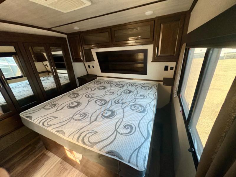 You will be extremely impressed by the amount of luxury found on the Dutchmen Voltage fifth wheel toy hauler! Some of the premium features that you will find on the Voltage are the Zero-Gravity ramp door that lets you access your toys with very little effort and the king-size bed which offers you extra space for sleeping comfortably. The Voltage also has industry-leading 7'-tall slides so that you can feel free to stretch your legs while inside. The ramp door patio system is certainly going to be an appealing factor because it provides you with an extra party space, and the dedicated heat ducts for the underbelly and the All-Weather Package with additional insulation will ensure that your Voltage is protected and prepared for all sorts of weather.