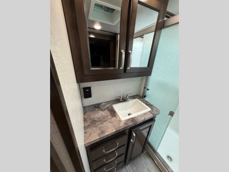 With any Voltage Triton toy hauler by Dutchmen RV, you will enjoy the luxurious interior, as well as the fabulous garage features that include a spring-assist ramp door, a 30-gallon fuel station to keep your toys fueled all weekend long, Tuff Ply flooring for durability, and 2,500-LB tie downs to secure your toys while on the go. Inside each model you will find a 50" TV, upgraded residential furniture, solid-surface countertops, and a stainless steel kitchen sink. It's time to stop dreaming about adventure and luxury and start living it!