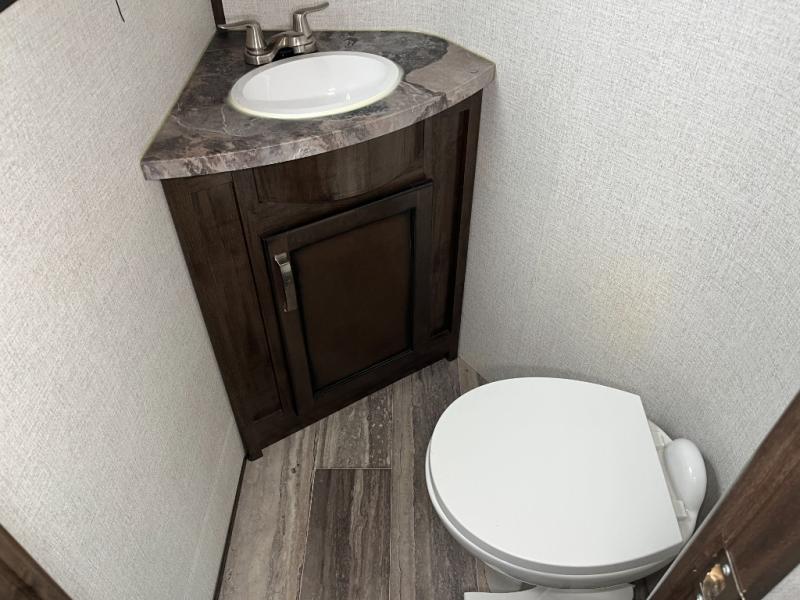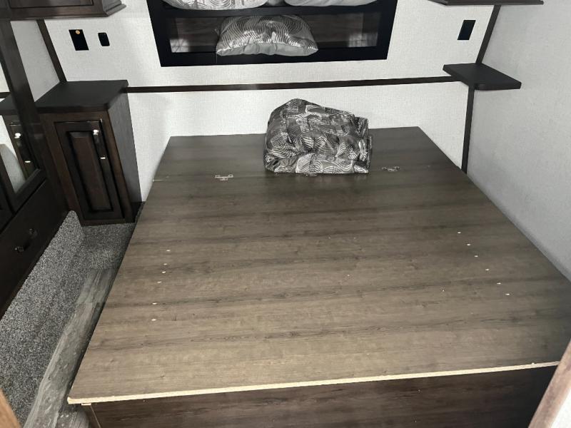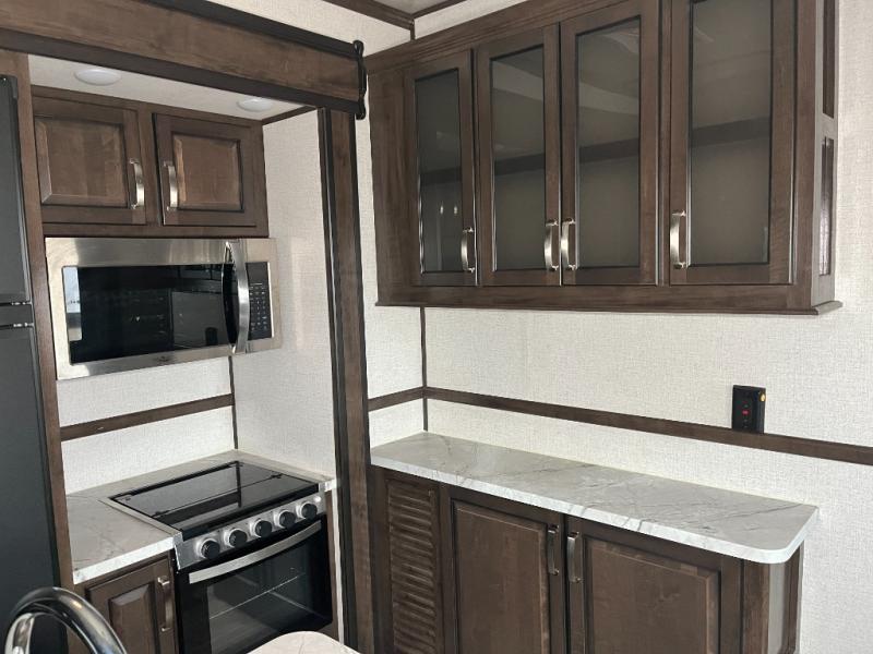 When you need to get away and take the toys out for a weekend of fun, take this Voltage Triton toy hauler with you! You will be so grateful to find a pass-through storage on top of the 15' separate garage so that you can bring even more gear. The garage has a half bathroom, the second exterior entry door, a power bunk, a twin-size loft, and a set of opposing sofas with table that will double as private bedroom for your guests or kids. There is also an excellent sleeping space for you up front with the master suite, and the opposing slides in the main living area are what will provide you with a comfortable environment to relax or cook a meal.