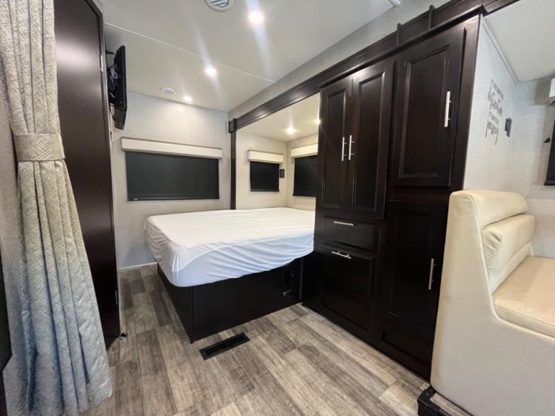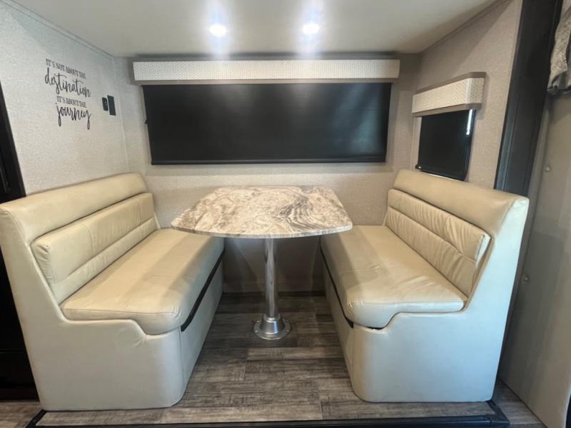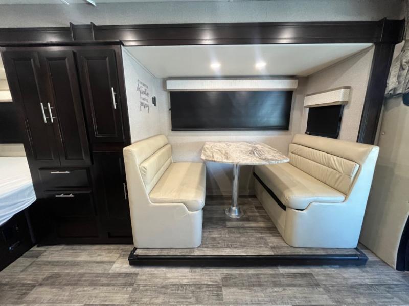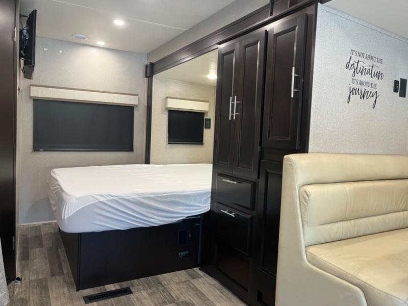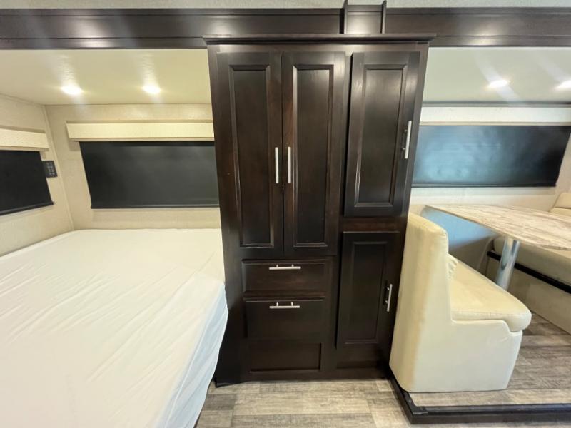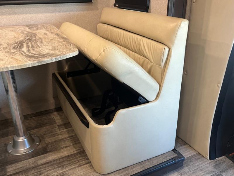 This 24FW Class C diesel motorhome gives you the luxuries of home while traveling on the road! The full wall slide out helps to really open up the interior when you are parked. When you aren't enjoying a meal or playing a card game at the booth dinette, you can head to the rear and relax on the gel-infused memory foam queen-size bed while you watch your favorite movie on the 32" LED TV. You won't have to leave anything behind either thanks to the exterior storage area, the underbed storage, and the overhead cabinets throughout the inside. You're going to love getting clean in the rear corner bathroom with the Oxygenics body spa RV shower head and the residential vanity with a stainless steel sink provides the perfect spot for you to get ready!