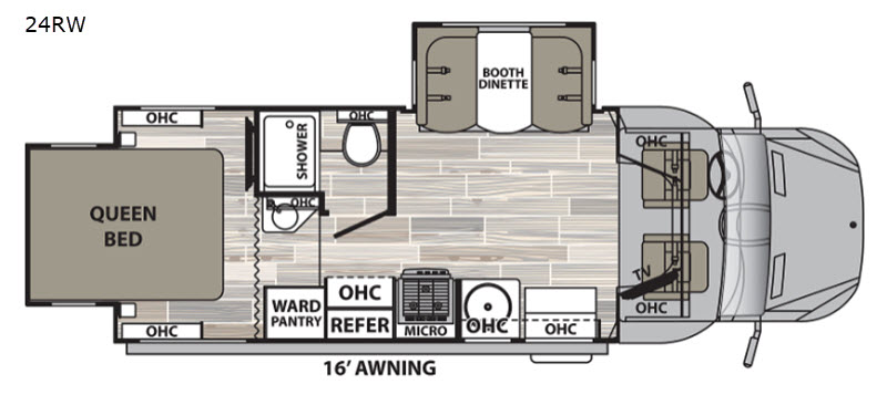 You and your spouse will love traveling in this 24RW Class C diesel motorhome! It features a rear private bedroom with a queen-size bed slide, overhead cabinets, a 32" LED TV, and a privacy curtain to draw at night. The full bathroom shower not only has a skylight above it, but also an Oxygenics Body Spa RV shower head and a lightweight, soft-sided shower door, plus there is a MaxxAir power vent with a built-in rain cover. The booth dinette is great for eating your meals at and playing games, just pop a bag of popcorn in the convection microwave oven and you're all set!