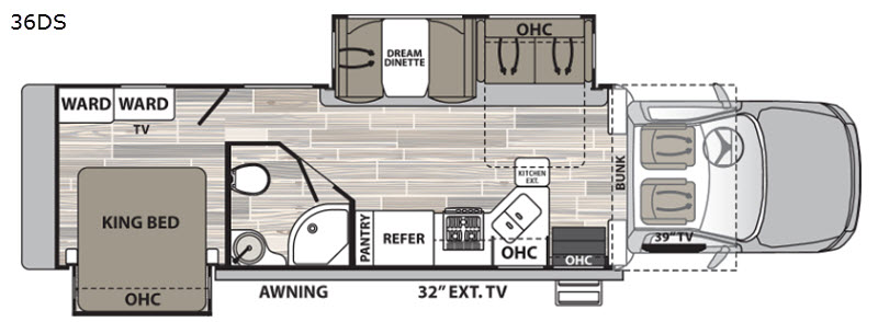 Travel like a king with features such as rear private bedroom with a king-size bed for you to enjoy a good night's rest on each night, a 32" LED TV, and not only one wardrobe, but two wardrobes. Just outside the bedroom is the full bathroom equipped with a skylight over the radius shower to add natural lighting while you get ready. Whether you are eating a delicious meal, playing your favorite game, or using it as an extra sleeping space, you will love all of the versatile features that the Dream Dinette offers. After you have had a fun morning in the sun, come inside and take a quick afternoon nap on the sofa or watch your favorite movie on the 39" LED TV while you sip on your favorite beverage! There are several options you can choose to customize your Super C and maybe the factory 4-wheel drive option is the right choice for you!
