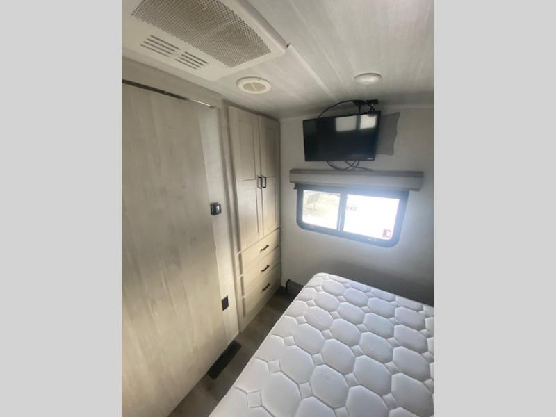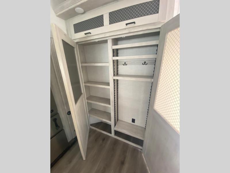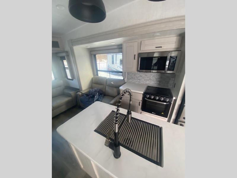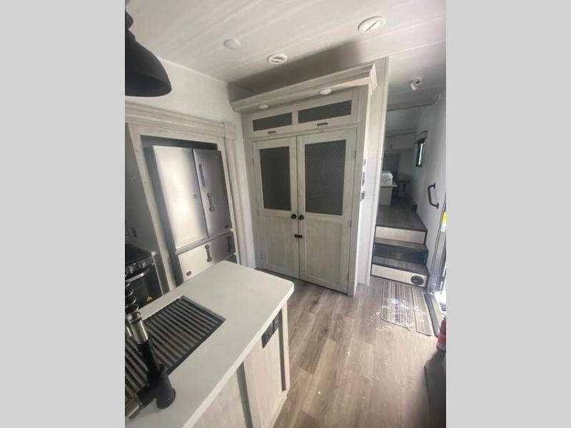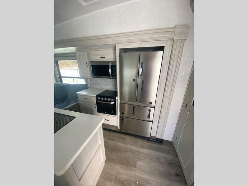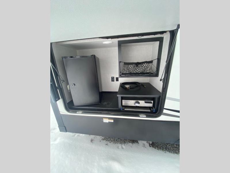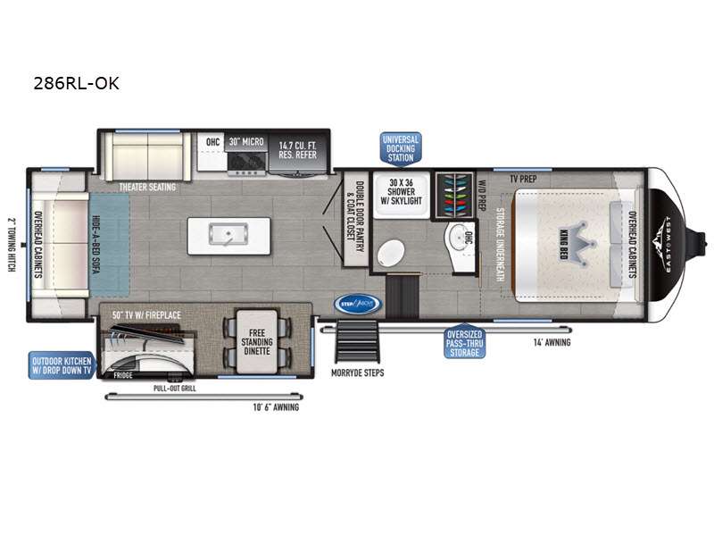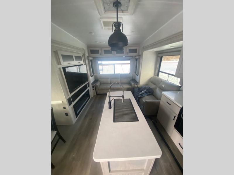 You will have the choice to cook indoors or outdoors each meal thanks to the outside kitchen with a pull-out grill, a fridge, and a drop-down TV to watch while relaxing under one of the two power awnings. The over-sized pass-through storage allows you to bring along the larger camping items like fishing poles, outdoor camp table and chairs, and more! The full kitchen offers a residential refrigerator and microwave, a double-door pantry and coat closet, plus a center island with a deep-seated stainless steel sink with roll-up drying rack and residential high-rise faucet with pull-down sprayer making cleaning the dishes and serving food convenient. Everyone can watch the 50" TV on a swing arm with a fireplace below while relaxing on the theater seating and hide-a-bed sofa or playing a game at the wall-mounted free-standing table.