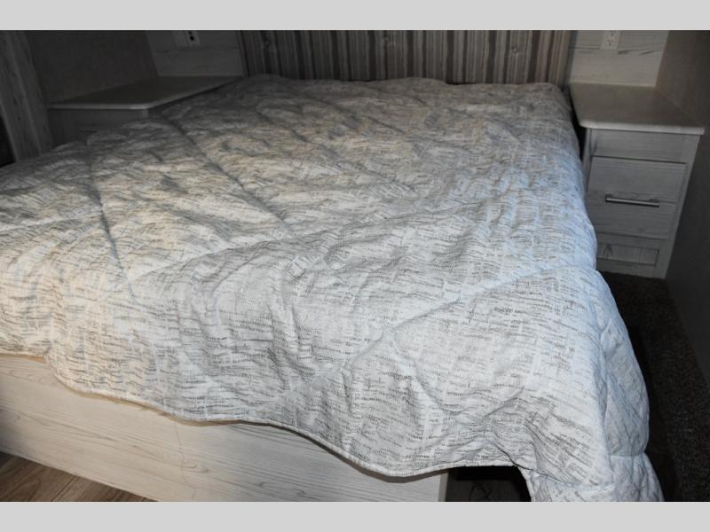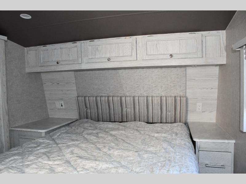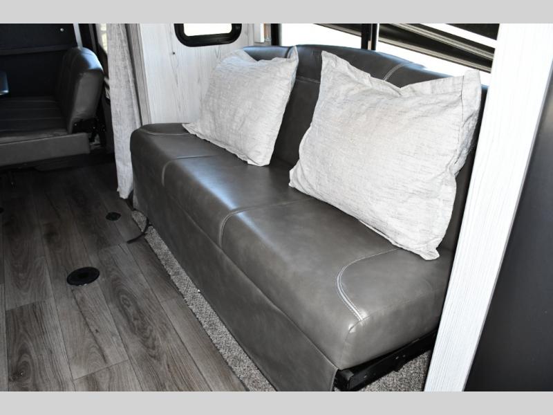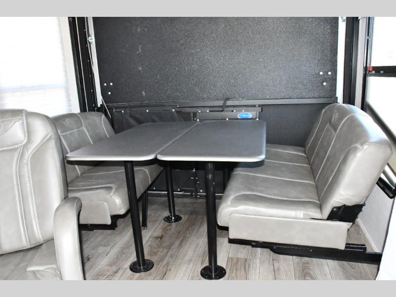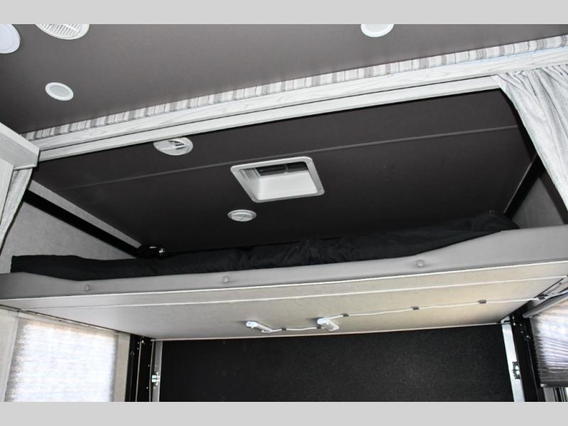 Sleep up to four comfortably in the rear with an electric lift bunk above a convertible dinette—perfect for guests or the kids. Raise it up during the day for spacious indoor lounging. -