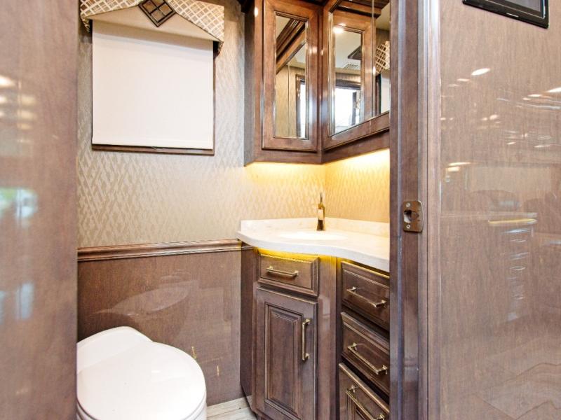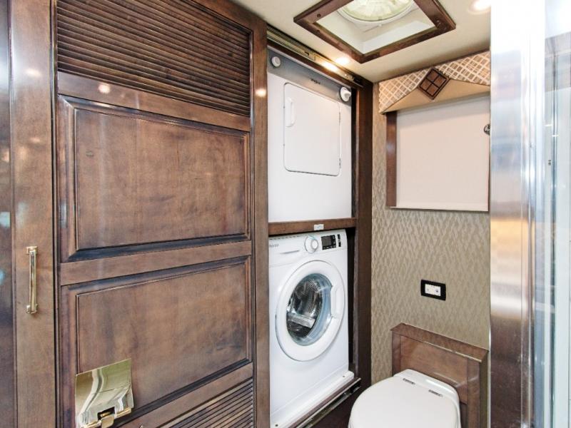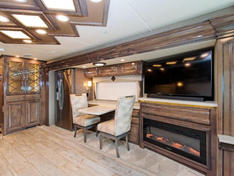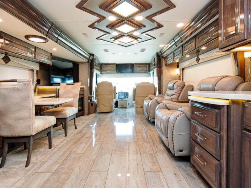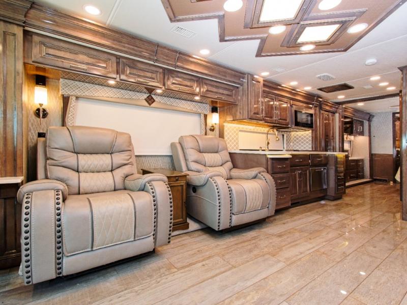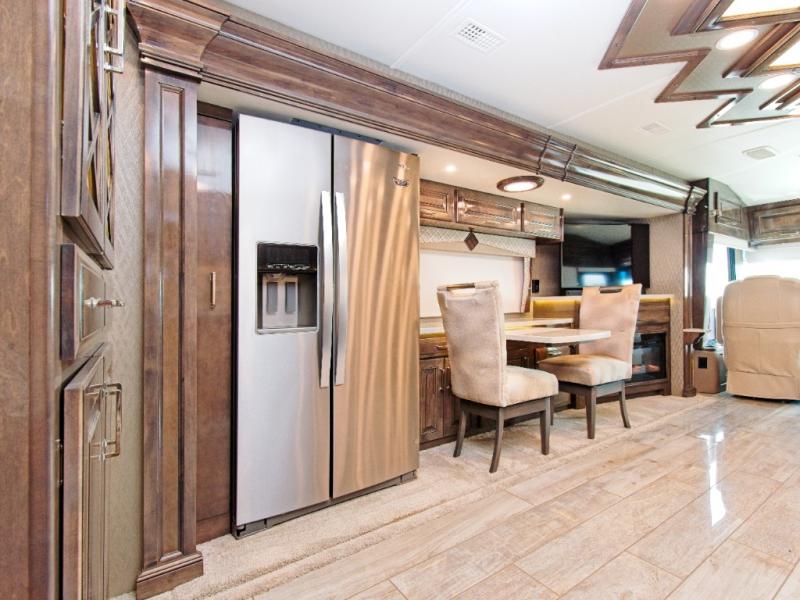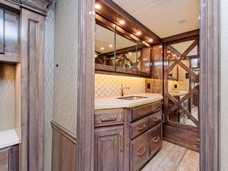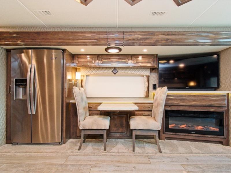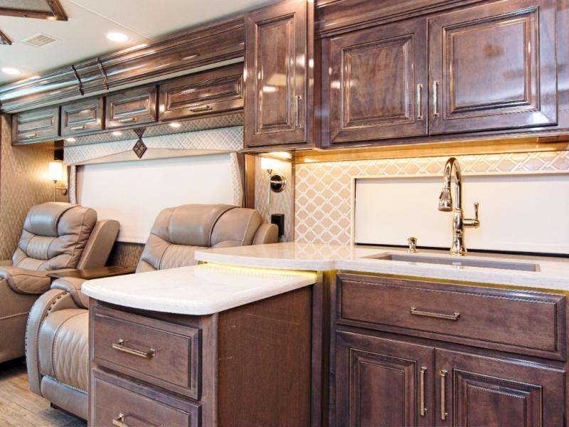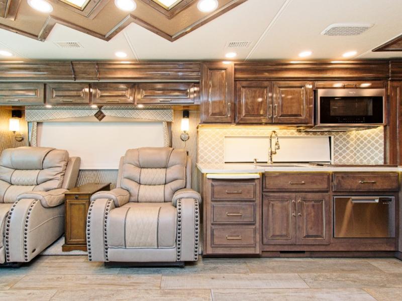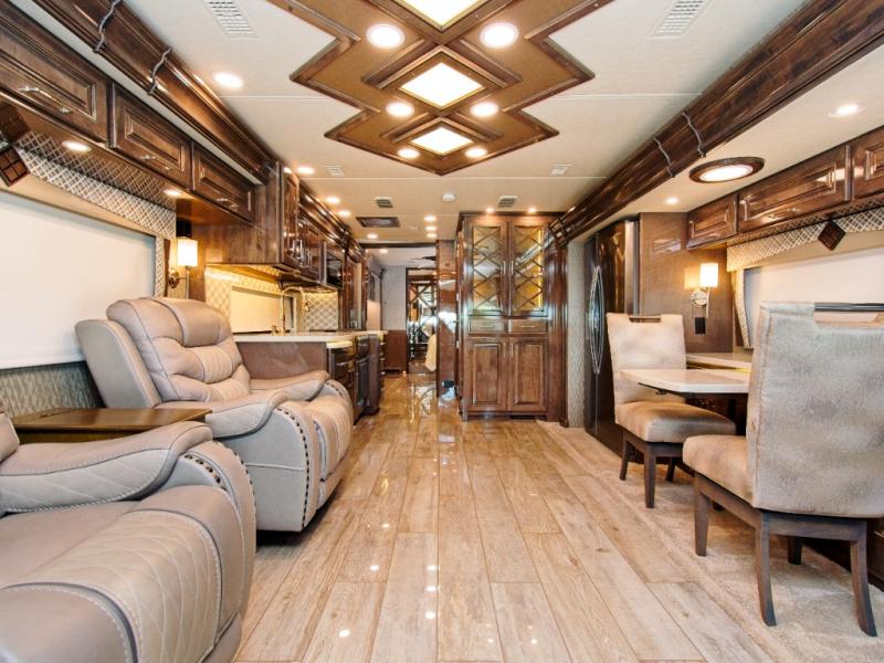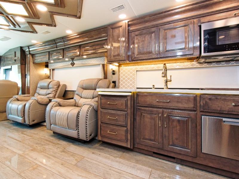 Inside, you'll find handcrafted hardwood cabinetry, solid surface countertops, high-gloss porcelain tile flooring, and dimmable LED accent lighting—all designed to elevate your travel lifestyle.