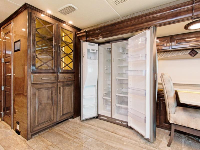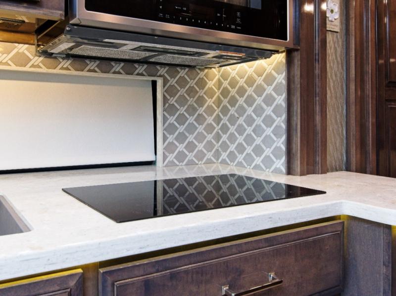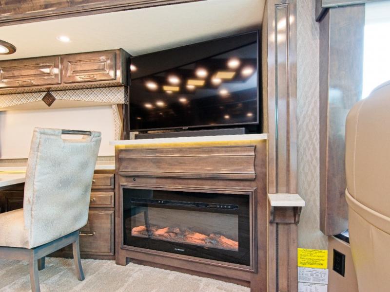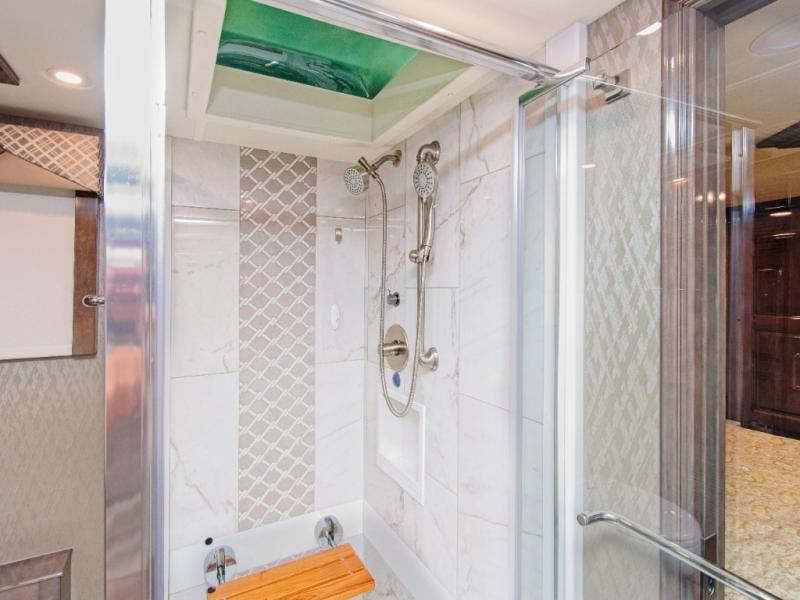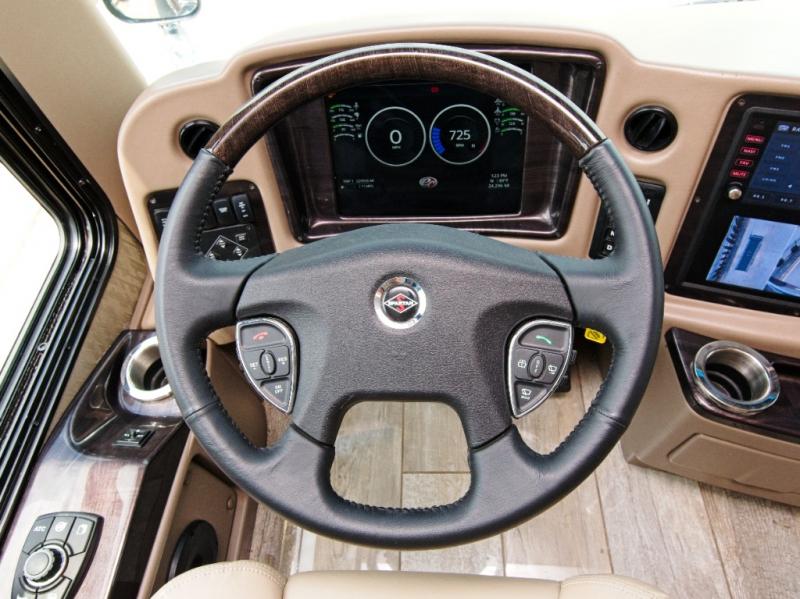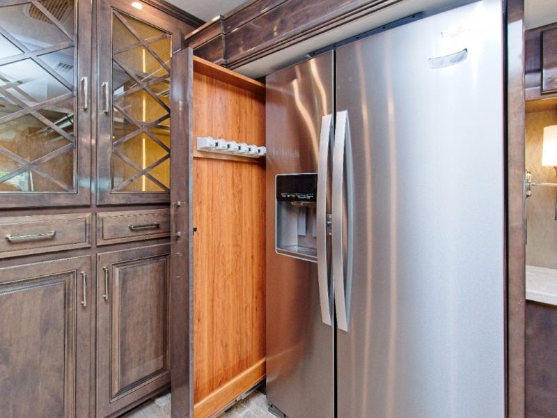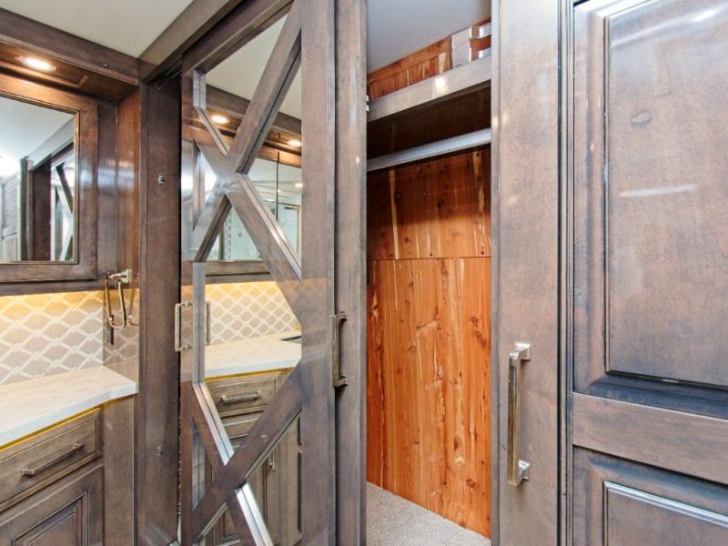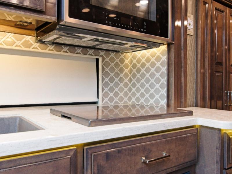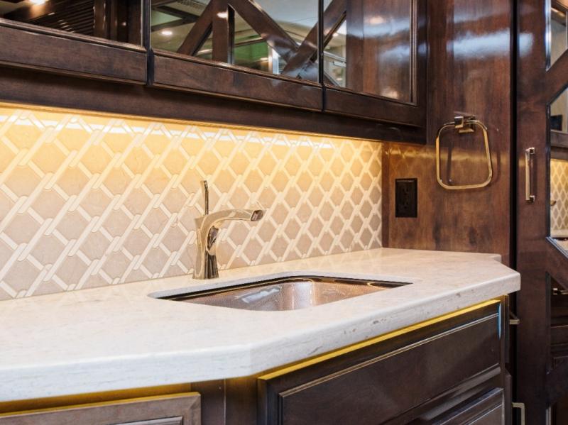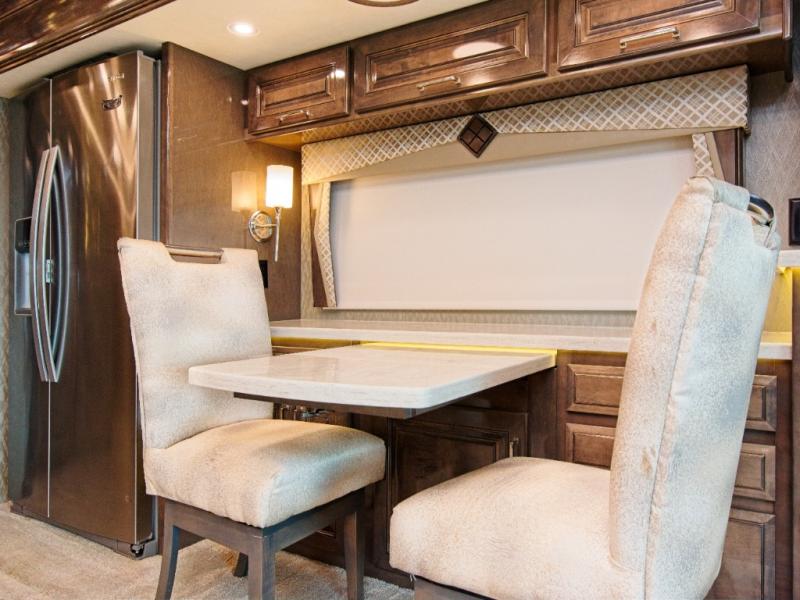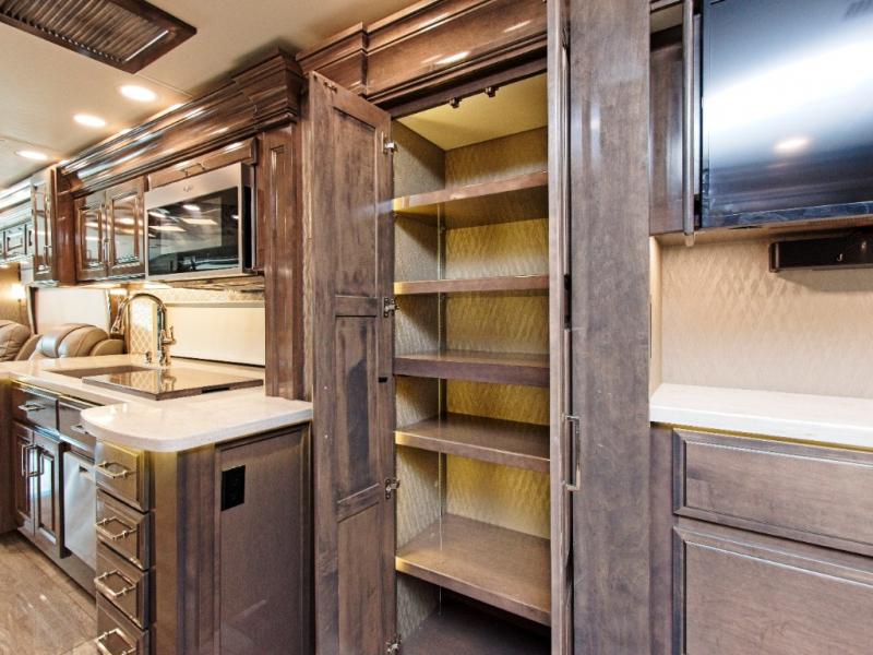 Inside, you'll find handcrafted hardwood cabinetry, solid surface countertops, high-gloss porcelain tile flooring, and dimmable LED accent lighting—all designed to elevate your travel lifestyle.