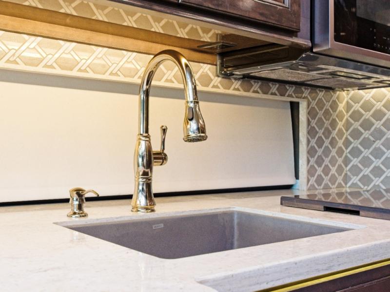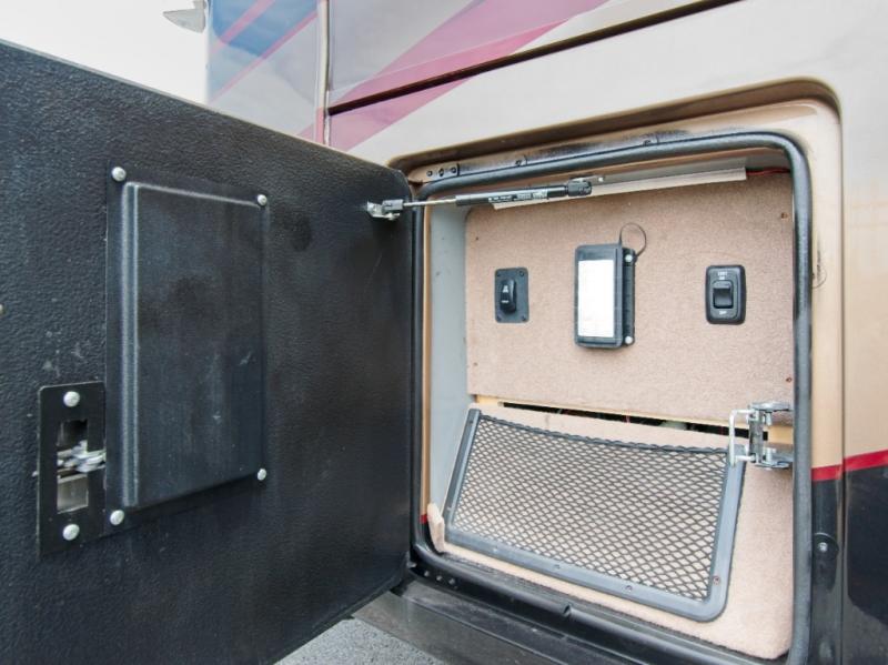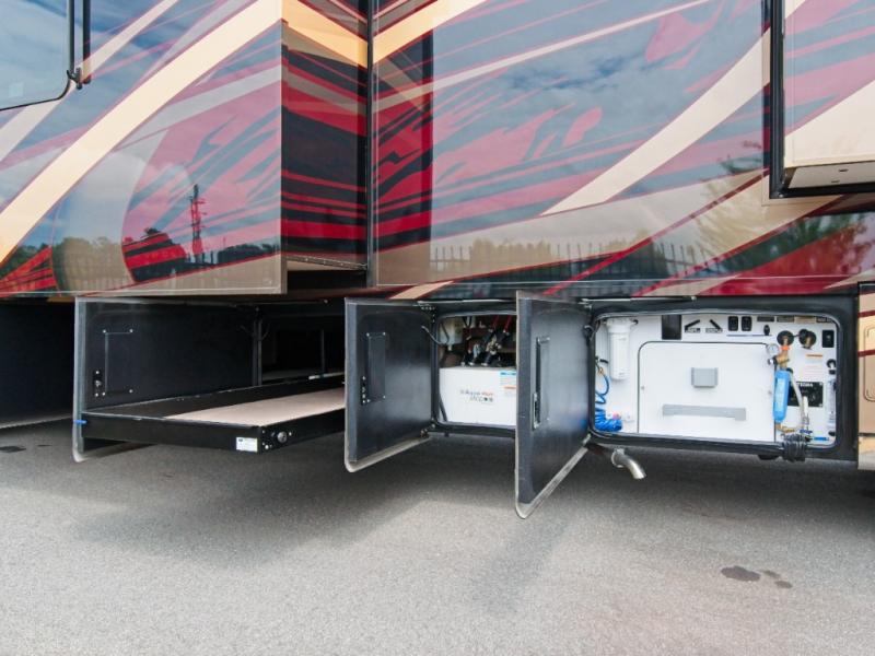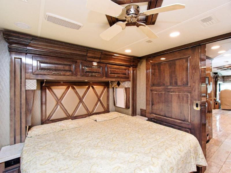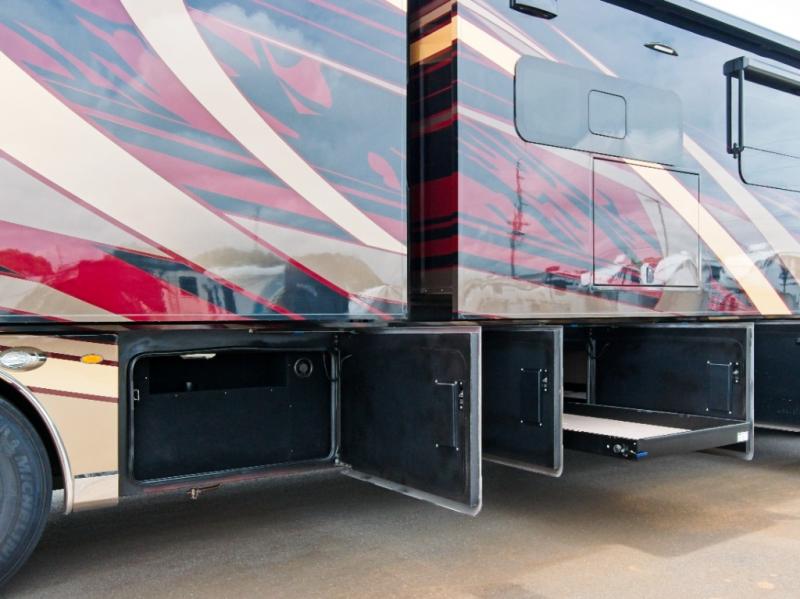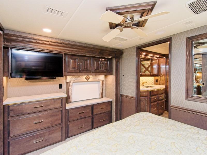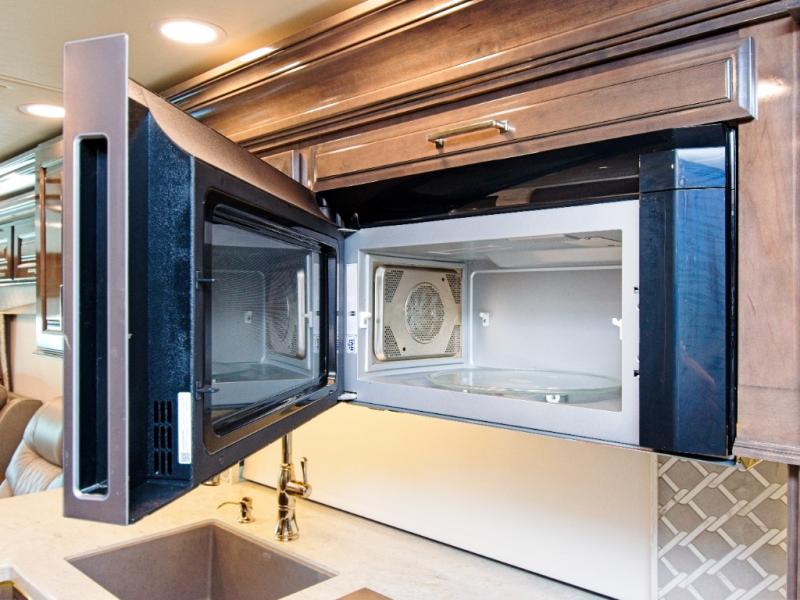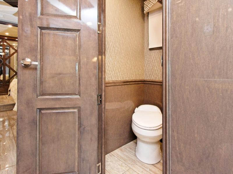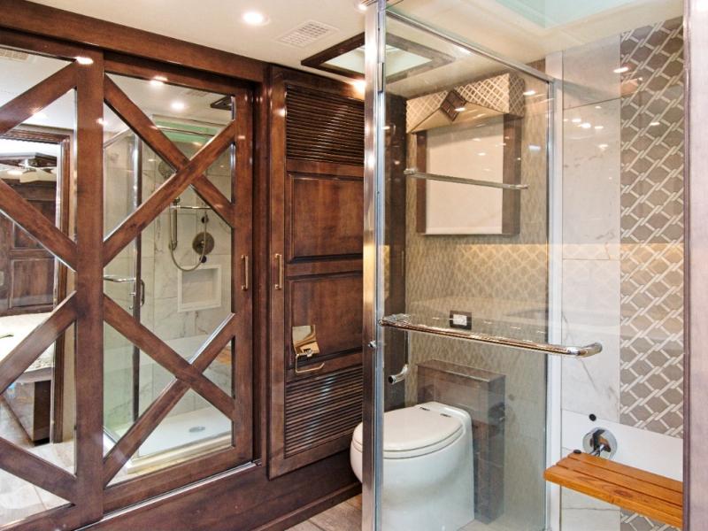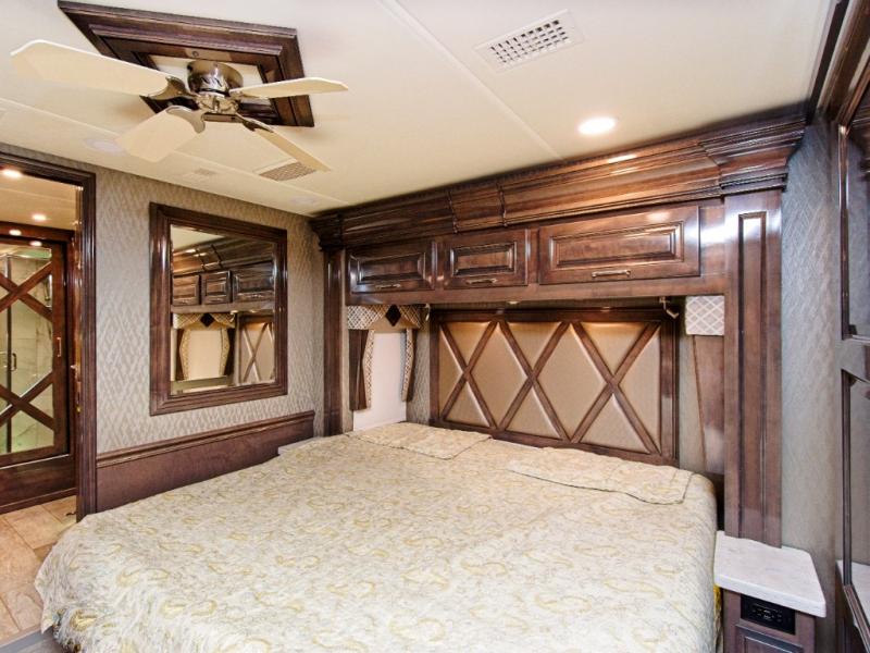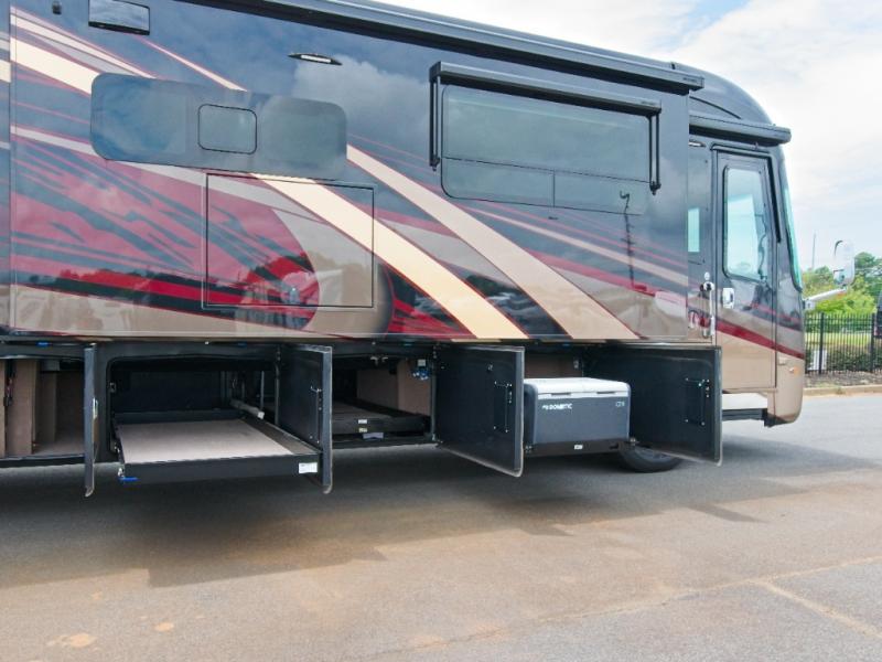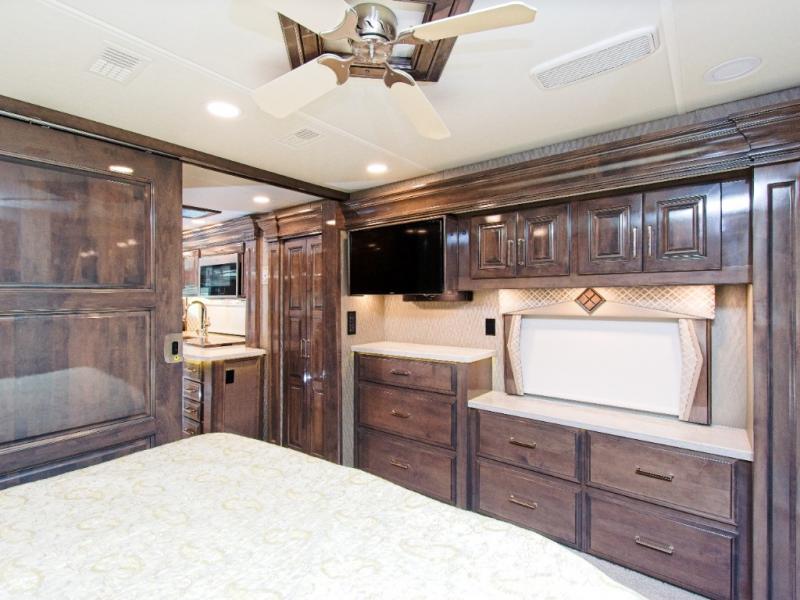Inside, you'll find handcrafted hardwood cabinetry, solid surface countertops, high-gloss porcelain tile flooring, and dimmable LED accent lighting—all designed to elevate your travel lifestyle.
