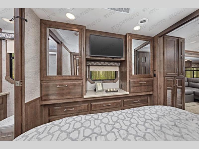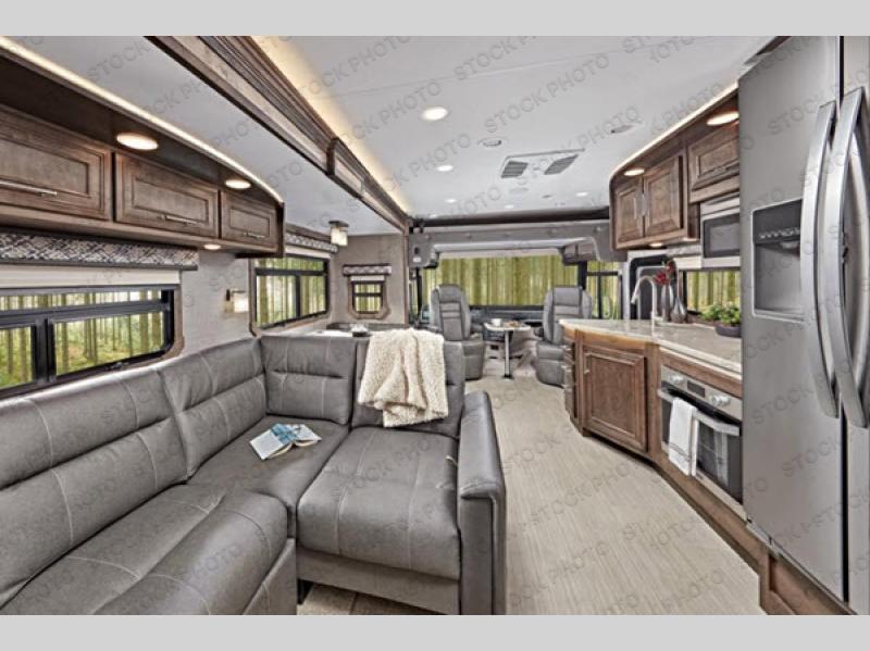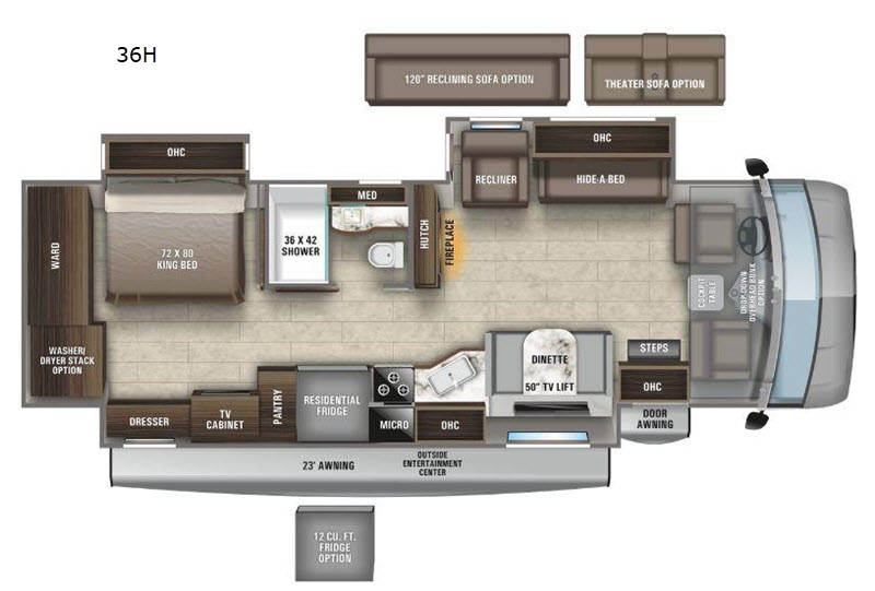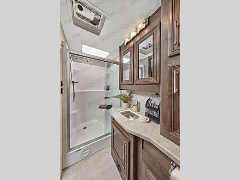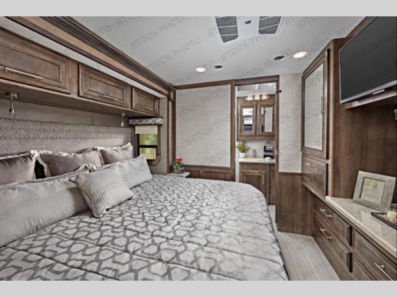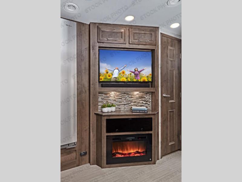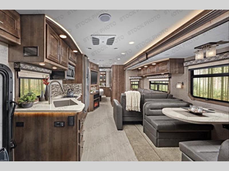 Travel across the country in this spacious motorhome. The swivel captain's seats with 6-way power will provide comfort, and the triple slides allow your crew to walk about freely once you reach your destination. Relax on the hide-a-bed sofa or the recliner to watch a movie on the 50" TV lift, or you may want to play a game of cards at the booth dinette. The full bath features a once-piece fiberglass shower, a skylight, and a light that will allow you to freshen up each day. You will feel right at home in the rear bedroom that includes a king bed with a bedspread, a large wardrobe, plus your own LED TV!