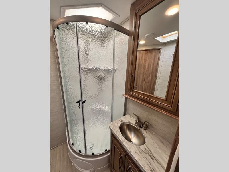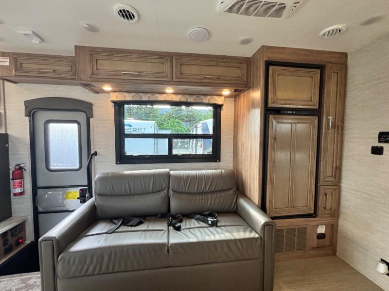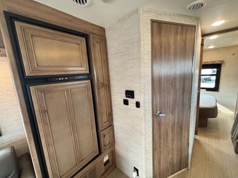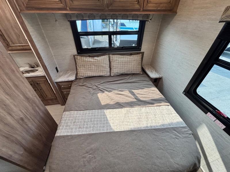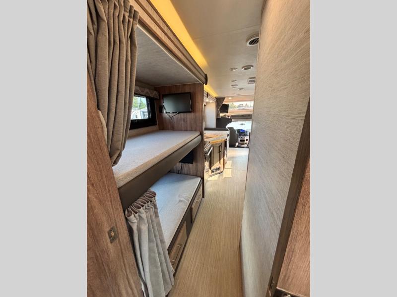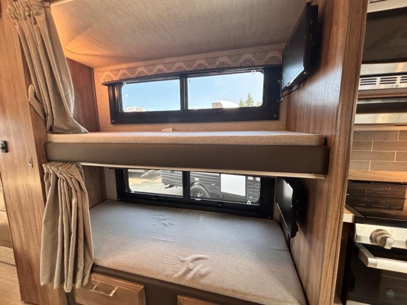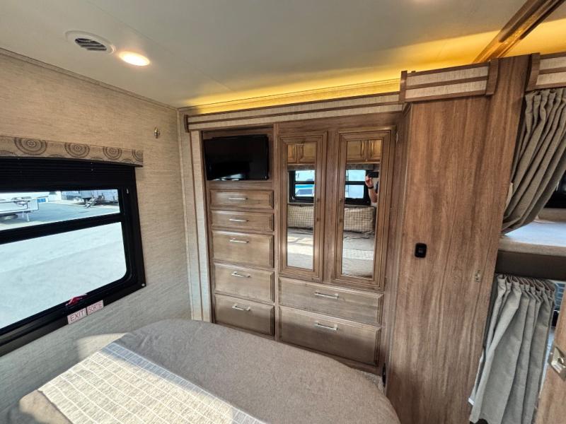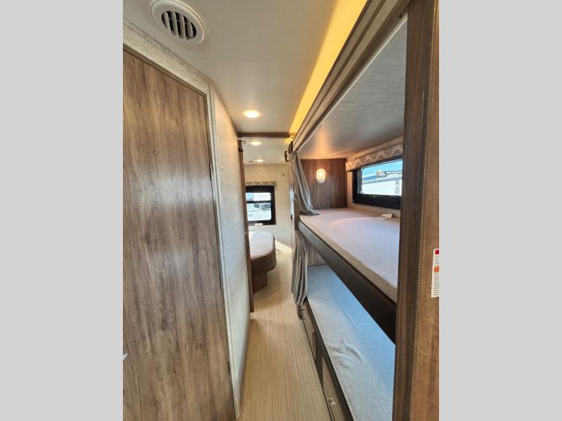 Traveling with family has never been easier than in this motorhome that includes bunk beds, plus a cab-over bunk. The full-wall slide will allow you to move around comfortably once you arrive at your destination, and you'll find seating space on the sofa and booth dinette. Let the chef of the family prepare lunch on the Furrion all-in-one cooktop, then take your plate to sit under the 18' power awning with LED lights.The dual entry bath is both spacious and convenient since you and your spouse will have easy access from the rear bedroom, and your guests can use the hallway entrance.