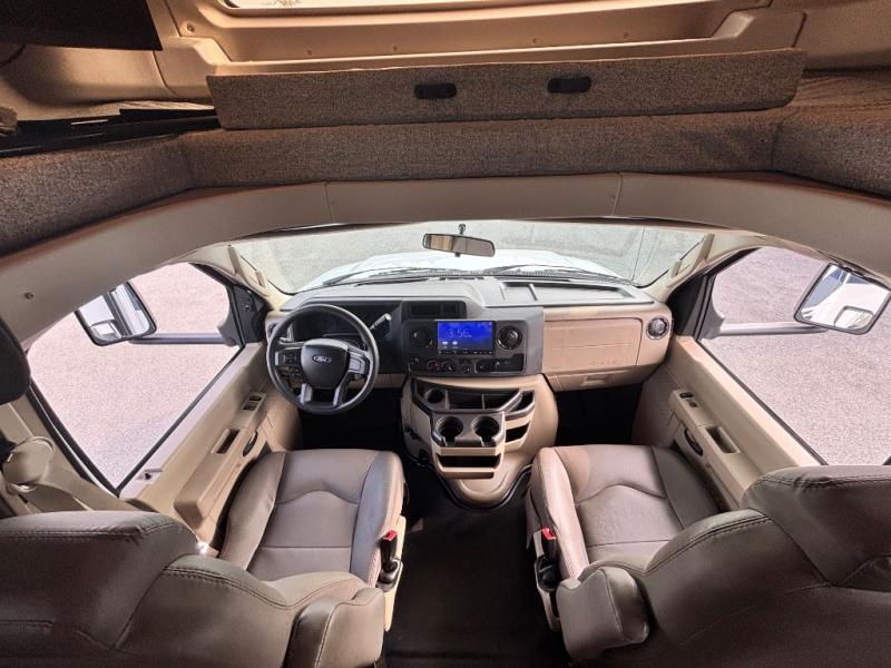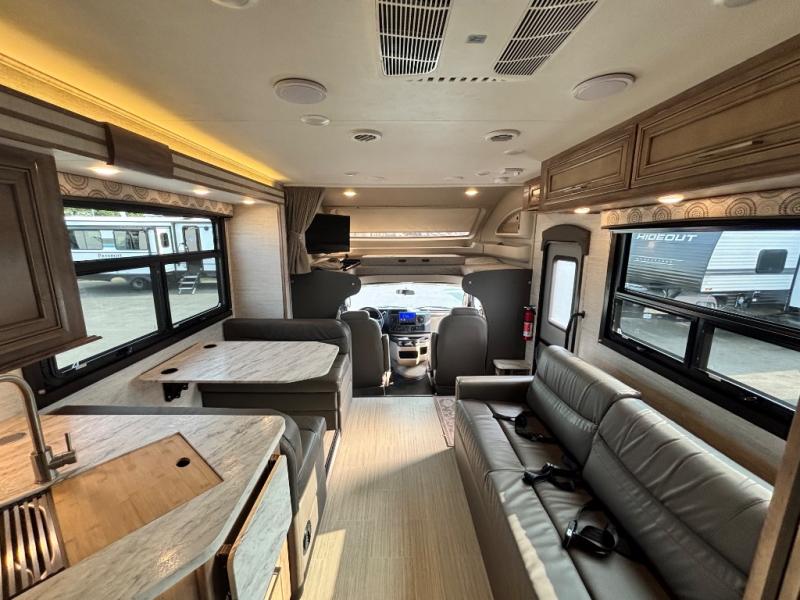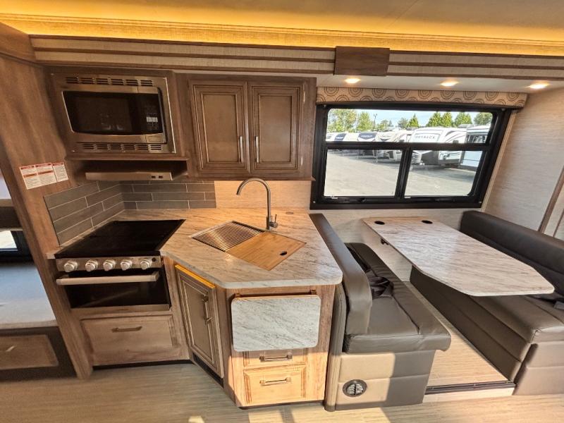 With any Odyssey Class C gas motorhome you will enjoy convenient and at-home features for a one-of-a-kind traveling experience. The kitchen includes decorative backsplash, LED-lit pressed countertops, plus a pop-up charging station with 110v outlets and USB plugs for your tablet or phone. You'll find an LED HDTV in the living area, as well as an interior command center to control your units functions with ease. Outside, the electric awning with LED lights and two high-output marine-grade exterior speakers will create an outdoor living space you are sure to love, and you can fill the dogs water bowl up with the outside shower. The Odyssey also features E-Z Drive, which includes a computer-balanced driveshaft, rubber isolation body mounts, Hellwig helper springs, plus more to provide a smooth ride across the country!