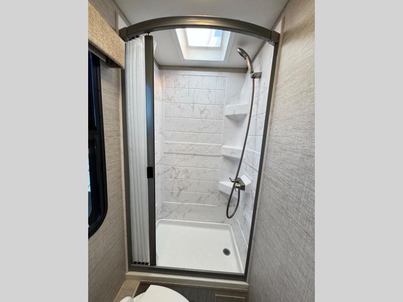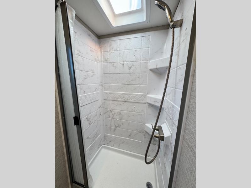 This spacious and comfortable coach is for any trip you take whether it is a long or short haul! From the front seats that swivel to the walk-around queen bed and the full-wall slide out giving you plenty of floor space to move about, there is something to love each trip. You can whip up meals using the convection microwave or two-burner drop-in cooktop, and store leftovers in the 6 cu. ft. gas/electric/12V refrigerator. Everyone can dine at the U-shaped dinette and this furniture provides sleeping space as well as the cab-over bunk. However, you might decide to get the theater seat option and B+ front cap option, the choice is yours. And don't forget about the 14' armless patio awning offering an outdoor living area, and the coach has been prepped for a satellite dish and solar.