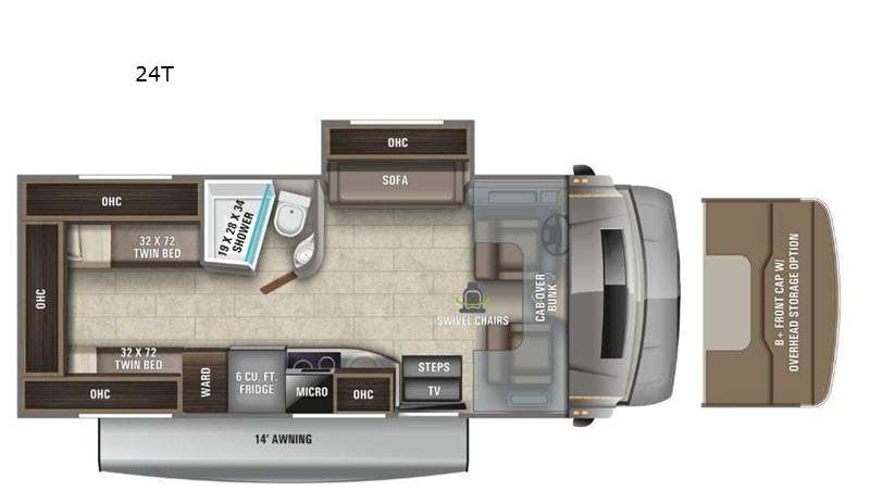You and your spouse will love the space provided in between the rear twin beds as you load up your belongings in the overhead cabinets and easily access the full bathroom at night. The sofa slide offers a space to relax and watch the LED TV as well as a guest can sleep here. The cab-over bunk provides two more sleeping spaces or choose the B+ front cap option if that isn't needed. And someone can make their famous camping meals using the convection microwave or two-burner drop-in cooktop, and store leftovers in the 6 cu. ft. refrigerator.
