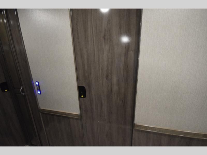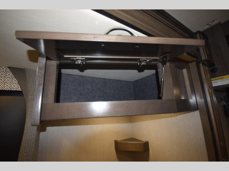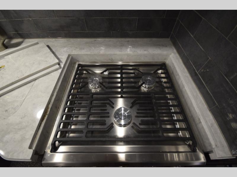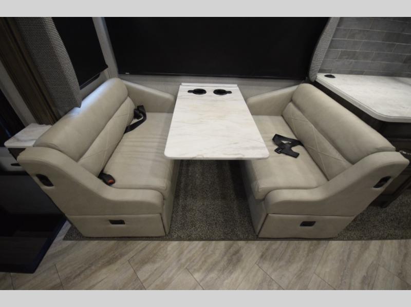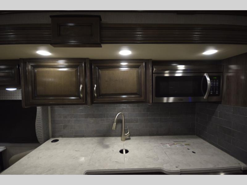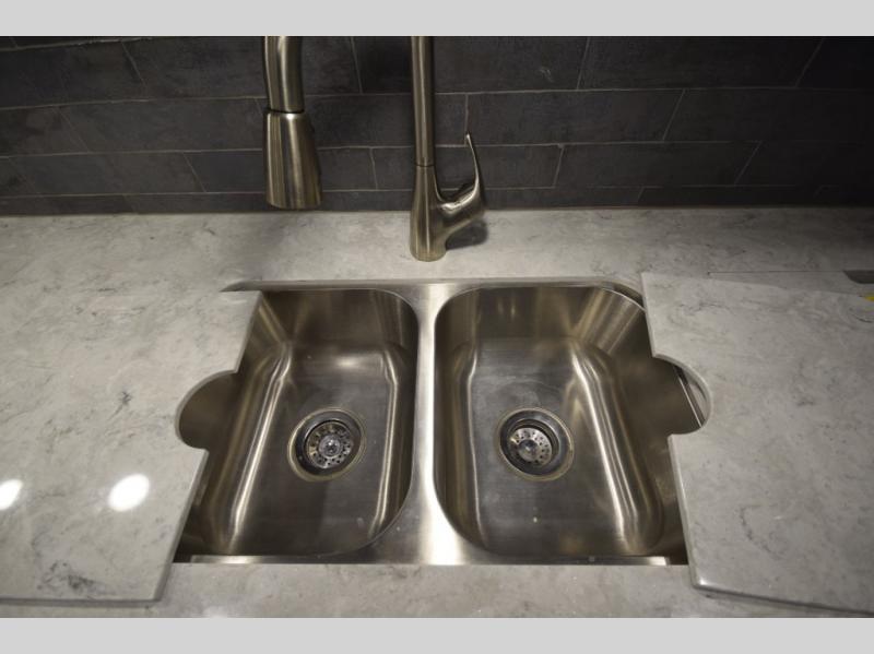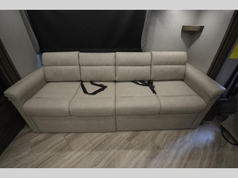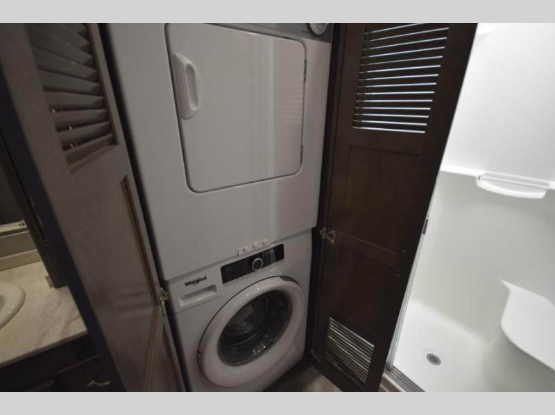 Whether you're cruising cross-country or relaxing at your favorite campsite, you'll love the convenience of a stackable washer and dryer, a fully equipped kitchen with convection microwave, and a plush 98" sofa sleeper for unwinding after the day’s journey. The cab workstation lets you stay connected on the go — perfect for digital nomads or trip planning pros.
