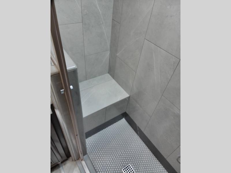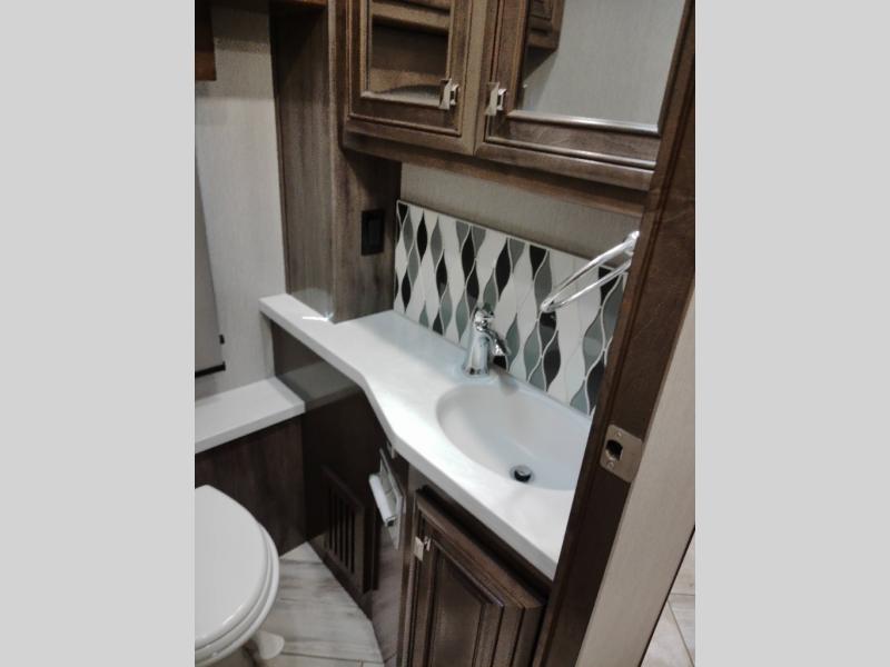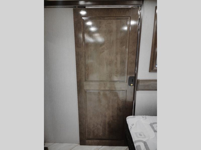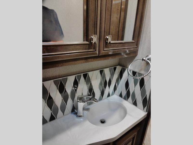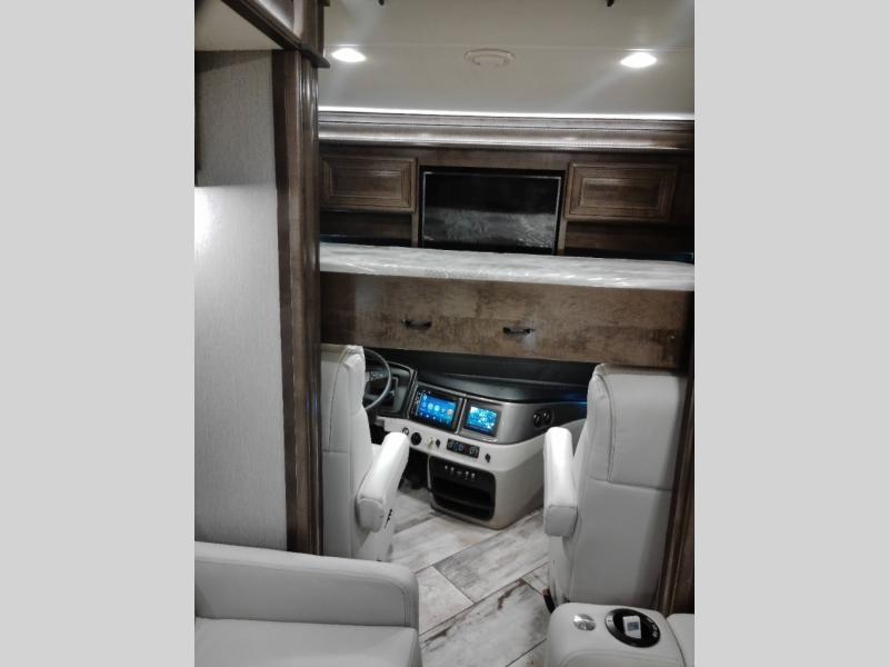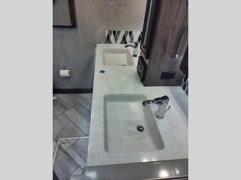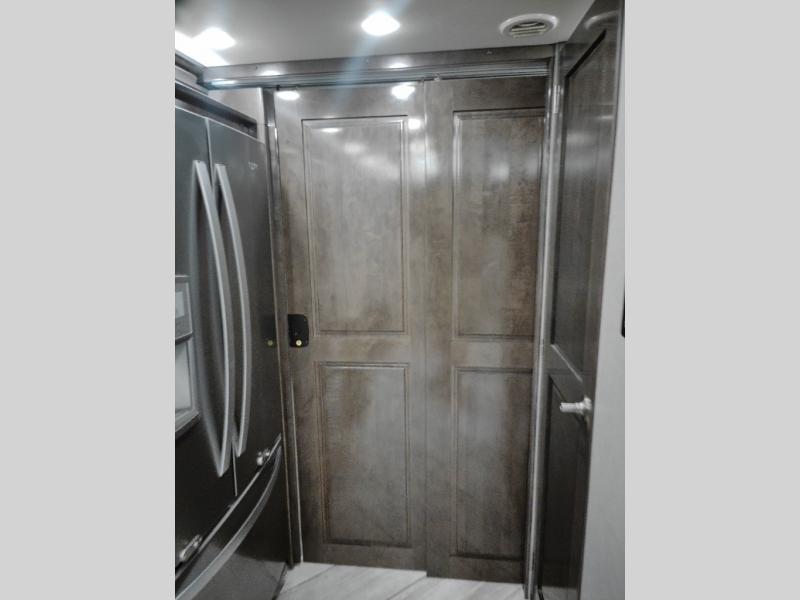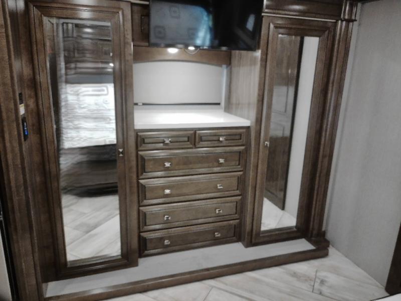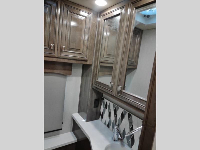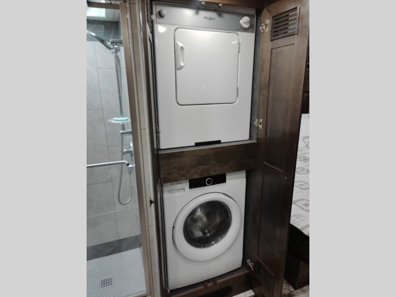 This large master suite model offers a walk-around king bed, plus lots of storage in the wardrobes and dresser on the opposite side, and a 32" LED TV to watch before bedtime. Easily access the full bathroom with with two sinks and a seated tile shower, plus there is a stackable washer and dryer to keep everything clean while you're away. The 6-way power driver and passenger seats, the Apex booth dinette, the sofa sleeper with pull-out full bed and the loveseat give you plenty of seating to entertain and visit with your RVing friends and family. The cook will love the upgraded kitchen amenities, and the fireplace is a nice touch. You can even add more features, just choose from the optional 25th Anniversary Edition that includes the Technology package, a power drop-down Hide-A-Loft overhead bunk for additional sleeping space, and more!