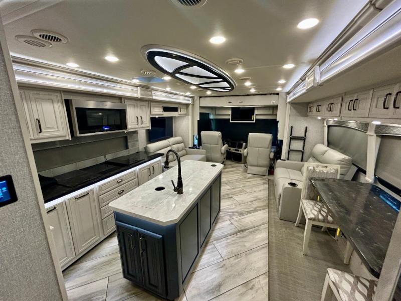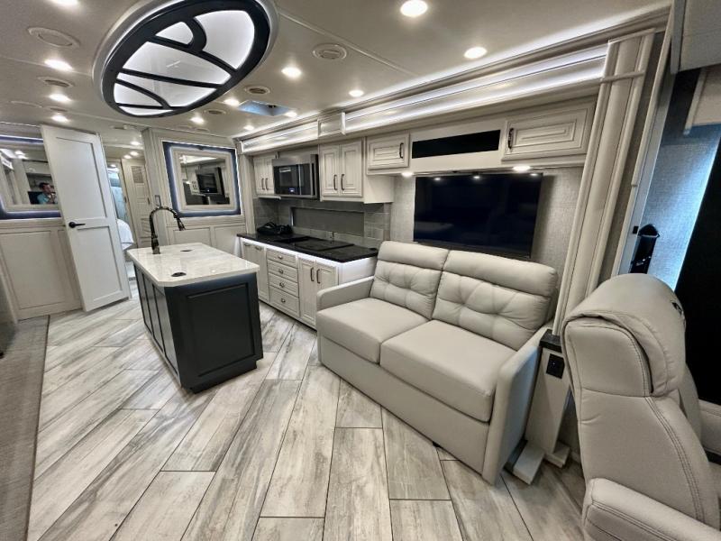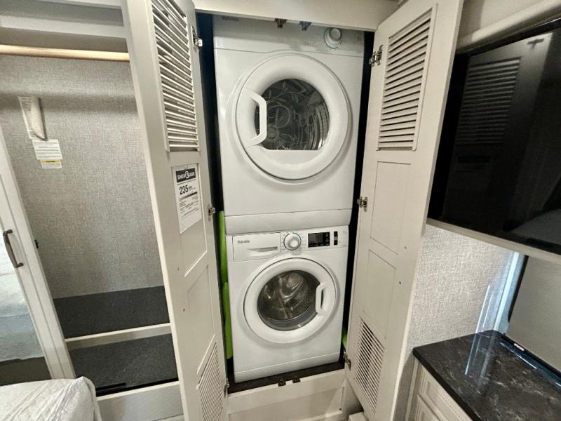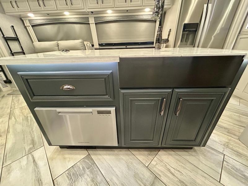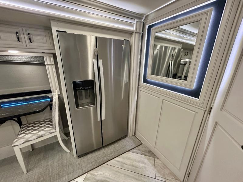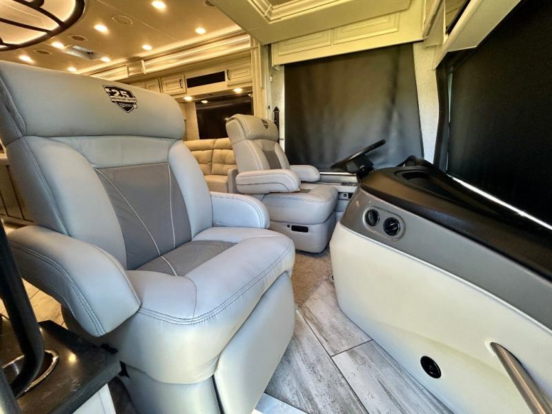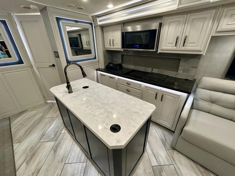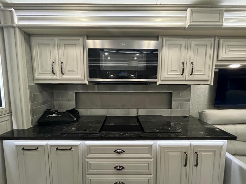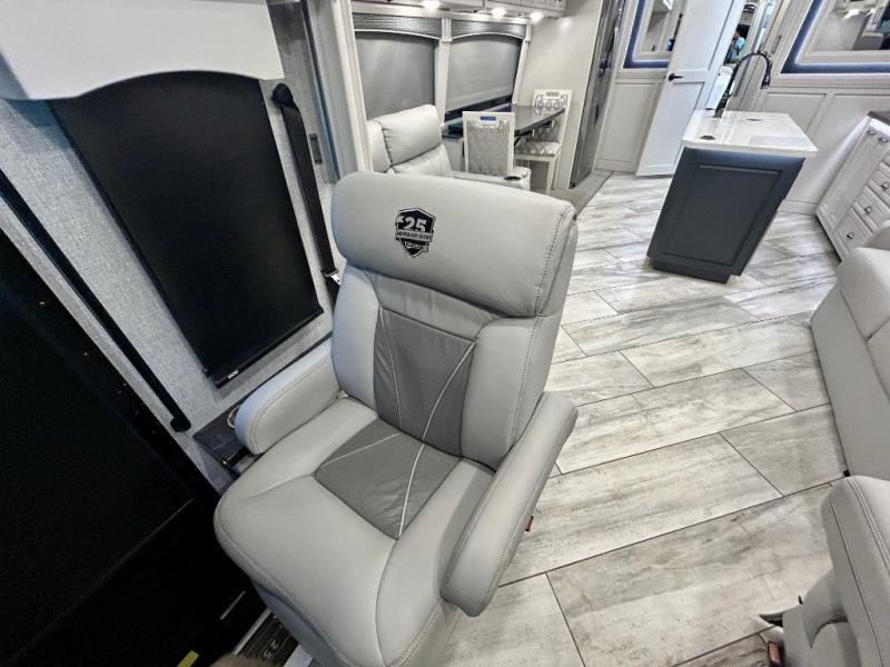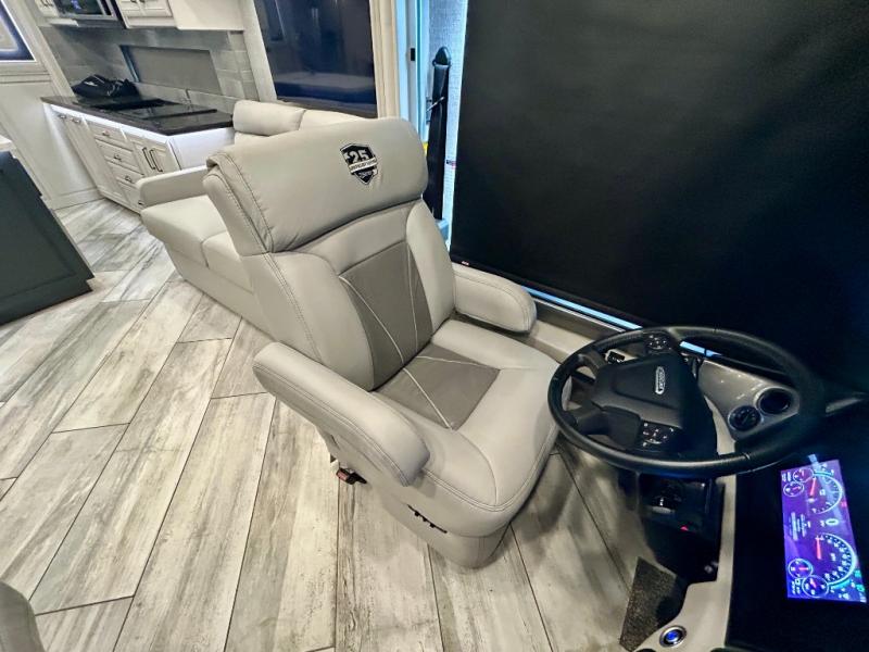 A couple or family can enjoy traveling to far away places or local RV resorts in this coach with residential features found throughout. The chef will love the kitchen with its residential refrigerator including ice and water dispenser in the door, the dishwasher near the sink on the island, and the convection microwave over the induction cooktop. You can dine at the adap"table" dinette that offers versatile seating to enjoy the panoramic window view and converts to a dinette table when more seating is needed, or while sitting on the 60" sofa with a drawer for storage or the 60" sofa sleeper with a pull-out twin bed. And there is plenty of inside entertainment with three TVs. The master bedroom includes a stackable washer/dryer to keep the linens clean, and a full-length wardrobe to keep your clothes wrinkle-free. You can also choose the optional 25th Anniversary Edition that comes with optional items such as, an exterior freezer, blind spot detection, the Technology Package, and more!