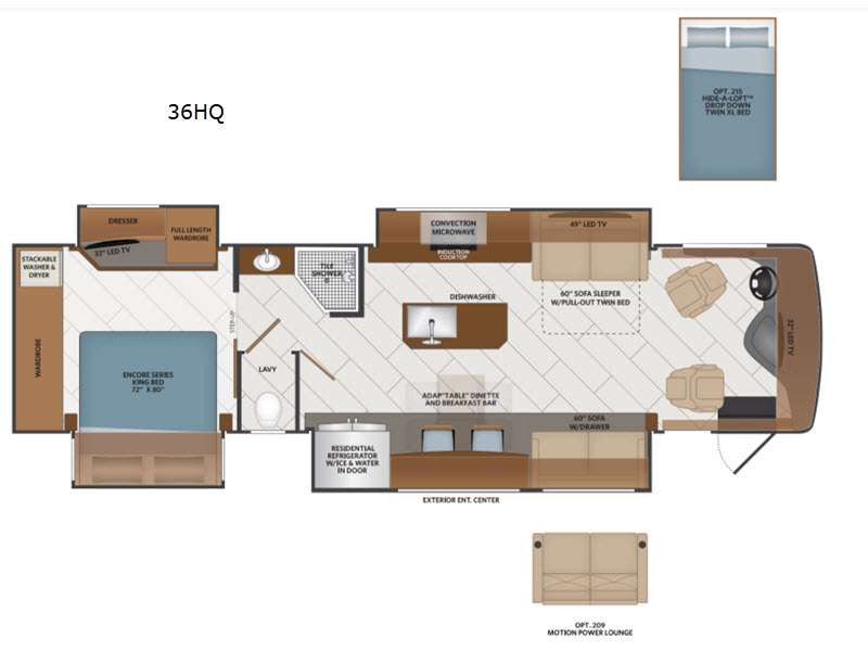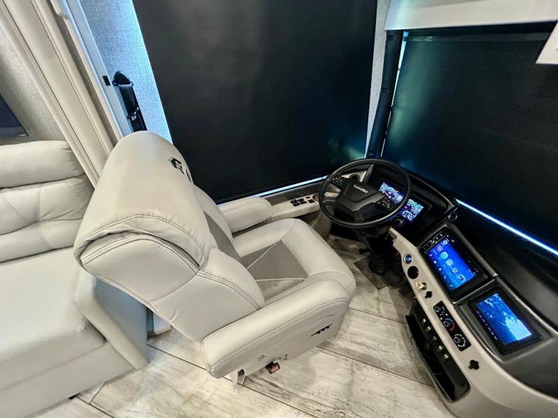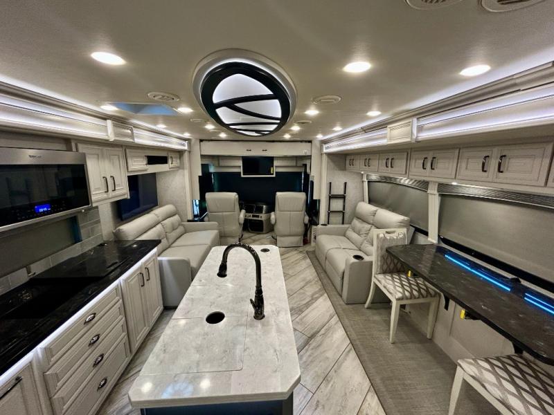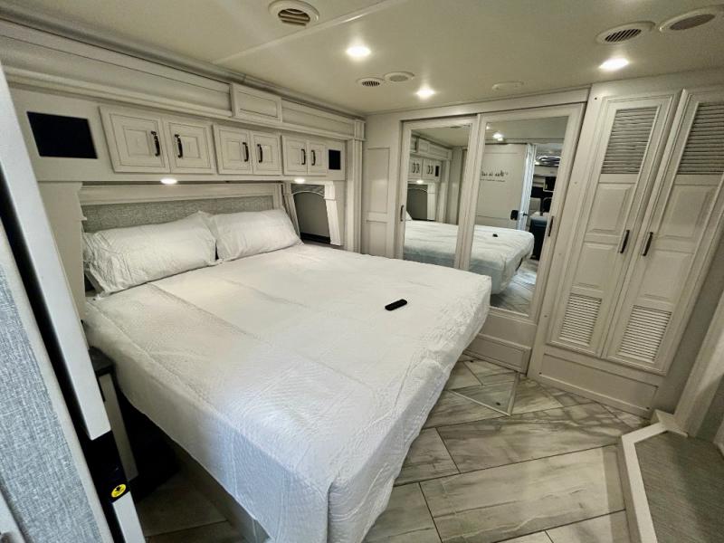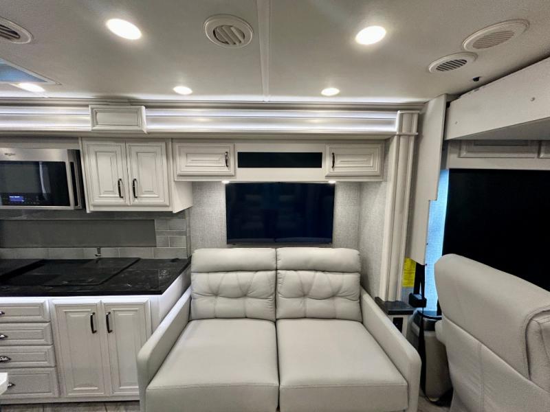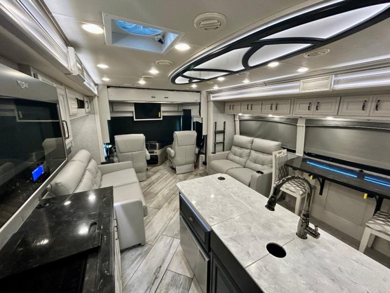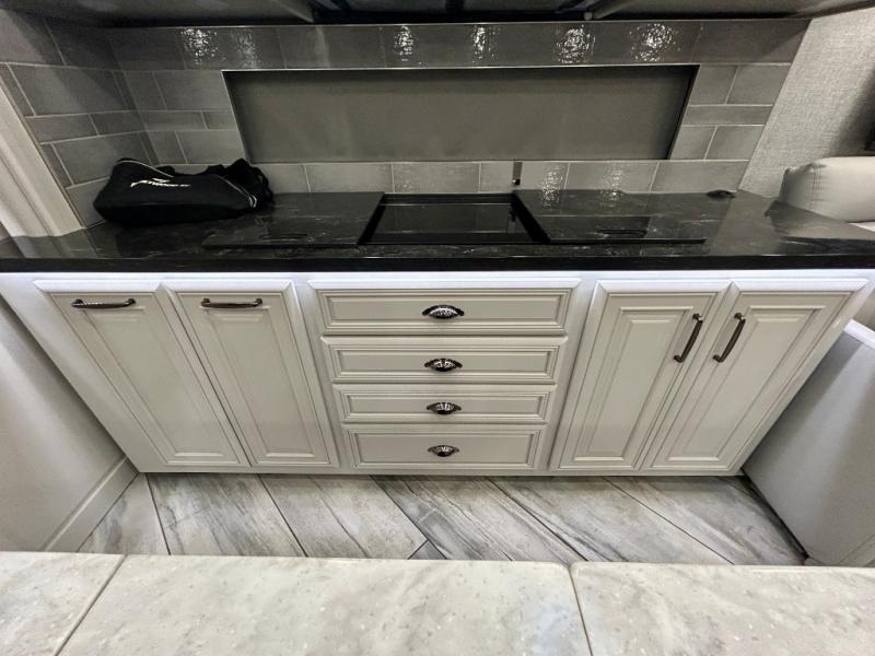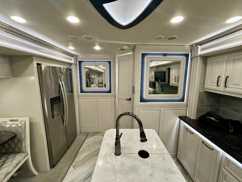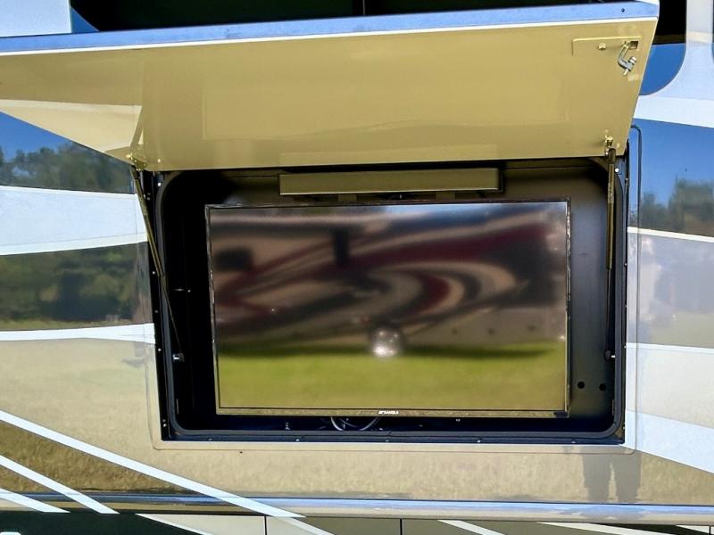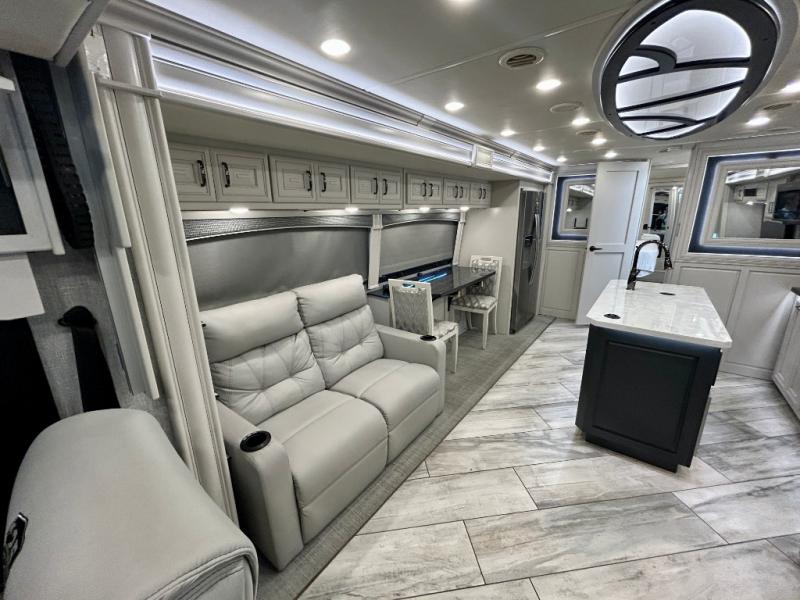 A couple or family can enjoy traveling to far away places or local RV resorts in this coach with residential features found throughout. The chef will love the kitchen with its residential refrigerator including ice and water dispenser in the door, the dishwasher near the sink on the island, and the convection microwave over the induction cooktop. You can dine at the adap"table" dinette that offers versatile seating to enjoy the panoramic window view and converts to a dinette table when more seating is needed, or while sitting on the 60" sofa with a drawer for storage or the 60" sofa sleeper with a pull-out twin bed. And there is plenty of inside entertainment with three TVs. The master bedroom includes a stackable washer/dryer to keep the linens clean, and a full-length wardrobe to keep your clothes wrinkle-free. You can also choose the optional 25th Anniversary Edition that comes with optional items such as, an exterior freezer, blind spot detection, the Technology Package, and more!