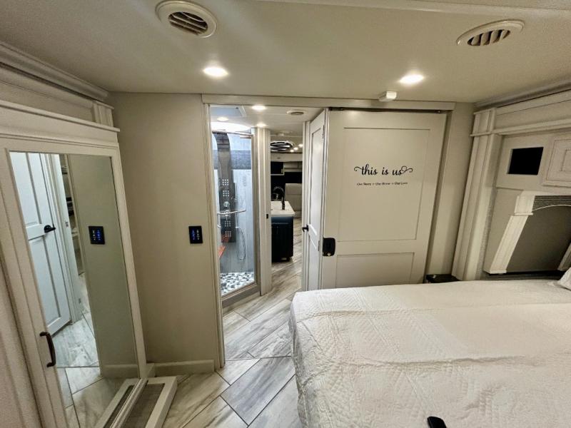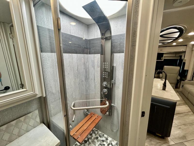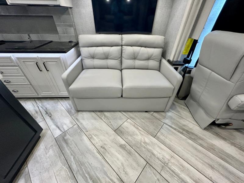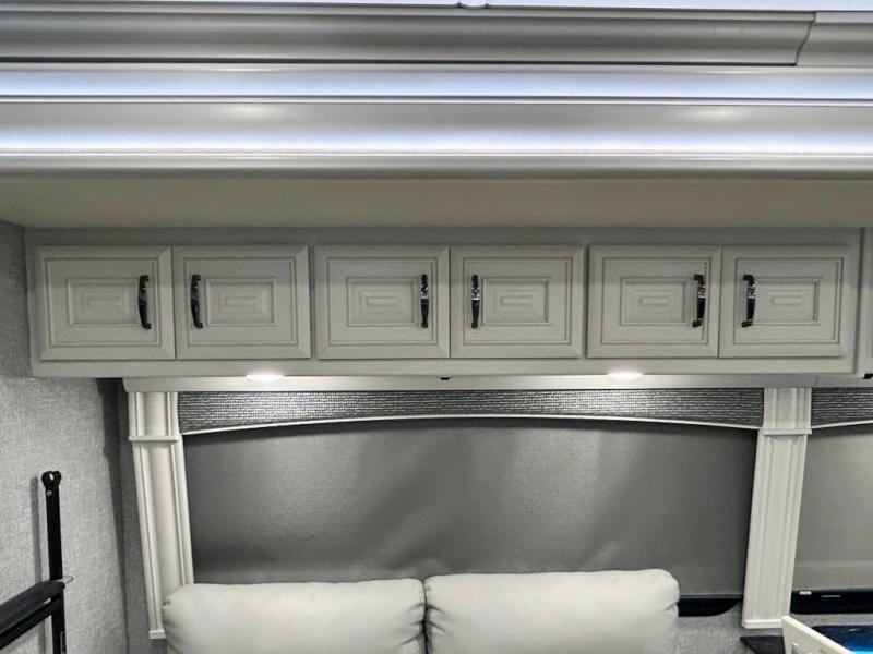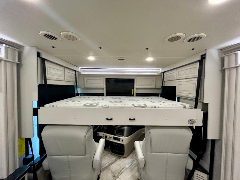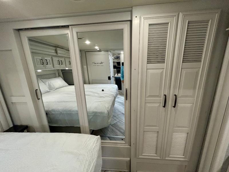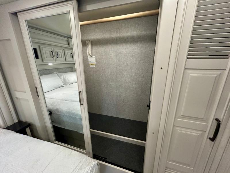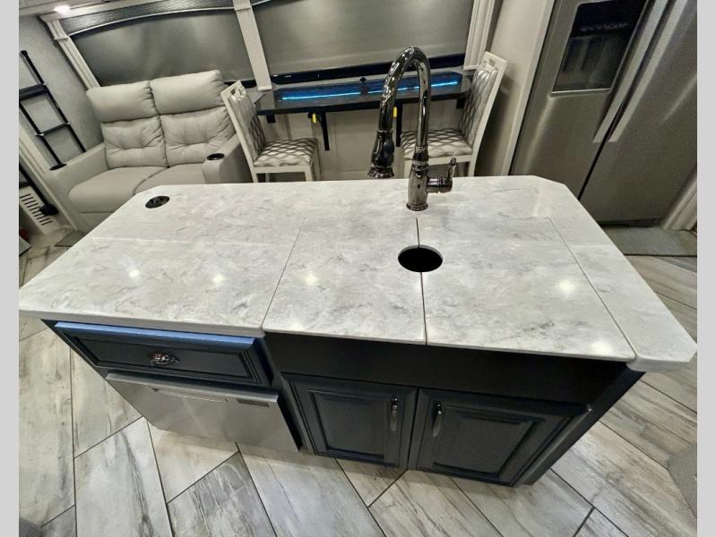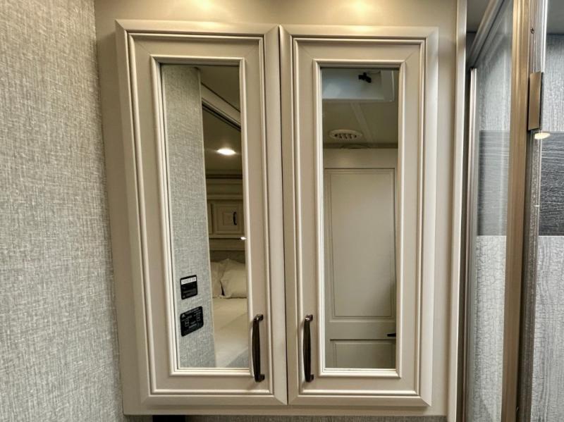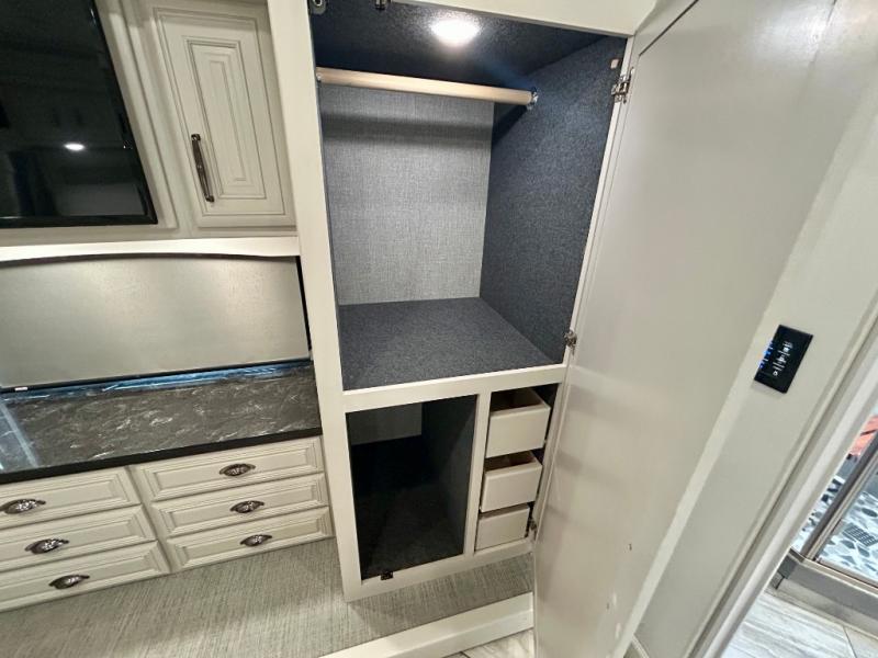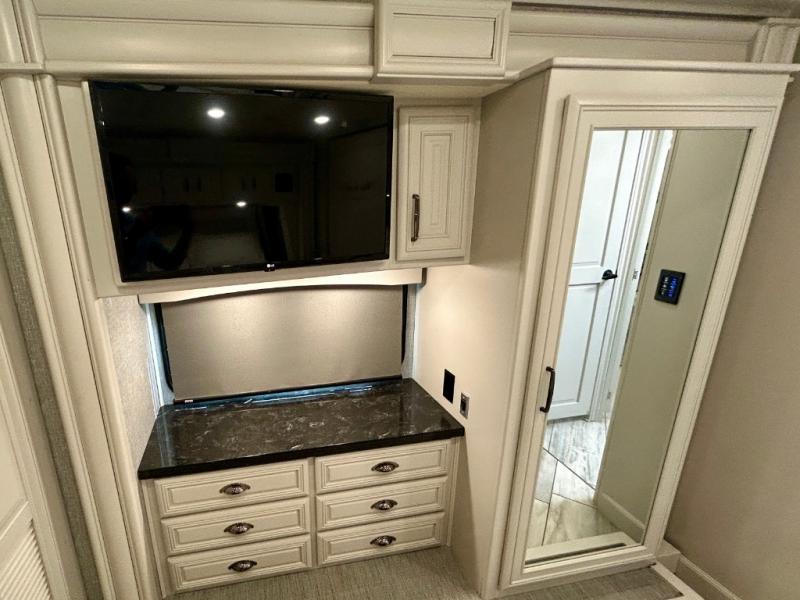 A couple or family can enjoy traveling to far away places or local RV resorts in this coach with residential features found throughout. The chef will love the kitchen with its residential refrigerator including ice and water dispenser in the door, the dishwasher near the sink on the island, and the convection microwave over the induction cooktop. You can dine at the adap"table" dinette that offers versatile seating to enjoy the panoramic window view and converts to a dinette table when more seating is needed, or while sitting on the 60" sofa with a drawer for storage or the 60" sofa sleeper with a pull-out twin bed. And there is plenty of inside entertainment with three TVs. The master bedroom includes a stackable washer/dryer to keep the linens clean, and a full-length wardrobe to keep your clothes wrinkle-free. You can also choose the optional 25th Anniversary Edition that comes with optional items such as, an exterior freezer, blind spot detection, the Technology Package, and more!