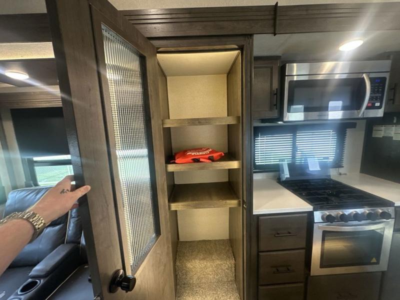 Getting ready in this Cardinal Limited fifth wheel will be easier than ever thanks to the double-sink vanity in the full bathroom! You can also enjoy having clean clothes when you add a washer/dryer to the space that has been prepped in the closet in the front private bedroom. There are many features in the kitchen that will make preparing your delicious meals easy, like the kitchen island, the microwave, the pull-out spice rack, and the walk-in pantry. There is also a hutch to store your dishes and a bench at the entrance so that you can sit down to take off your shoes. The rear living area is sure to be a crowd pleaser with comfortable features like the rear hide-a-bed sofa, the theater seating with cupholders, and the fireplace at the entertainment center!