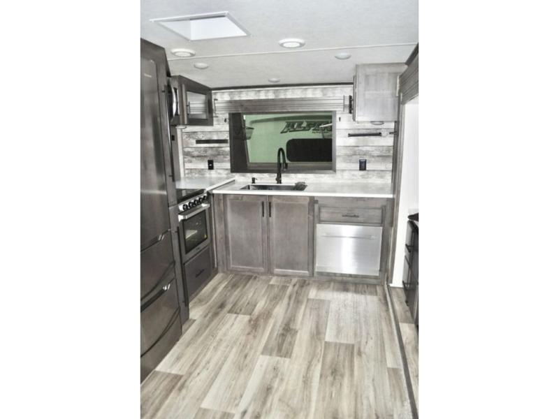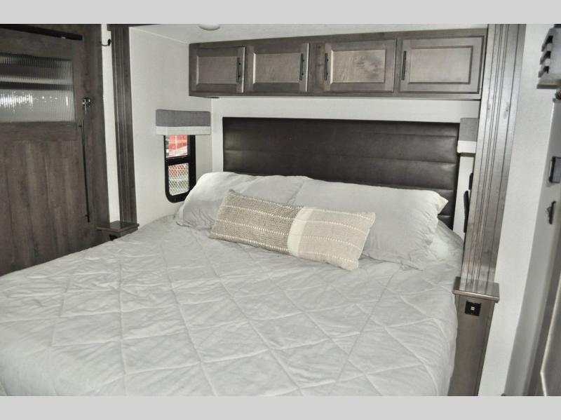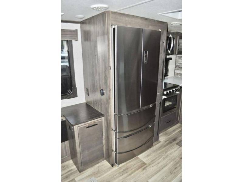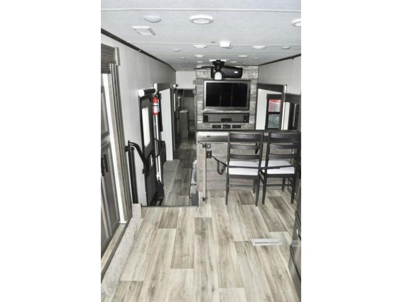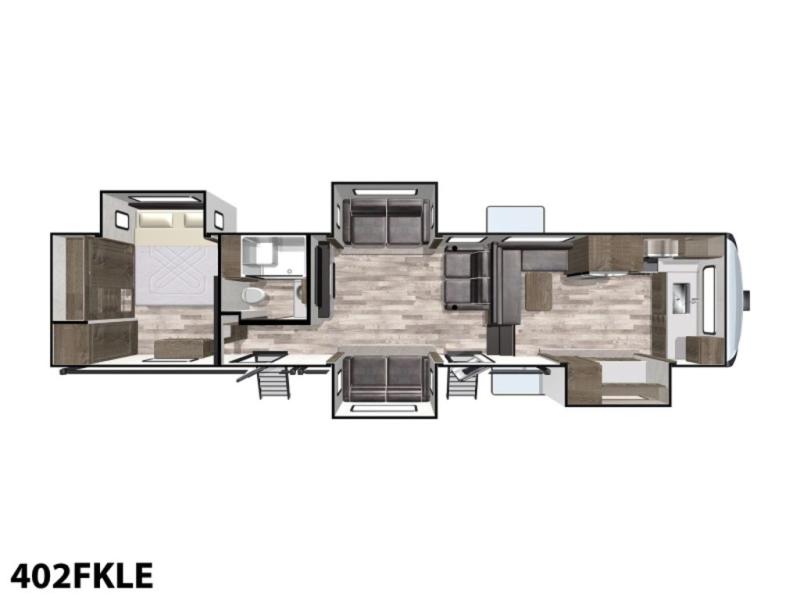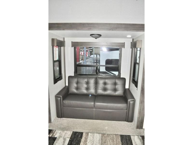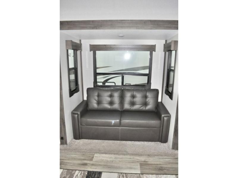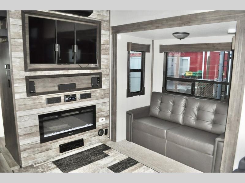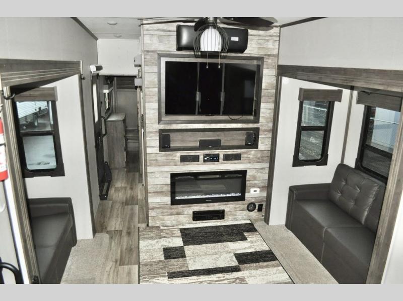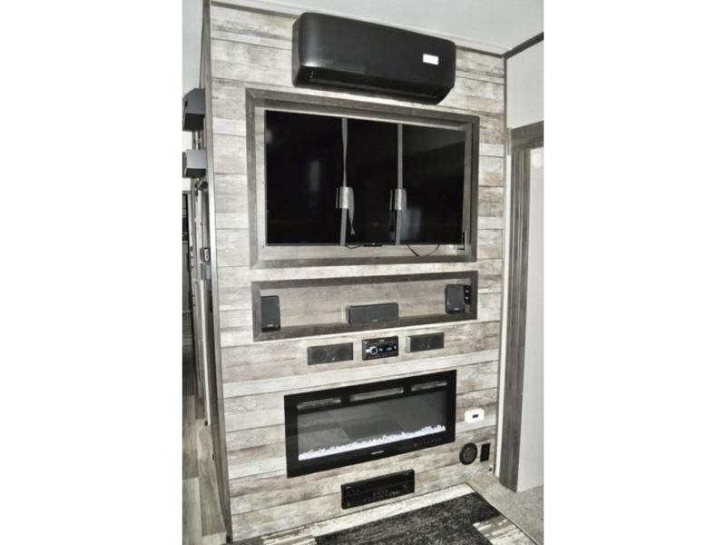 The front kitchen in this fifth wheel is elevated and huge with all of the appliances you will need to create delicious home cooked meals on your next camping trip! Once you're done eating you can head to the middle living area and relax on either one of the two sofas or the theater seating while you enjoy the 40" electric fireplace. The rear private bedroom is fit for a Queen with a Serta mattress, two bed side power outlets, and a full height hanging walk-in wardrobe. The full bathroom has everything you need to get squeaky clean each morning including a residential mega shower with an integrated seat and a skylight/dome above, a sliding, glass shower door, a residential sized wall mirror, and a heat and A/C duct!