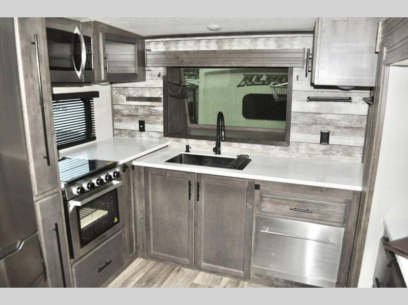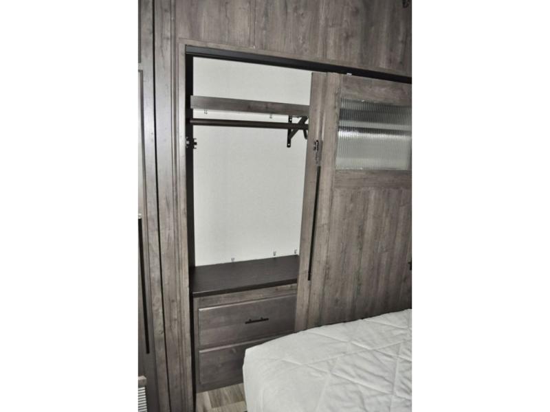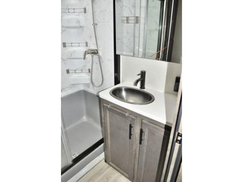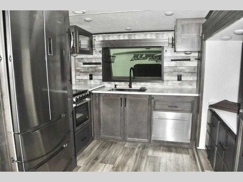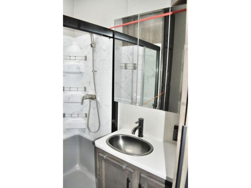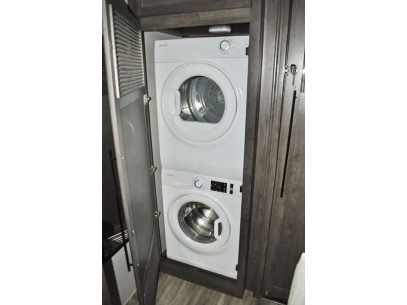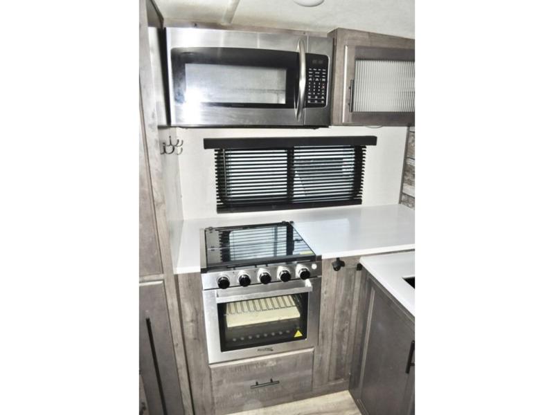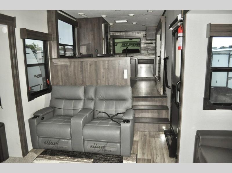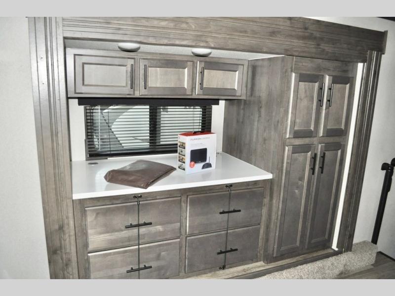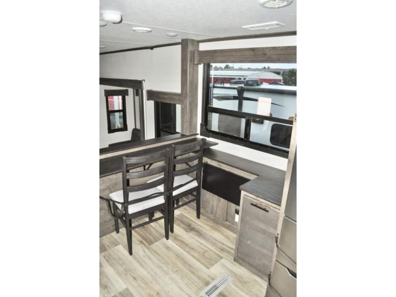 The front kitchen in this fifth wheel is elevated and huge with all of the appliances you will need to create delicious home cooked meals on your next camping trip! Once you're done eating you can head to the middle living area and relax on either one of the two sofas or the theater seating while you enjoy the 40" electric fireplace. The rear private bedroom is fit for a Queen with a Serta mattress, two bed side power outlets, and a full height hanging walk-in wardrobe. The full bathroom has everything you need to get squeaky clean each morning including a residential mega shower with an integrated seat and a skylight/dome above, a sliding, glass shower door, a residential sized wall mirror, and a heat and A/C duct!