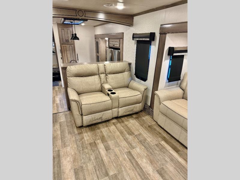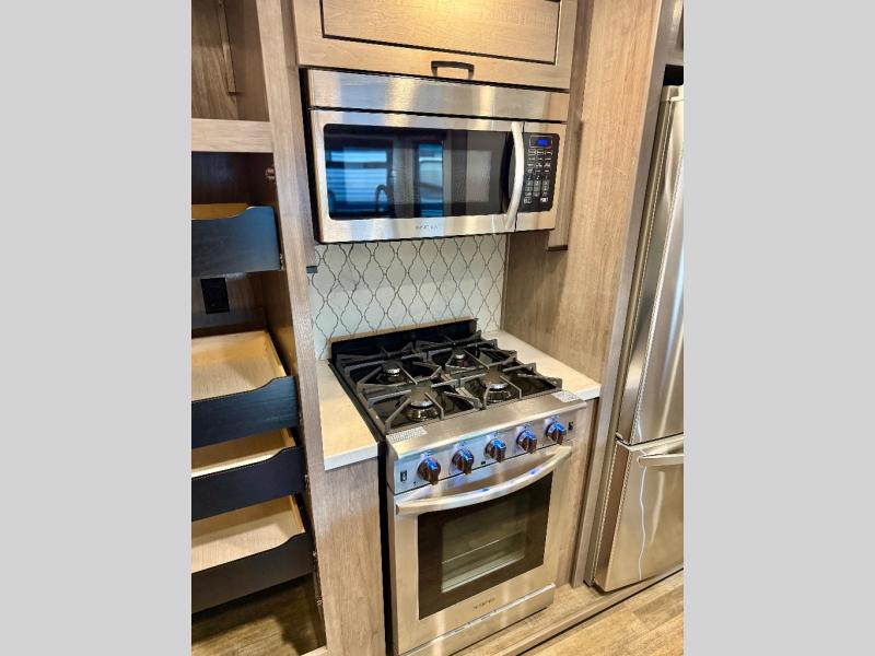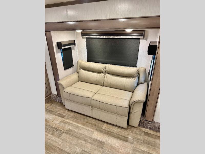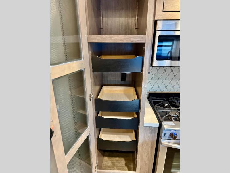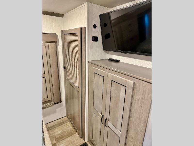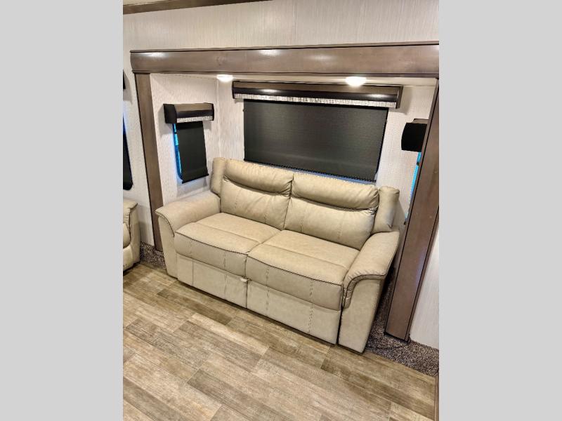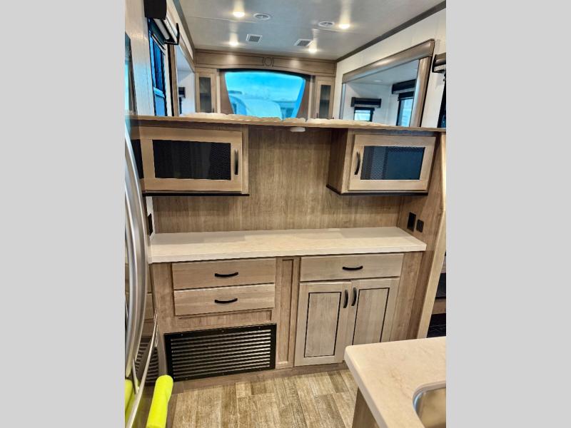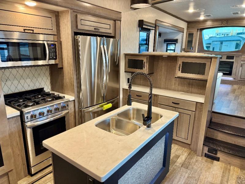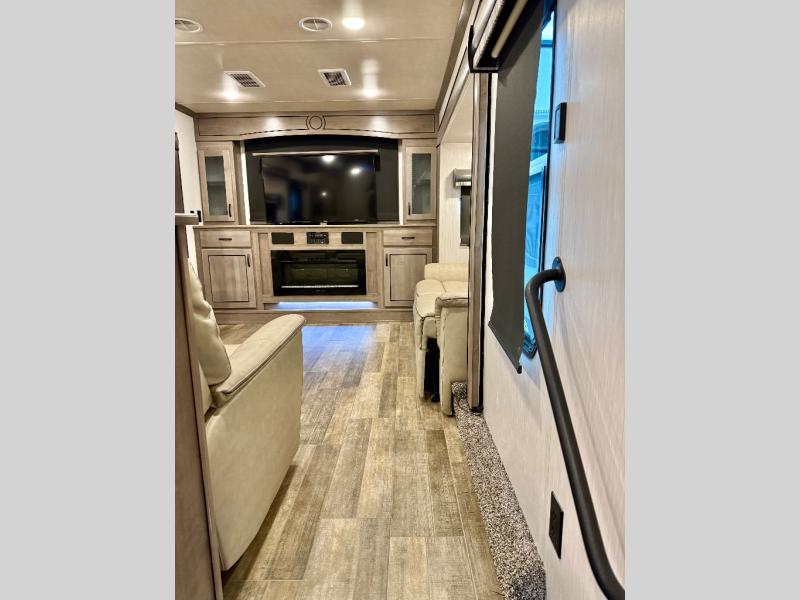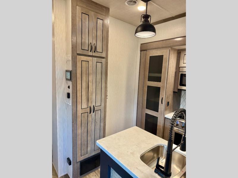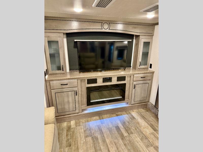 Load up your favorite off-road toys into this luxurious Cedar Creek toy hauler! Once you have unloaded the toys, you can relax on the rear queen bed and then put your clothes away in the wardrobe or sit on the bench with storage. The large kitchen pantry is big enough to store your favorite snacks, and the hutch is a great place to store your nice dishes. You can either prepare dinner indoors or at the outside kitchen with an entertainment center, and then you can head inside and enjoy it at the free-standing table. The front living area has opposing tri-fold sofas for extra sleeping spaces and power theater seating across from the entertainment center with a fireplace and a 50" TV above it. A couple other convenient features you can add are the optional washer and dryer and the optional dishwasher at the kitchen island!